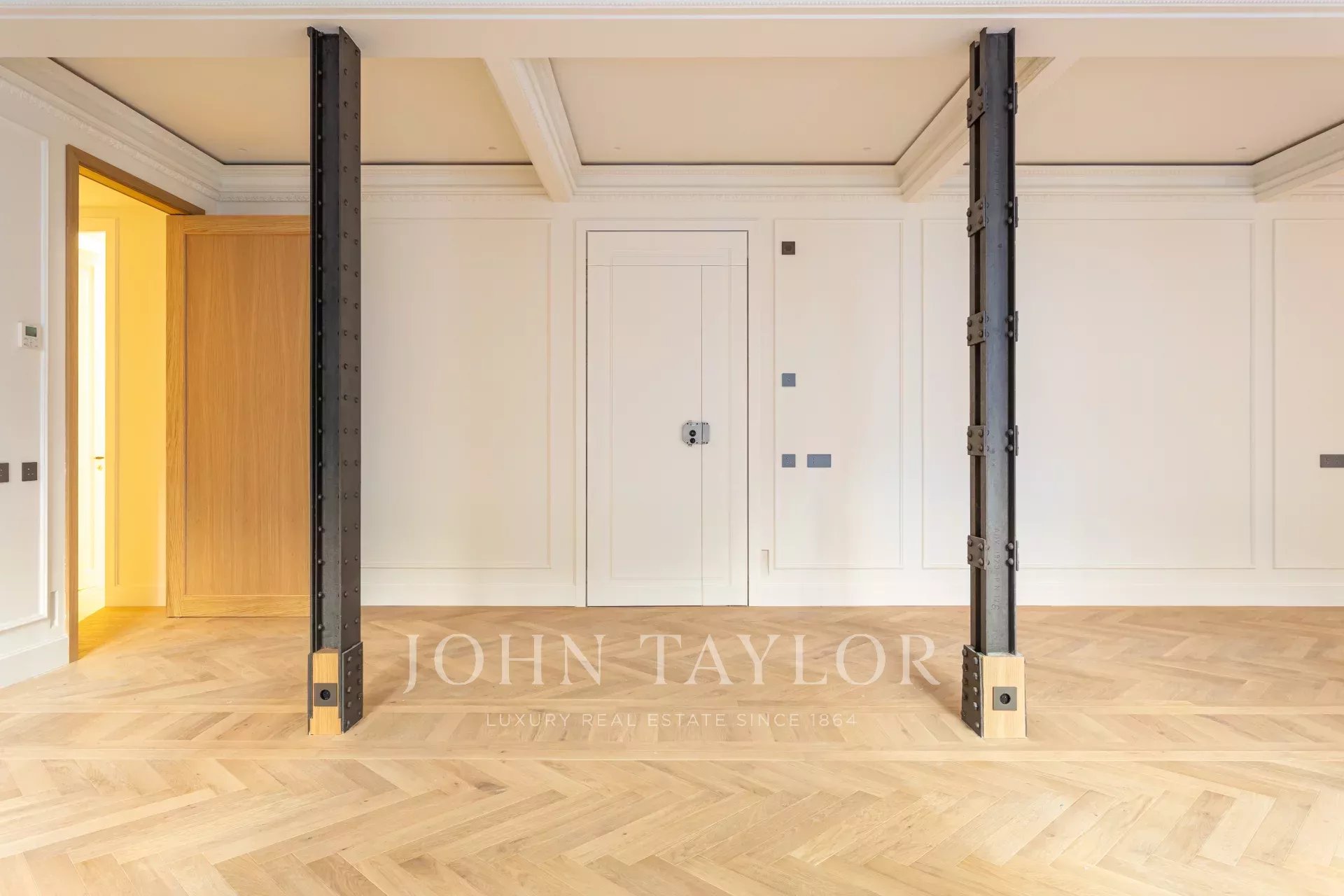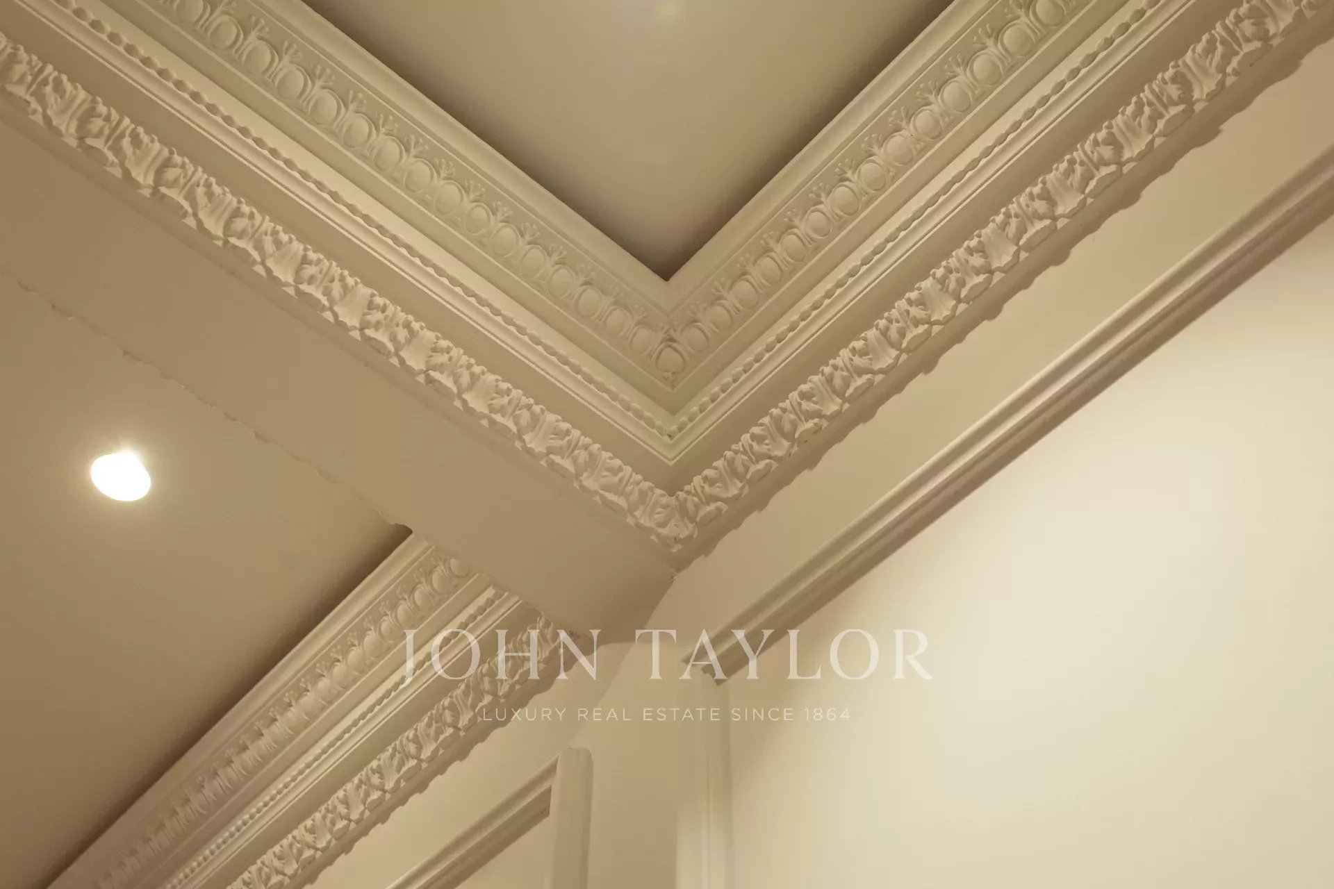 Высокие потолки, лепнина на стенах и потолках, дубовый пол в елочку, двойные стеклопакеты для изоляции и канальный кондиционер во всем доме.