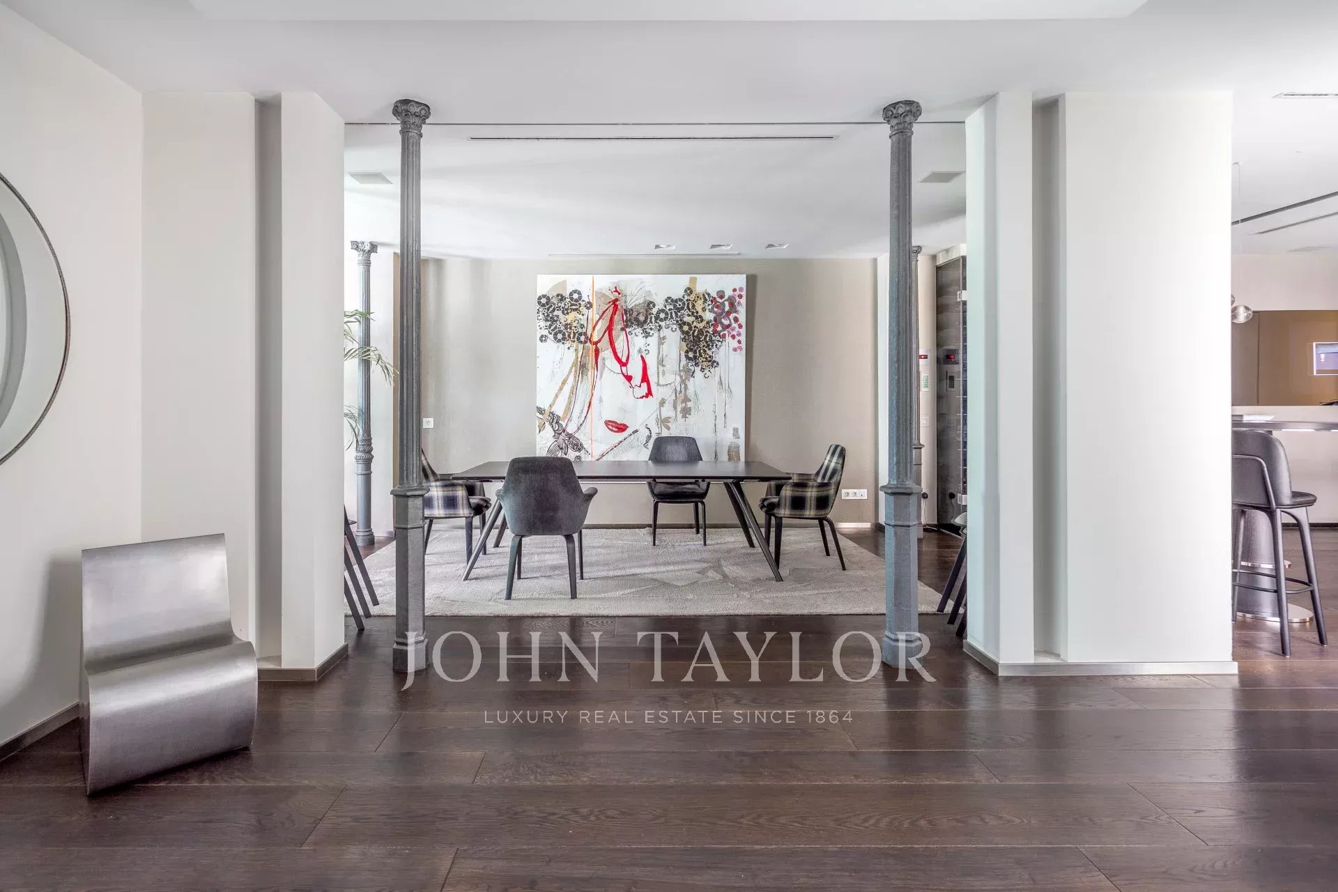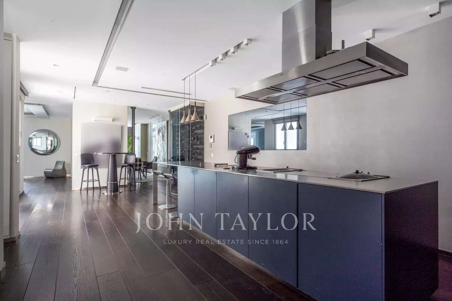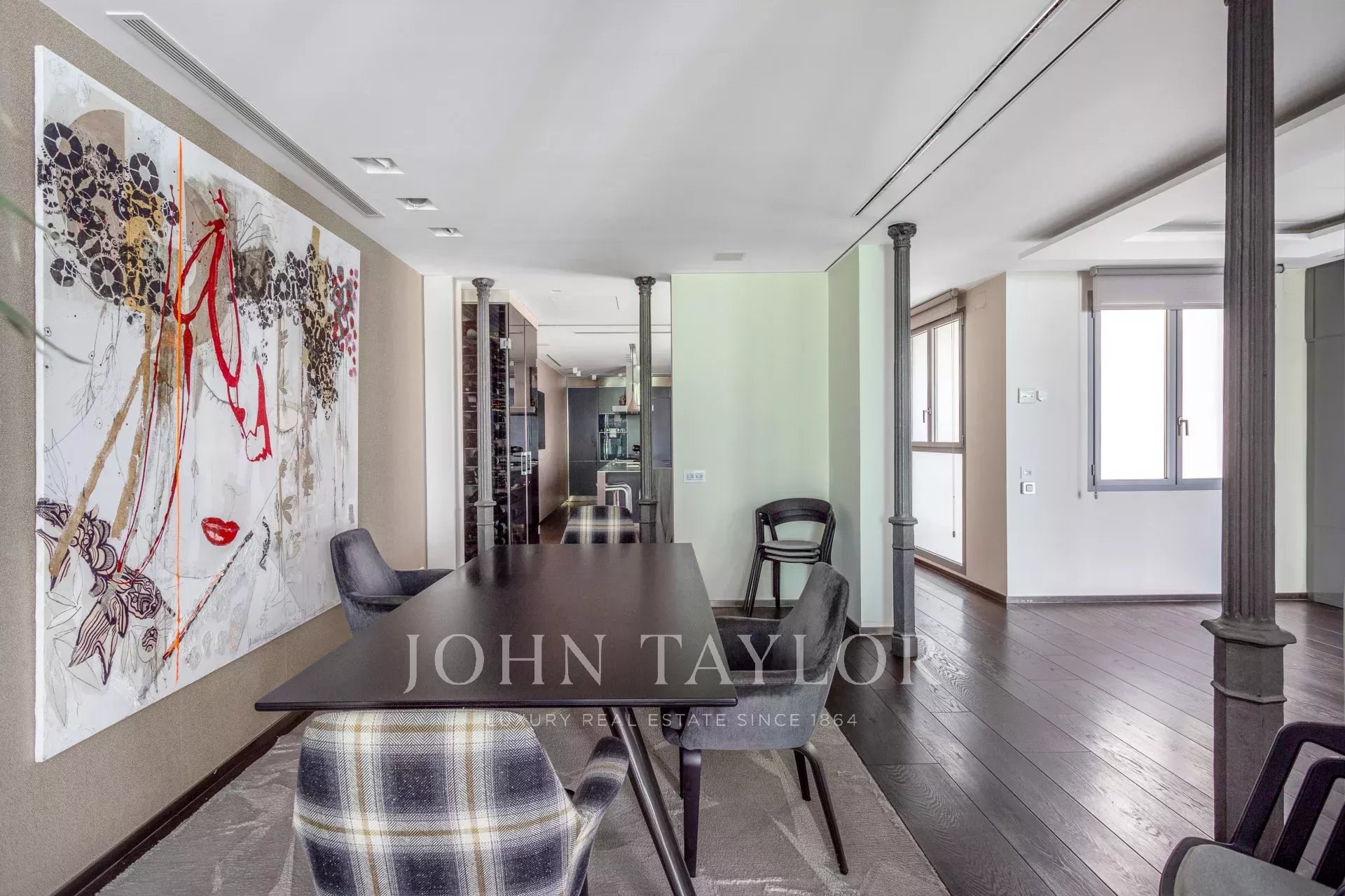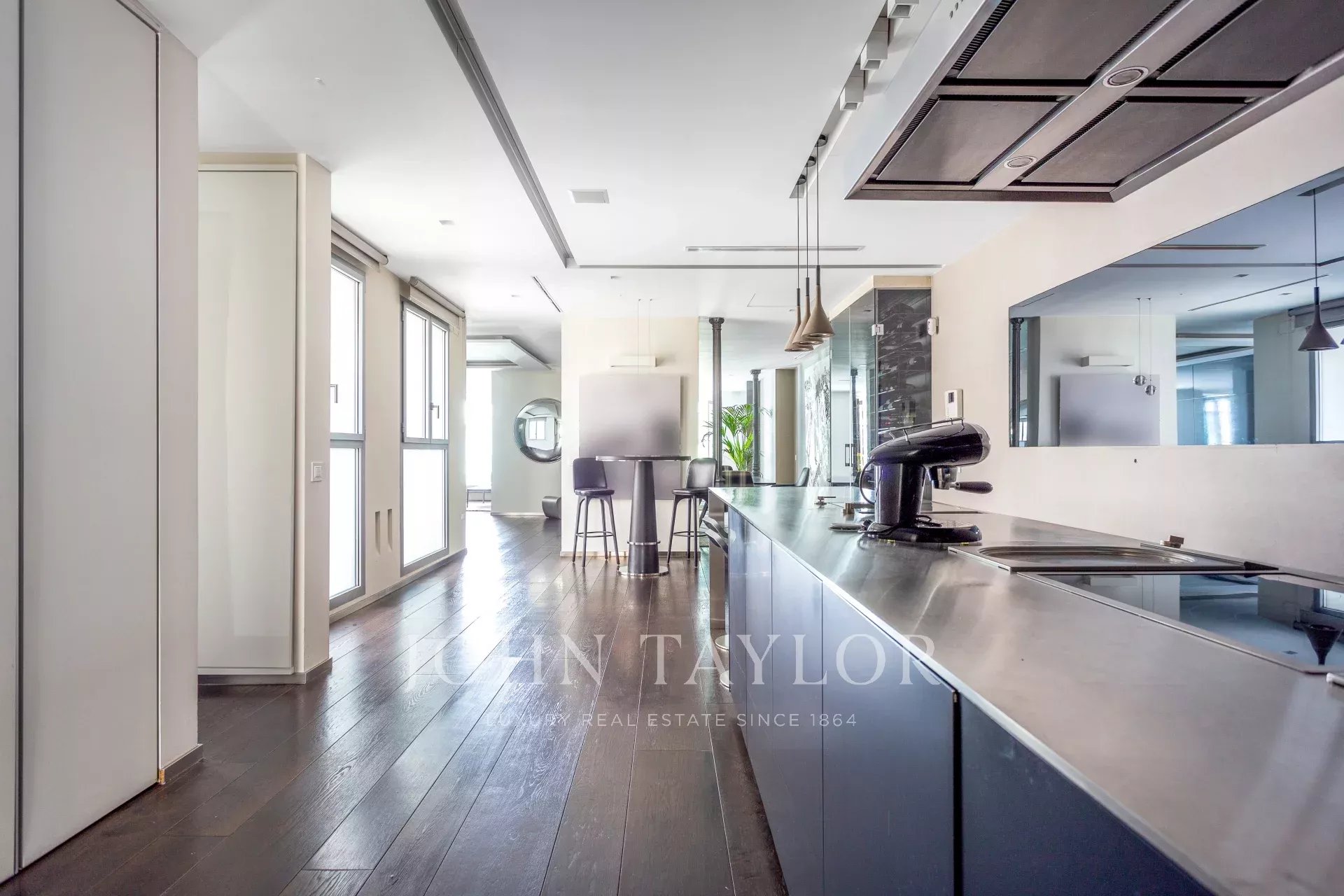 Квартира имеет открытое социальное пространство с гостиной с двумя балконами и видом на улицу, большой столовой, гостевым туалетом и современной кухней Gaggenau, полностью оборудованной лучшей техникой.