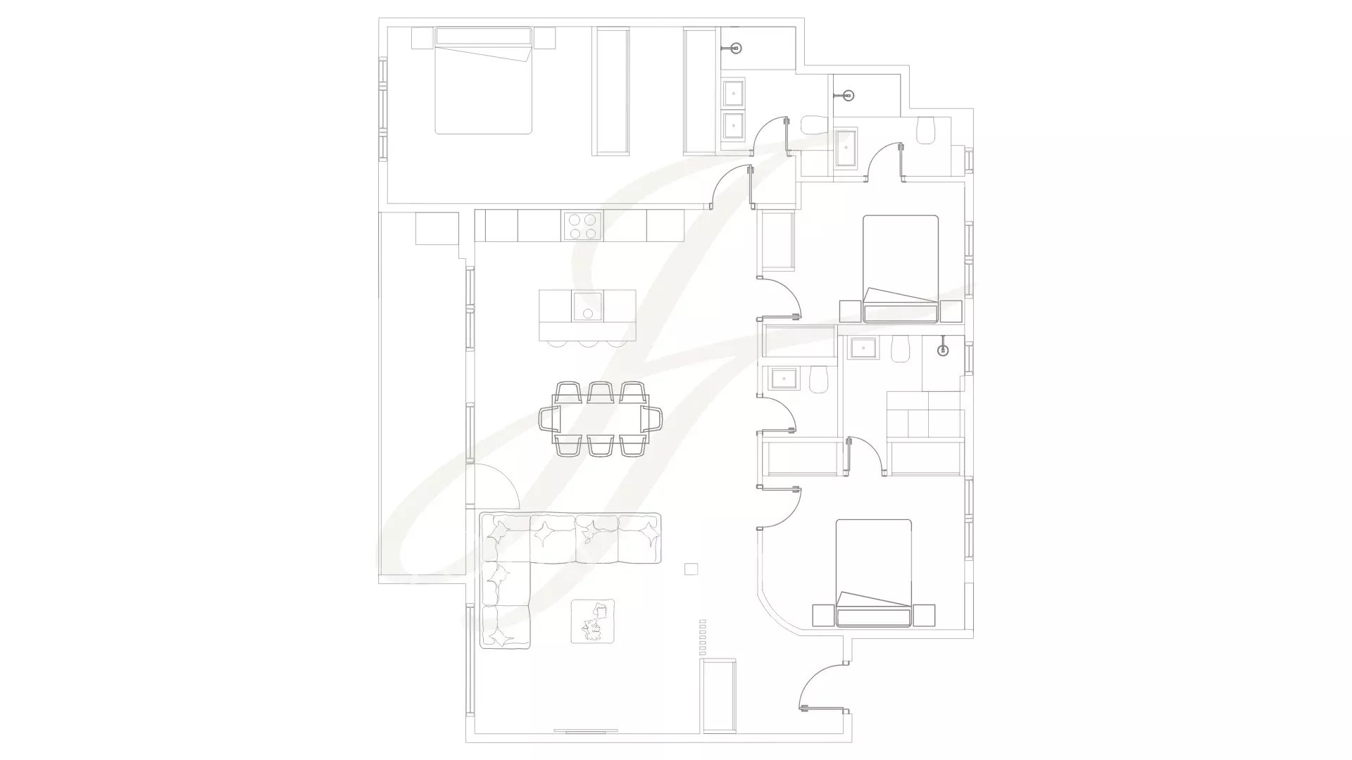 Спальная зона состоит из двух просторных и светлых спален с ванными комнатами, в главной спальне есть большая гардеробная и ванная комната.