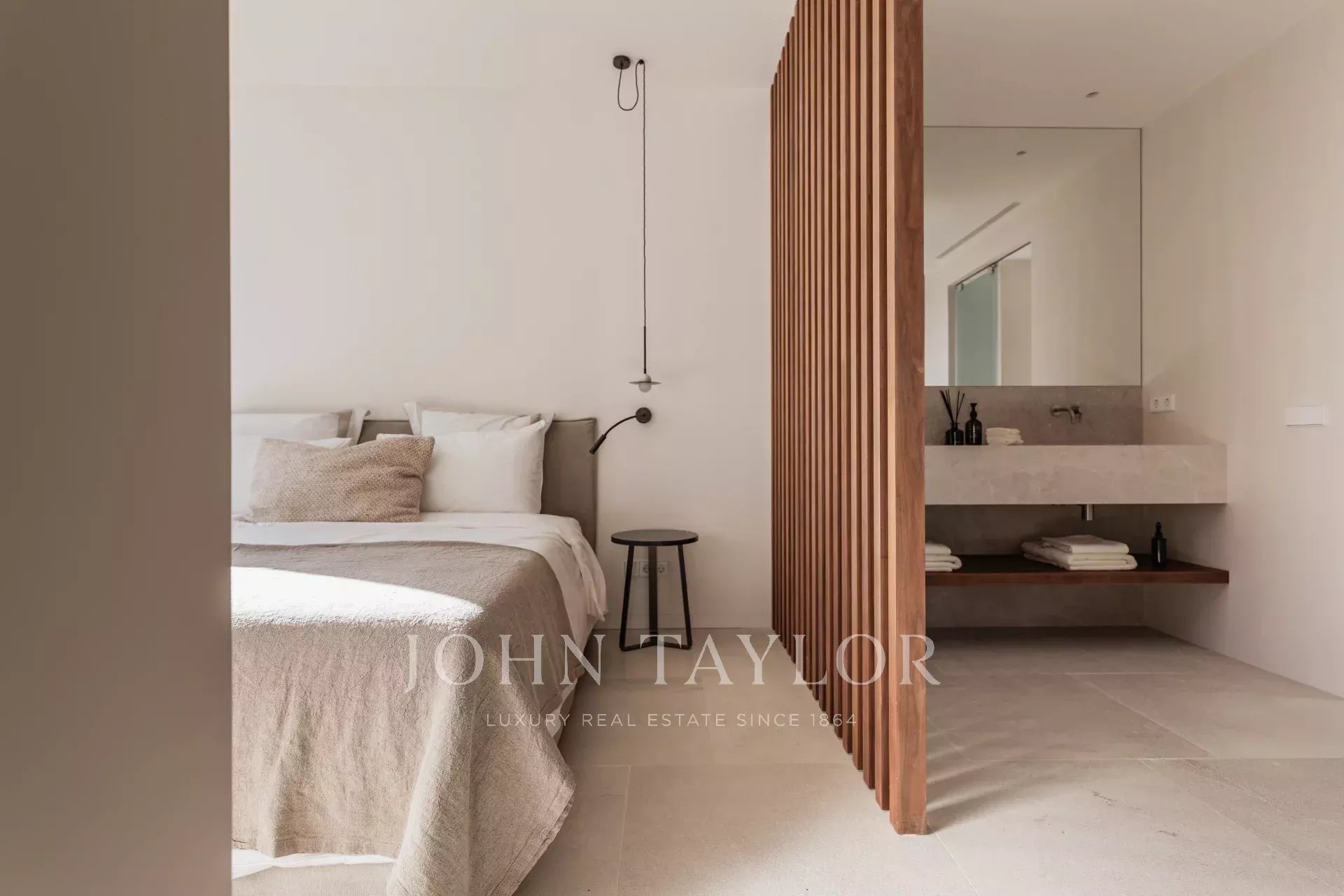 Апартаменты на втором этаже располагают главной спальней с ванной комнатой, второй спальней и ванной комнатой, кухней, столовой и гостиной открытой планировки, из которых есть прямой выход на частную террасу площадью 55 м2 и бассейн, ведущий в сад площадью 82 м2. В доме есть отдельная прачечная и кладовая.