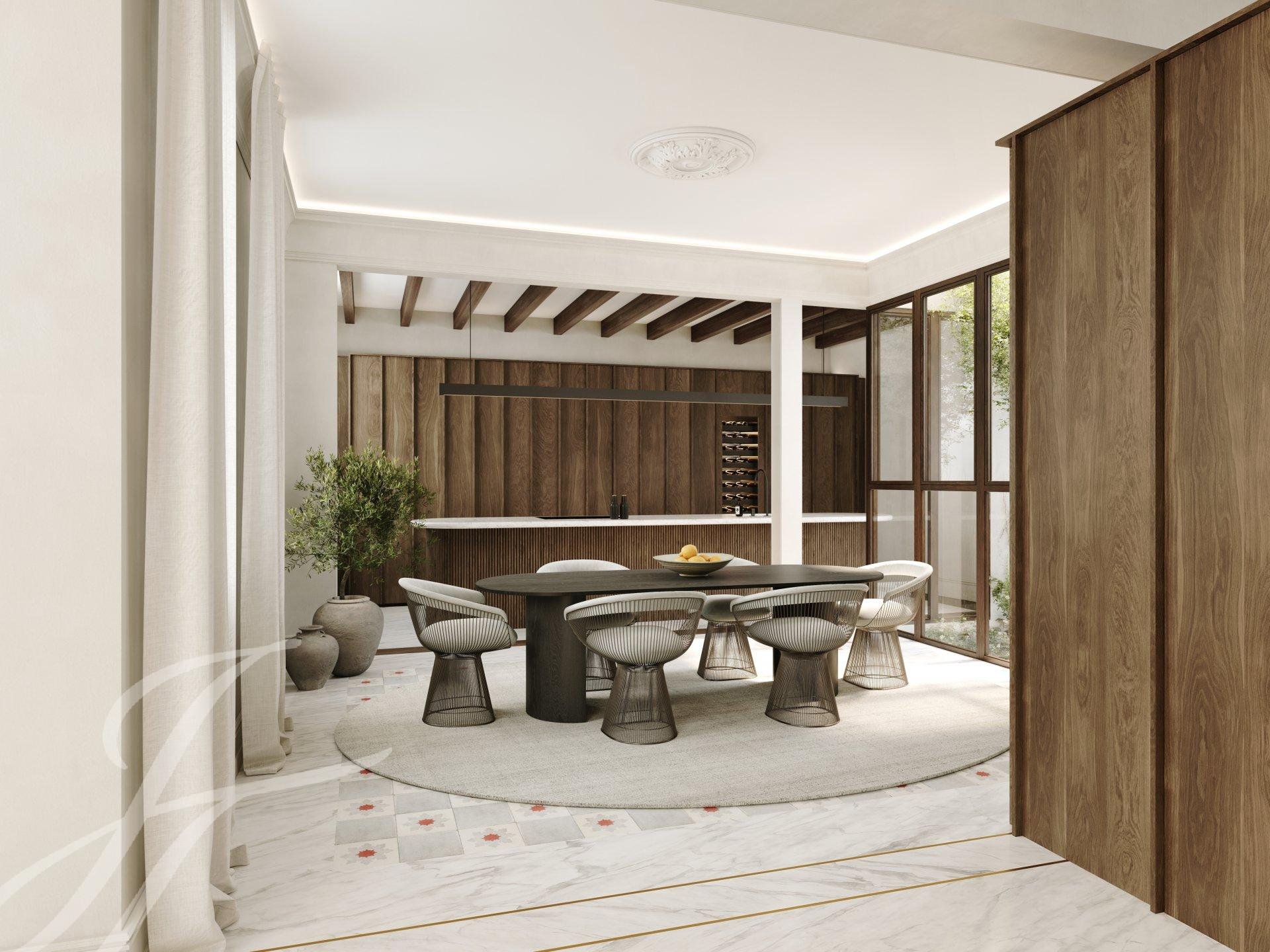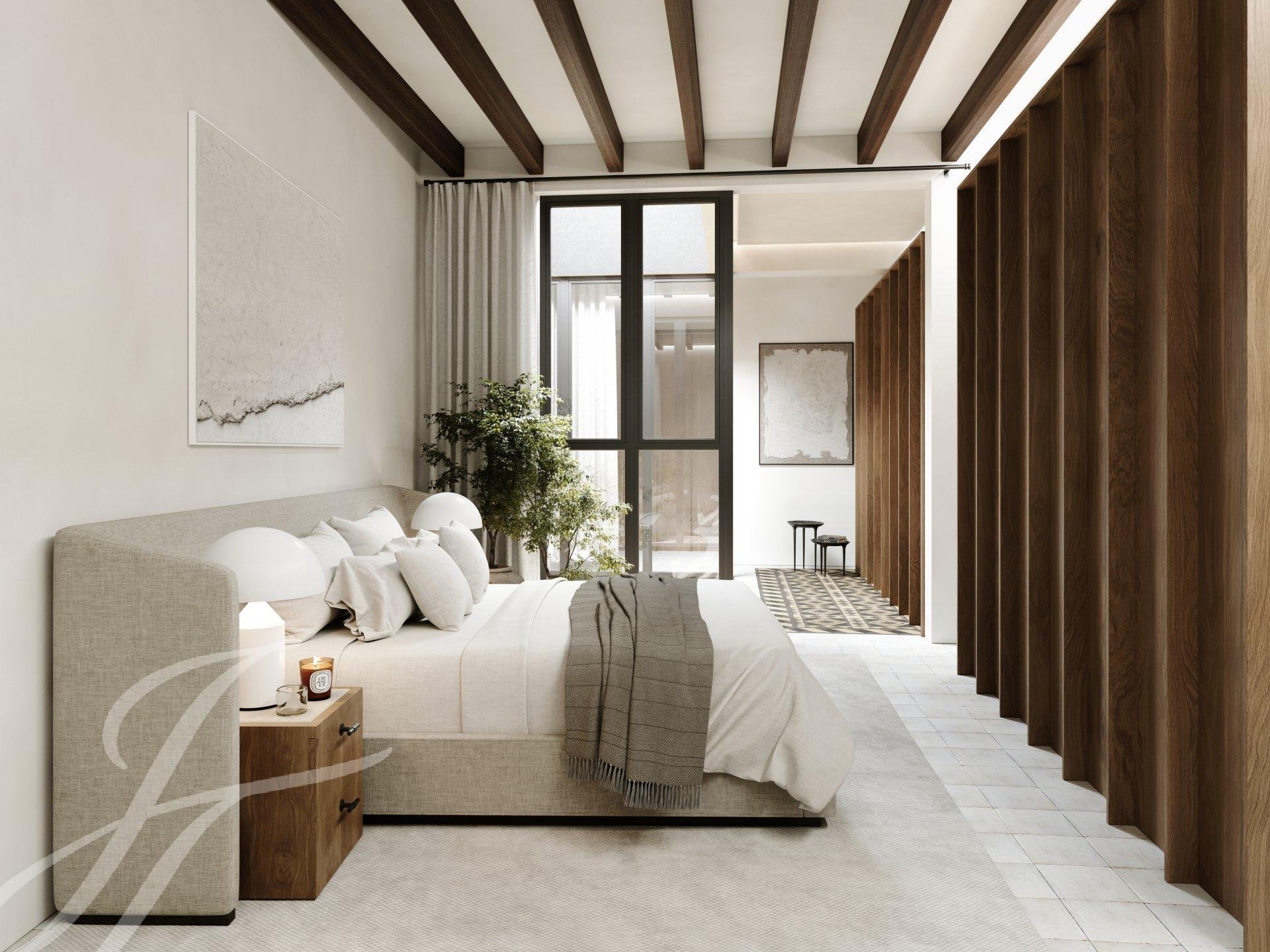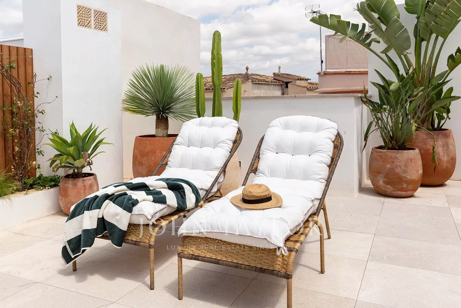 Этот выдающийся дуплекс с тремя спальнями и тремя ванными комнатами расположен на двух верхних этажах здания и включает в себя сенсационную террасу на крыше, с которой открываются далекие виды на городские крыши. На нижнем уровне большая, наполненная светом гостиная с антикварной напольной плиткой и открытыми деревянными балками расположена в передней части здания, с двумя балконами, выходящими на улицу. Сзади расположены две просторные спальни с ванными комнатами. Главная спальня имеет окна в центральный внутренний дворик, встроенные шкафы и плитку Майоркин на полу, а во второй спальне установлены стеклянные двери, пропускающие свет из внутреннего дворика. Обе ванные комнаты роскошно отделаны мрамором Volakas и ореховым деревом и оснащены душевыми кабинами и двойными трюмо со встроенными мраморными раковинами. На верхнем уровне кухня, столовая и гостиная с открытой концепцией огибают с двух сторон центральное патио. Окна во всю высоту, выходящие во внутренний двор, и световой колодец на задней стенке наполняют пространство естественным светом. Изящная кухня, отделанная ореховым деревом, с островом с мраморной столешницей и встроенной раковиной, оснащена высококачественной техникой Gaggenau, включая винный холодильник. Также на этом уровне находится большая третья спальня с наклонным потолком, душевая в ванной комнате и кладовая. Мраморные полы Volakas с деревянной отделкой и открытые деревянные балки простираются по всему уровню, придавая ему вневременную, элегантную привлекательность. Отсюда лестница ведет на солнечную террасу площадью 76 м2, с которой открывается вид на церковь Санта-Эулалия, Кафедральный собор и замок Бельвер. Расположенная на разных уровнях, эта терраса - привилегированное место, где можно понежиться на солнце в зимние дни и насладиться теплыми летними ночами над городской суетой. В доме установлены полы с подогревом и центральное кондиционирование.