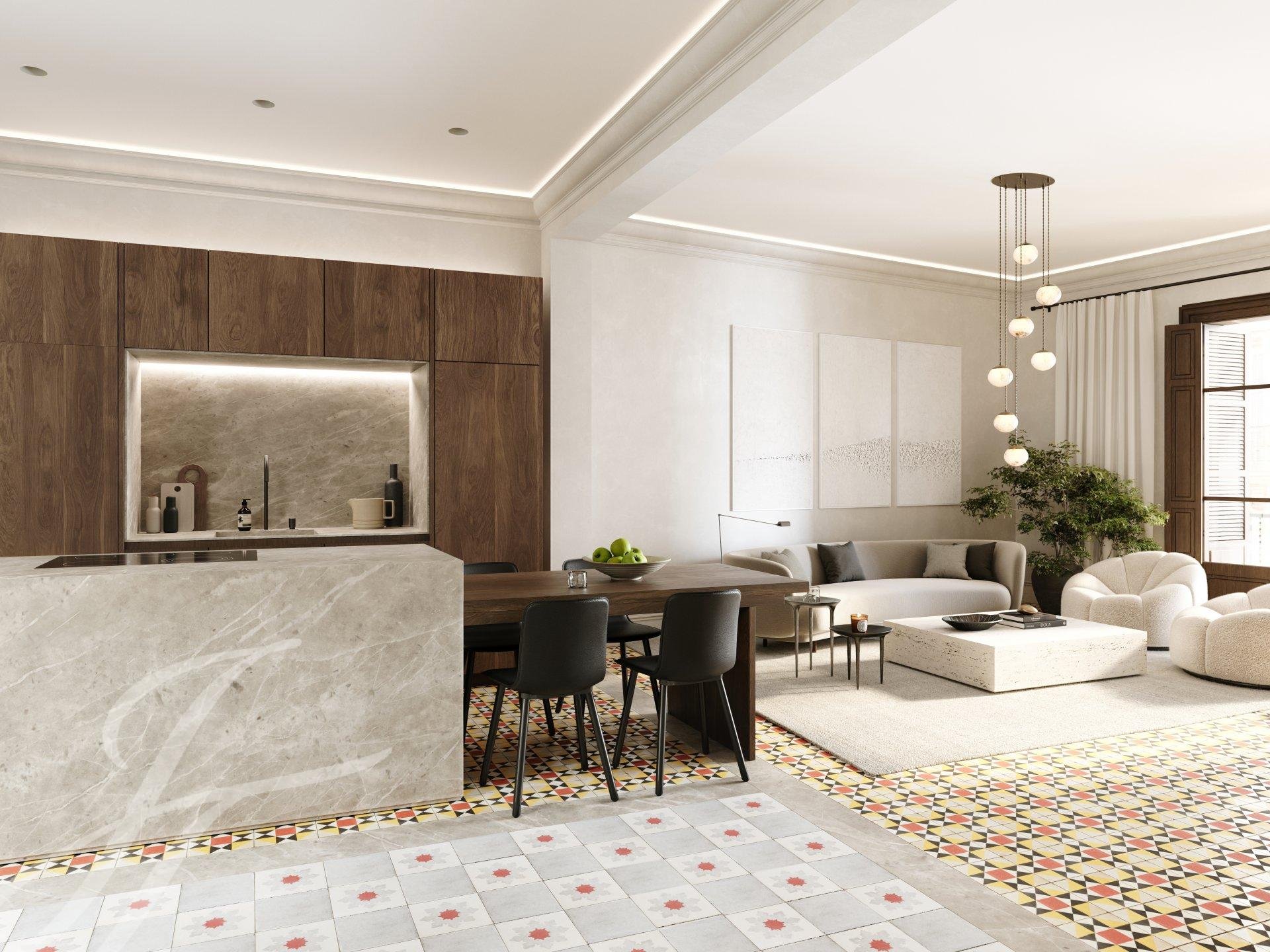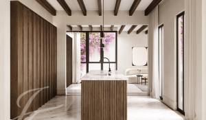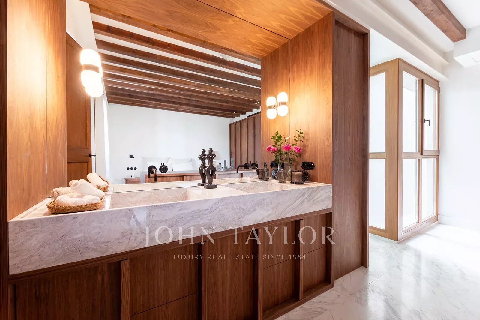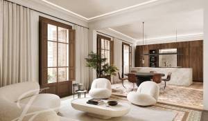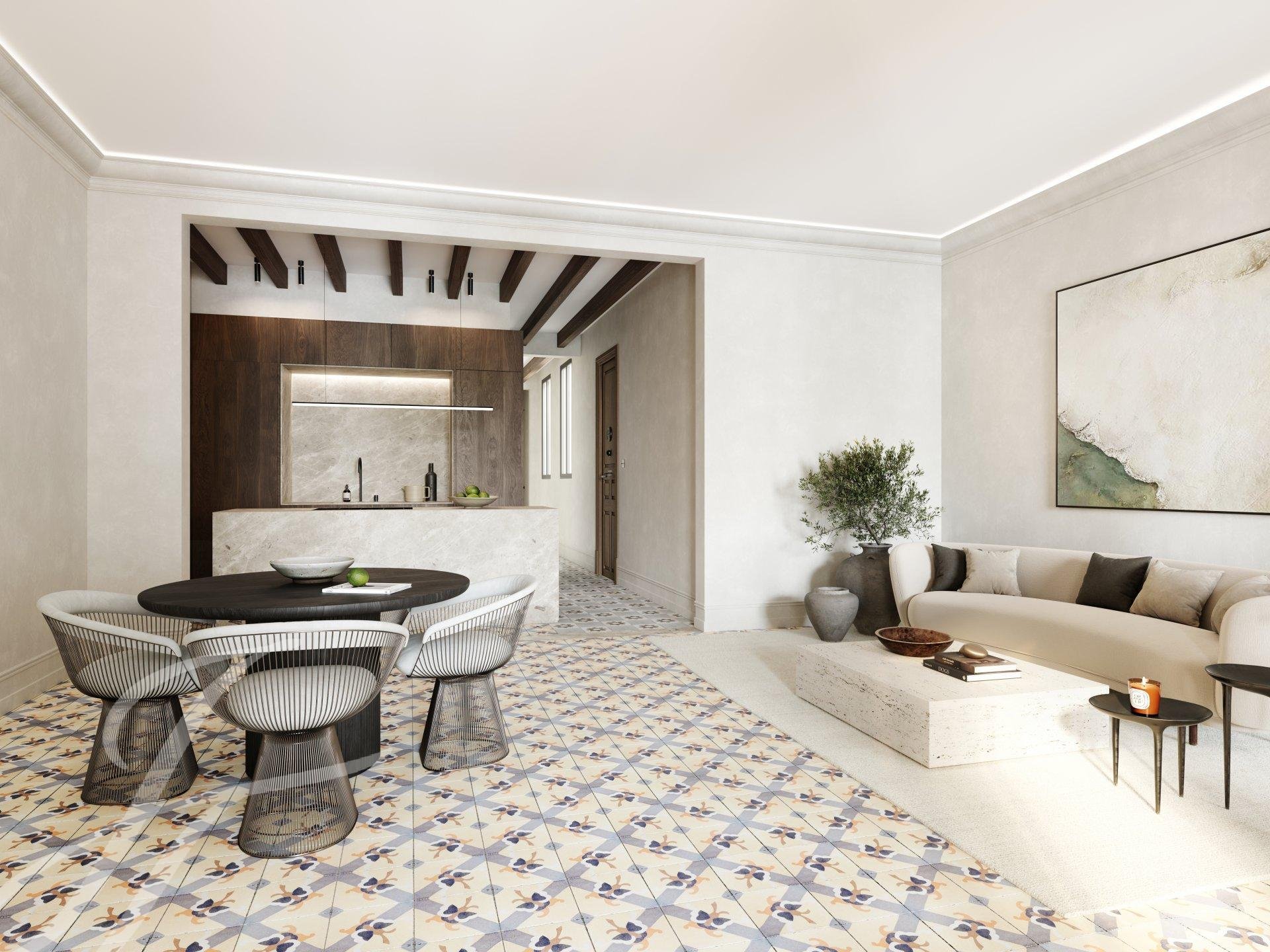 Этот выдающийся дуплекс с тремя спальнями и тремя ванными комнатами расположен на двух верхних этажах здания и включает в себя сенсационную террасу на крыше, с которой открываются далекие виды на городские крыши. На нижнем уровне большая, наполненная светом гостиная с антикварной напольной плиткой и открытыми деревянными балками расположена в передней части здания, с двумя балконами, выходящими на улицу. Сзади расположены две просторные спальни с ванными комнатами. Главная спальня имеет окна в центральный внутренний дворик, встроенные шкафы и плитку Майоркин на полу, а во второй спальне установлены стеклянные двери, пропускающие свет из внутреннего дворика. Обе ванные комнаты роскошно отделаны мрамором Volakas и ореховым деревом и оснащены душевыми кабинами и двойными трюмо со встроенными мраморными раковинами. На верхнем уровне кухня, столовая и гостиная с открытой концепцией огибают с двух сторон центральное патио. Окна во всю высоту, выходящие во внутренний двор, и световой колодец на задней стенке наполняют пространство естественным светом. Изящная кухня, отделанная ореховым деревом, с островом с мраморной столешницей и встроенной раковиной, оснащена высококачественной техникой Gaggenau, включая винный холодильник. Также на этом уровне находится большая третья спальня с наклонным потолком, душевая в ванной комнате и кладовая. Мраморные полы Volakas с деревянной отделкой и открытые деревянные балки простираются по всему уровню, придавая ему вневременную, элегантную привлекательность. Отсюда лестница ведет на солнечную террасу площадью 76 м2, с которой открывается вид на церковь Санта-Эулалия, Кафедральный собор и замок Бельвер. Расположенная на разных уровнях, эта терраса - привилегированное место, где можно понежиться на солнце в зимние дни и насладиться теплыми летними ночами над городской суетой. В доме установлены полы с подогревом и центральное кондиционирование.