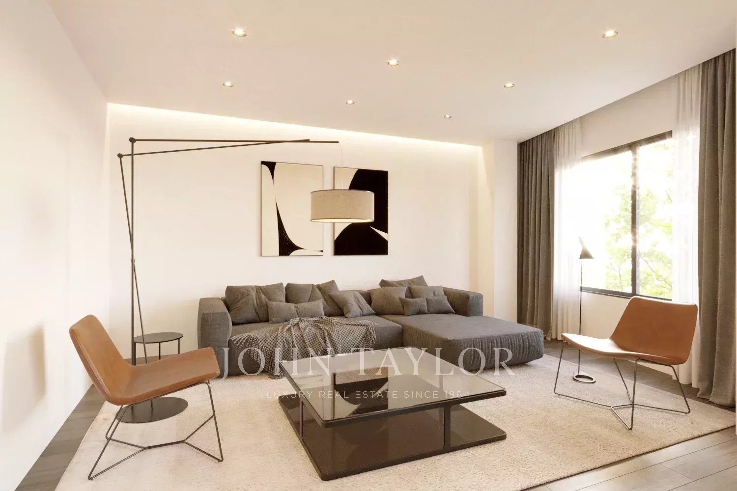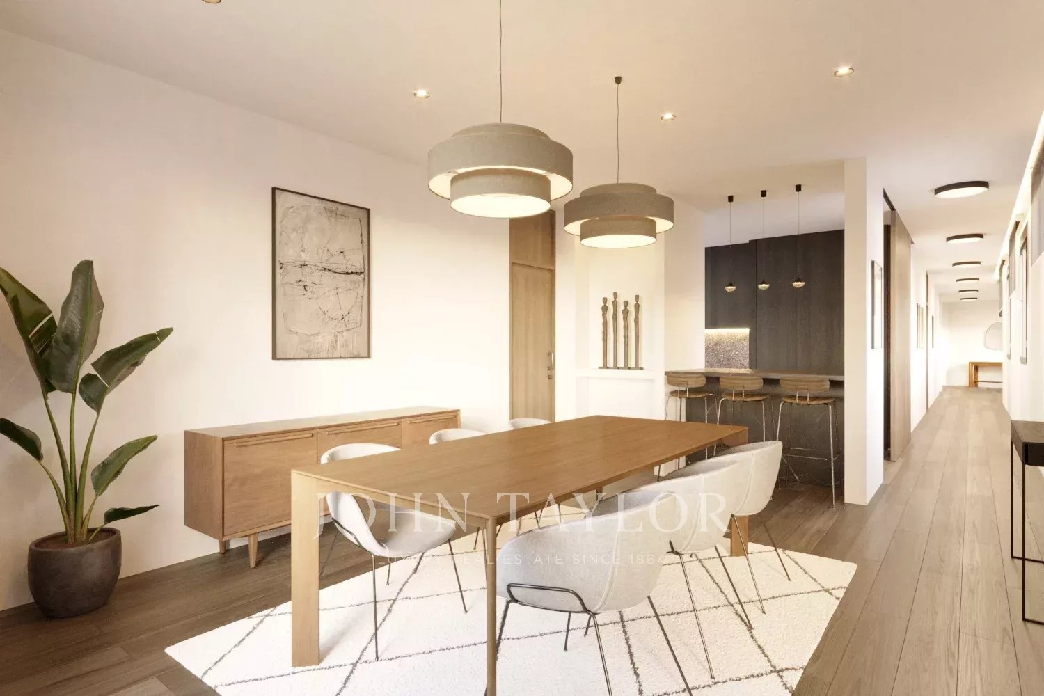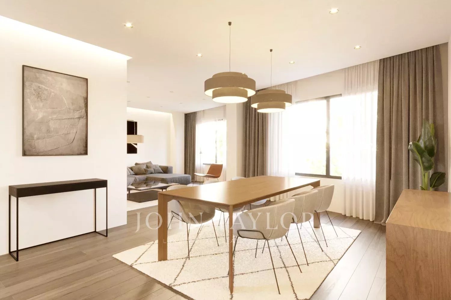 Проект предусматривает квартиру площадью 200 м2, включающую две просторные спальни с ванными комнатами, современную кухню, столовую, уютную гостиную, офисное помещение и прачечную. Хотя в квартире нет террасы, она может похвастаться большими окнами в каждой комнате, обеспечивая обилие естественного света во всем пространстве.
