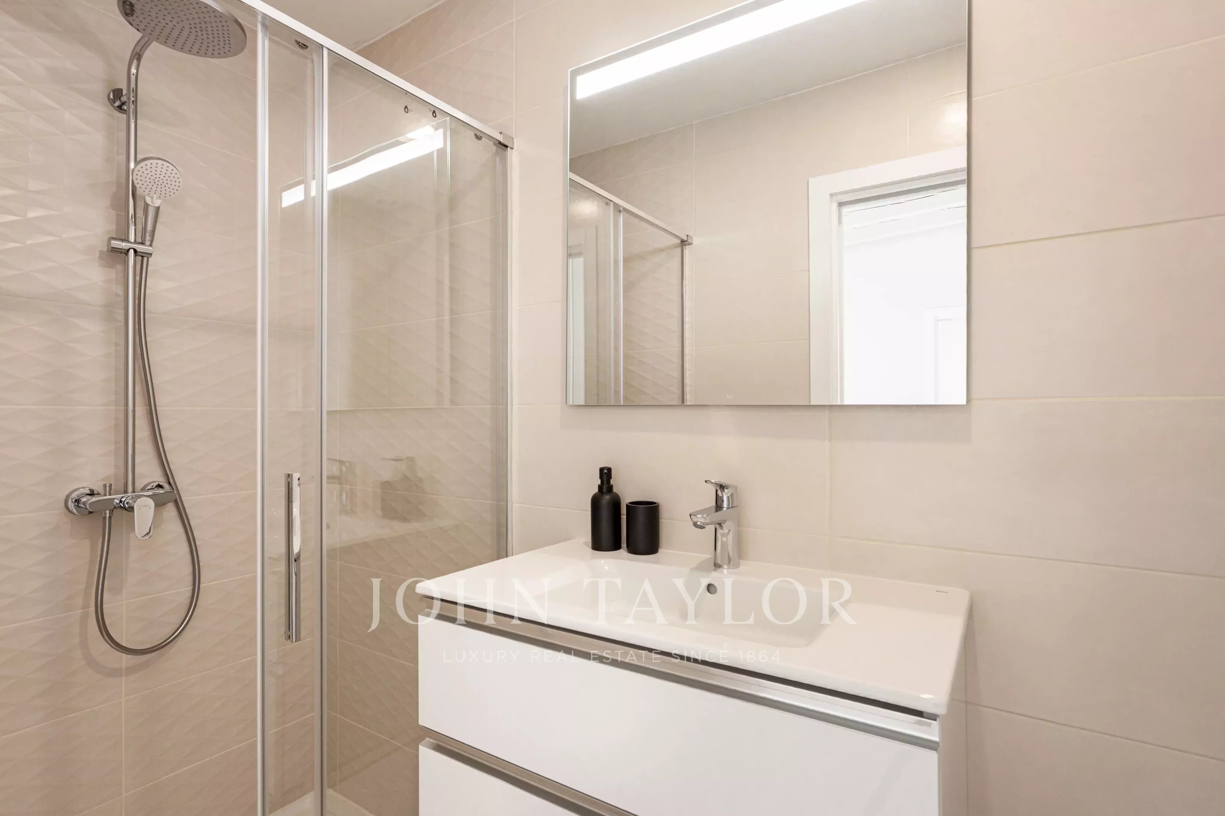 Квартира впечатляет просторными пропорциями, естественным освещением и продуманной планировкой. В ней имеются две комфортабельные спальни, одна из которых с собственной ванной комнатой, а также отдельная гостевая ванная. Дополнительно квартира включает отдельную прачечную, небольшую террасу и балкон на основном жилом уровне.
