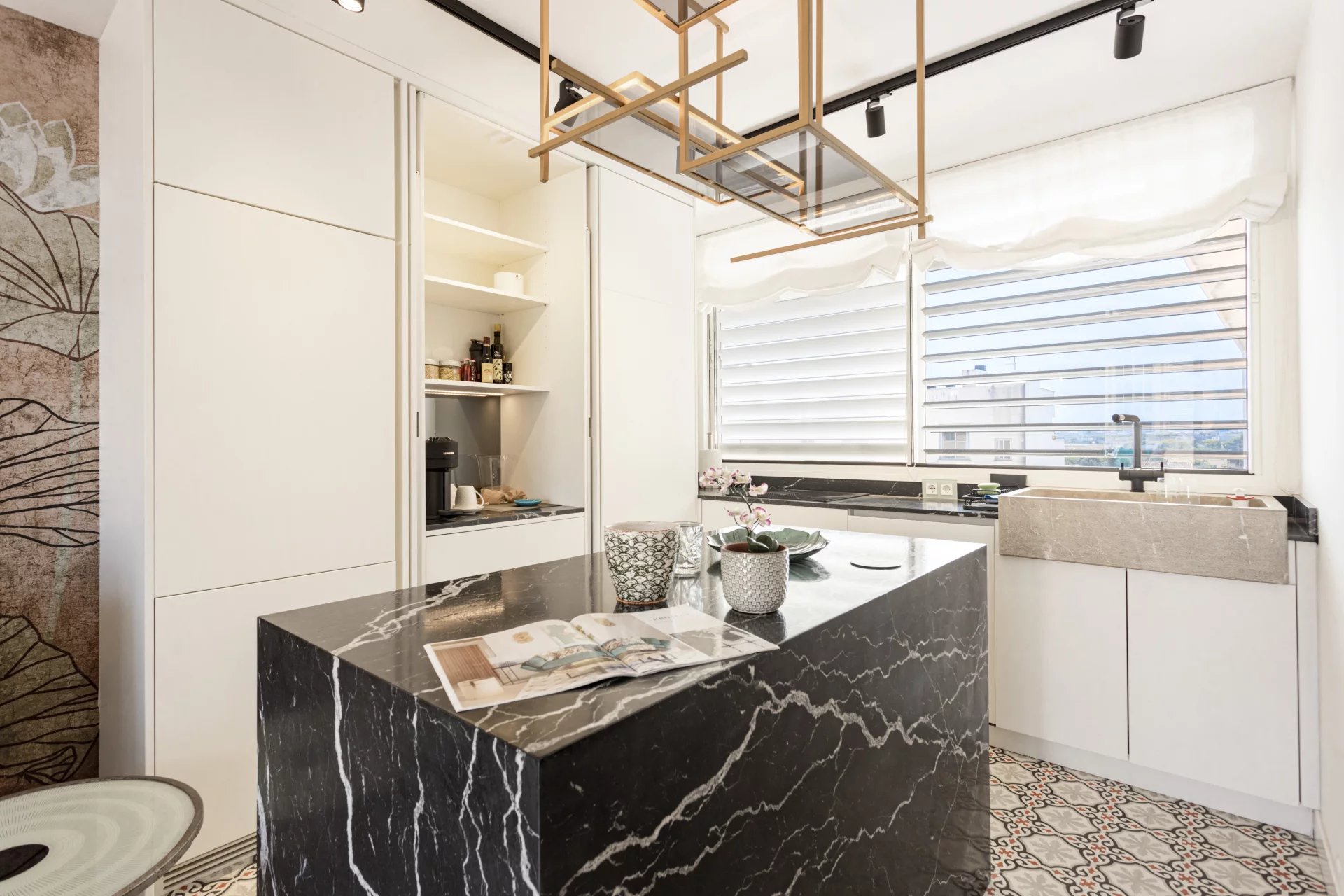 Эта эксклюзивная квартира оснащена всеми необходимыми удобствами, включая полы с подогревом, кондиционеры, осмосную систему водоснабжения, электрические маркизы, винный холодильник, бытовую технику Miele, туалет с душем в японском стиле, а также сигнализацию и лифт. В стоимость входит частный гараж и мебель.