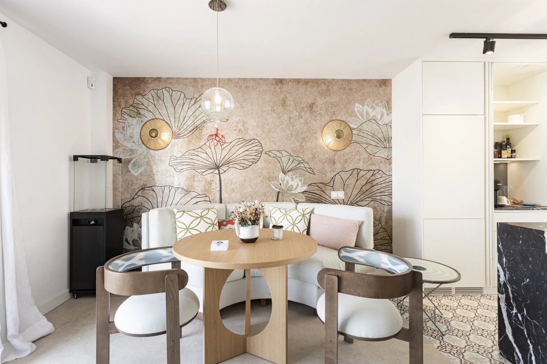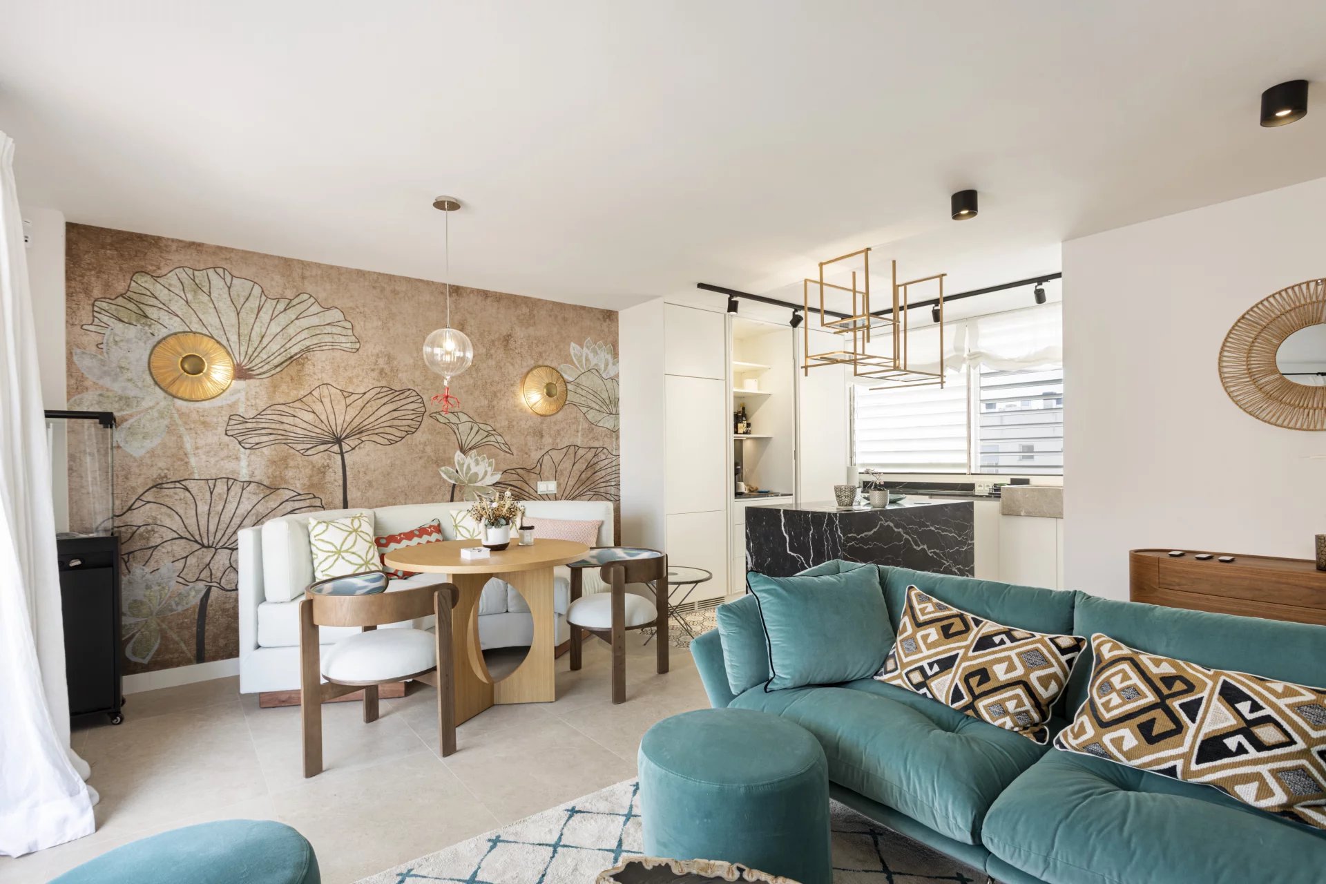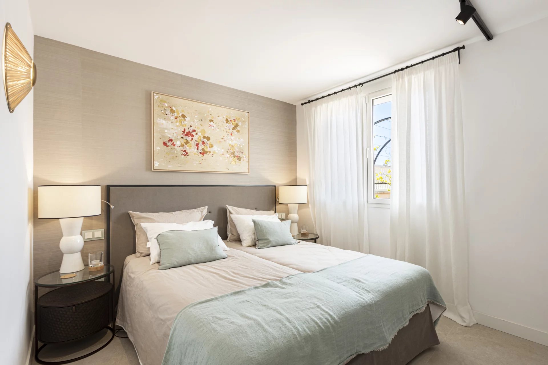 Интерьер включает в себя гостиную и столовую открытой концепции с большими окнами, которые заливают пространство естественным светом. Главная спальня просторна, а вторая спальня в настоящее время используется в качестве домашнего офиса, что позволяет работать удаленно. С нижней террасы открывается частичный вид на море и спокойную атмосферу в нескольких шагах от Средиземного моря.