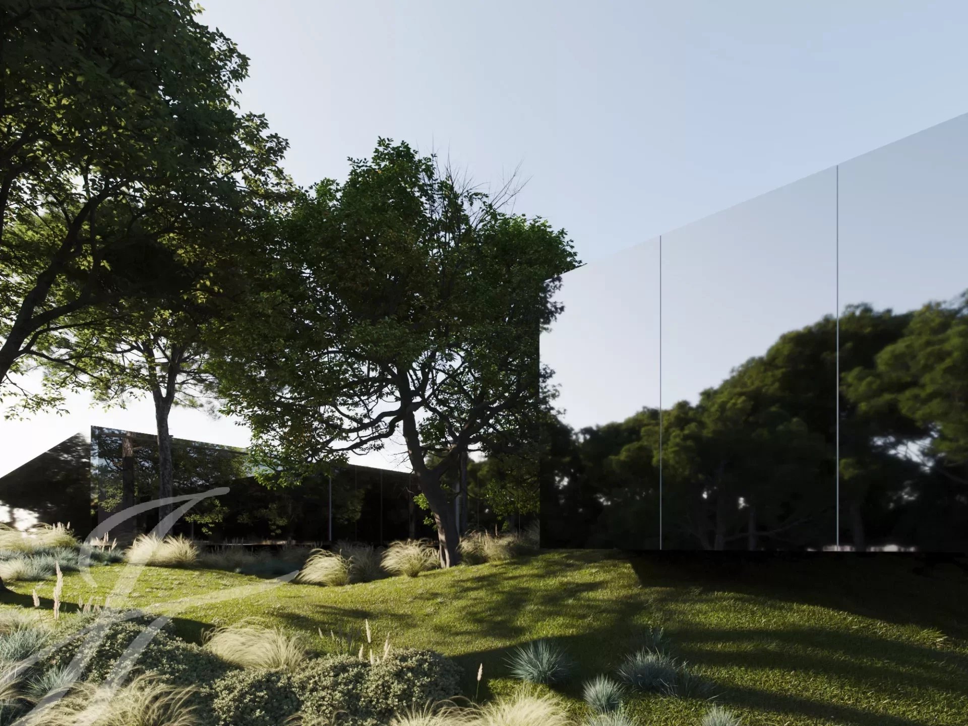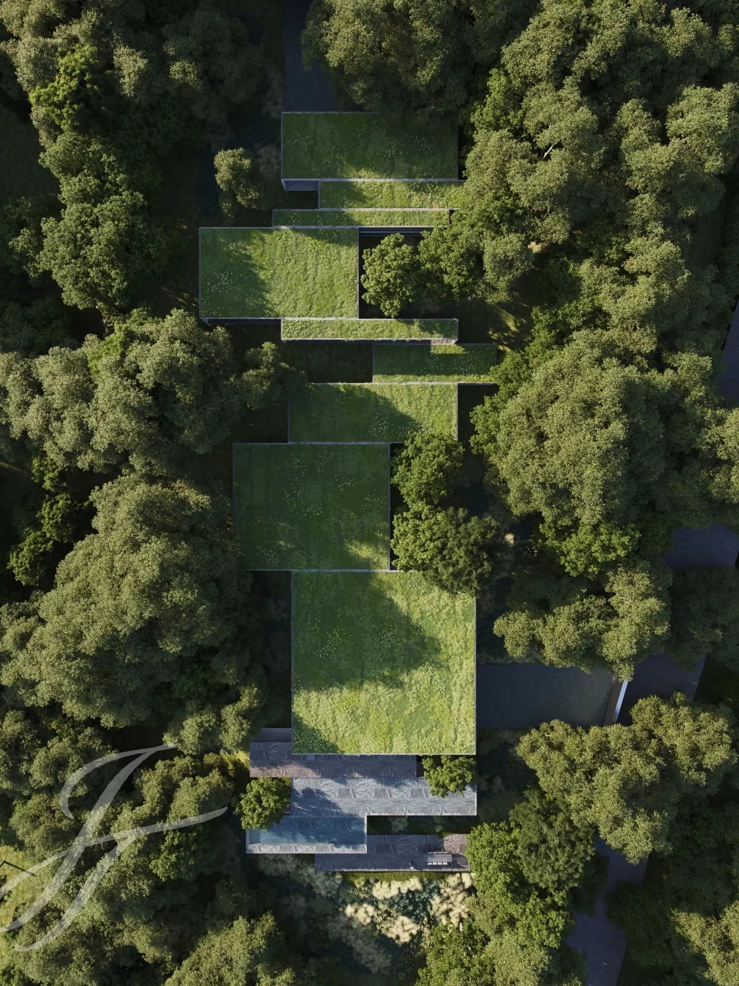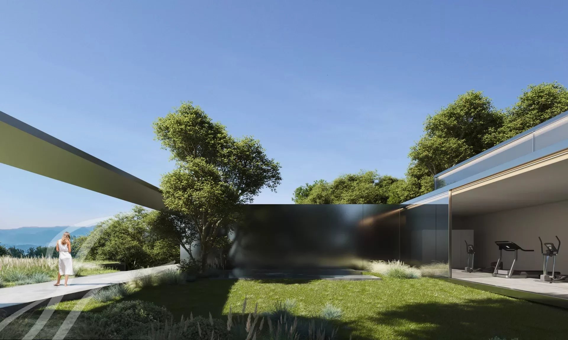 Архитектура виллы отражает уникальную топографию участка: строение повторяет вытянутую, наклонную форму местности, а отражающие алюминиевые панели создают иллюзию непрерывности между строением и лесом. Такой дизайн уменьшает визуальную заметность дома, подчеркивая красоту окружающей природы.