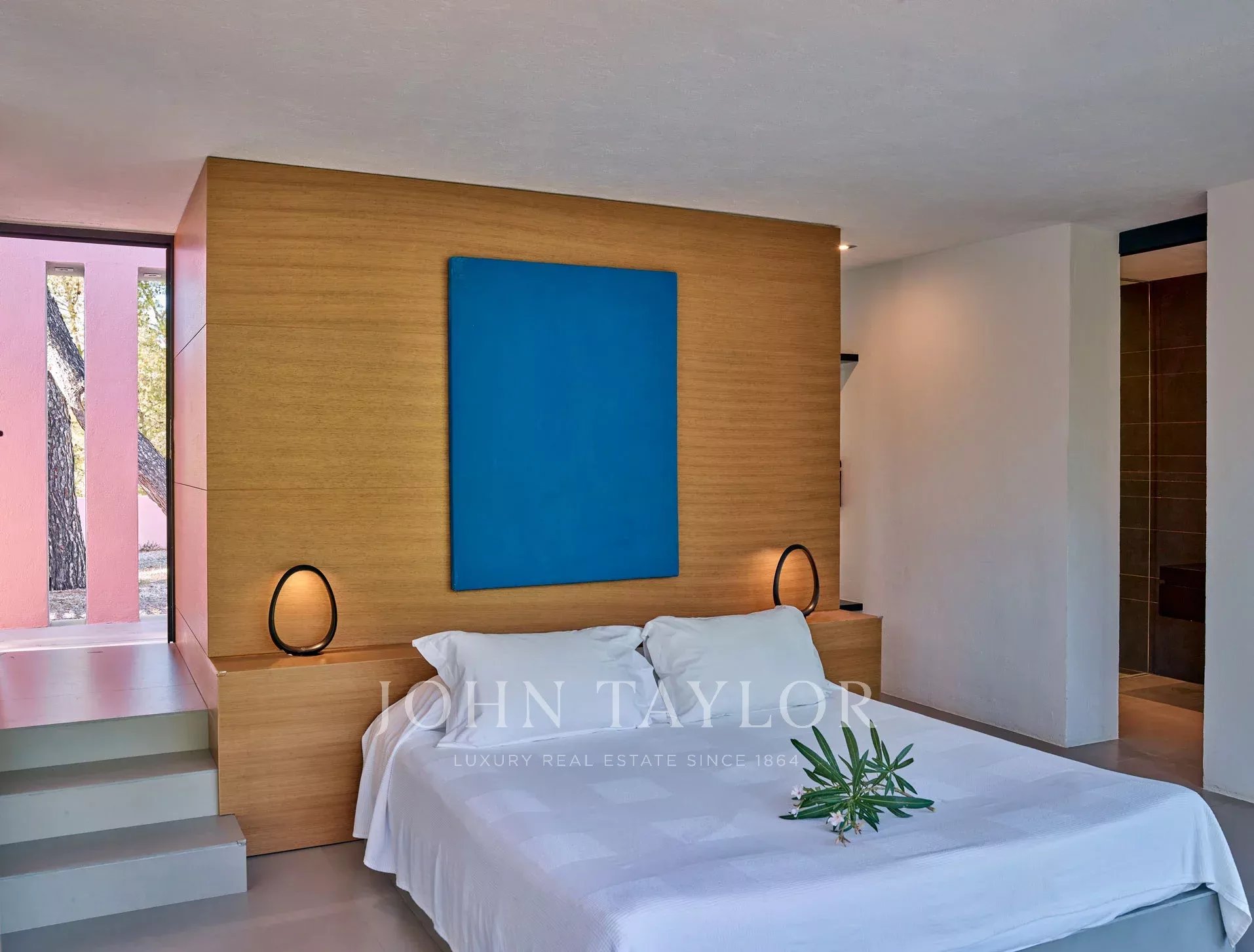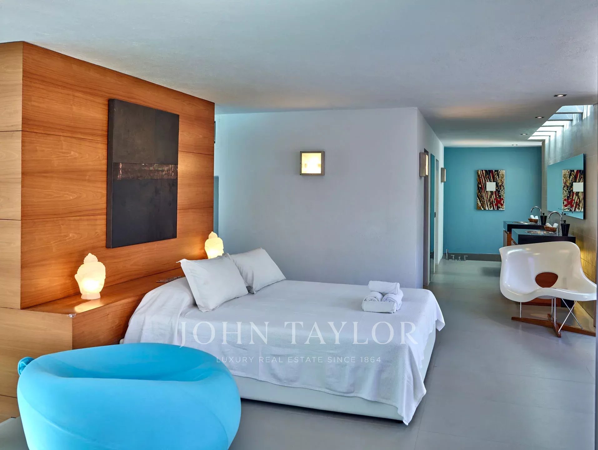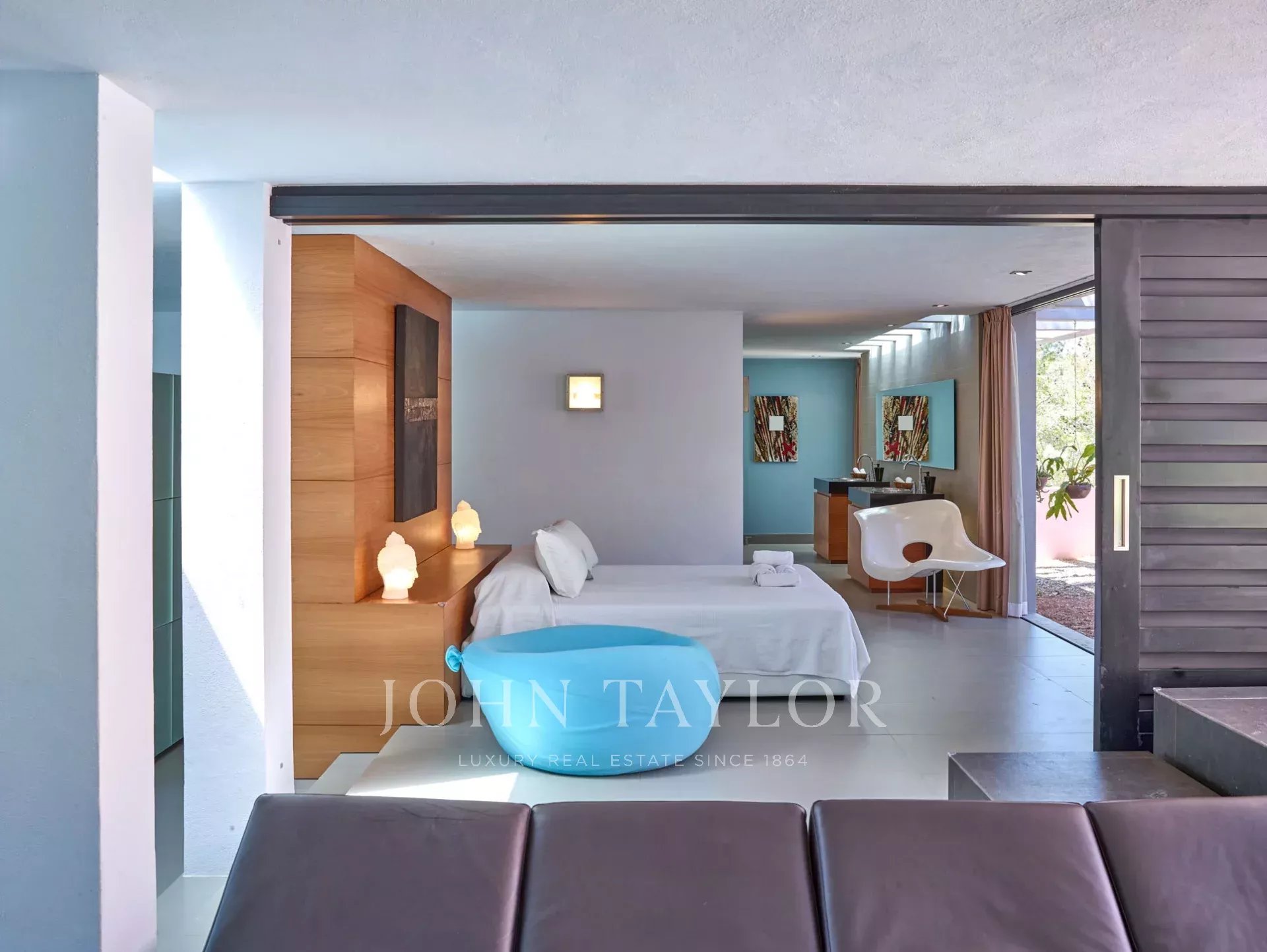 Вилла предлагает несколько спален с собственными ванными комнатами, все с доступом на улицу через большие раздвижные двери. Главная спальня с ванной комнатой, которая включает отдельный душ с боковыми форсунками, соединена с основной гостиной, но также может быть закрыта раздвижными дверями для обеспечения приватности. Другие спальни имеют прямой доступ в сад или на деревянную террасу под бассейном, создавая уникальную атмосферу для отдыха.