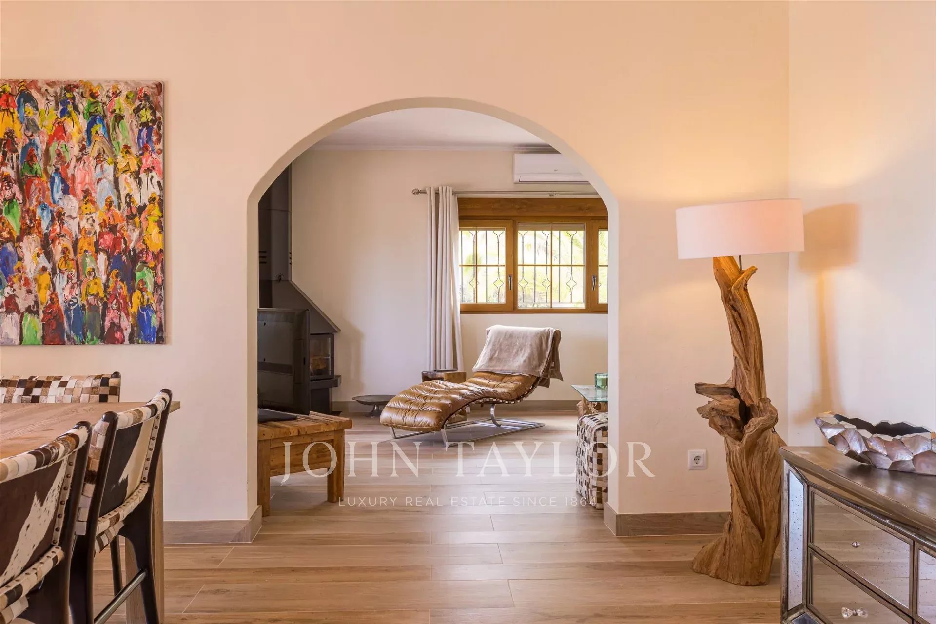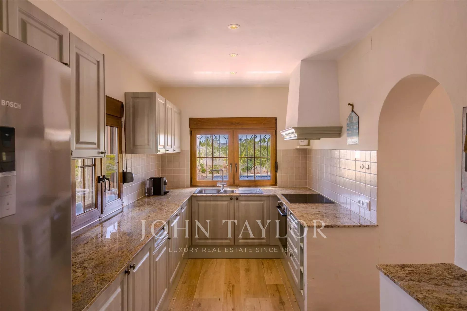 Построенная в 2001 году и отреставрированная в 2018 году с использованием высококачественных материалов Porcelanosa, вилла площадью 300 м², распределенная на два этажа, сочетает в себе классическое очарование и современные удобства. Главный дом включает три просторные спальни, каждая с собственной ванной комнатой, обеспечивая максимальный комфорт и уединение. Дополнительно есть гостевой дом с дополнительной спальней, уютной гостиной, кухней и частной террасой.