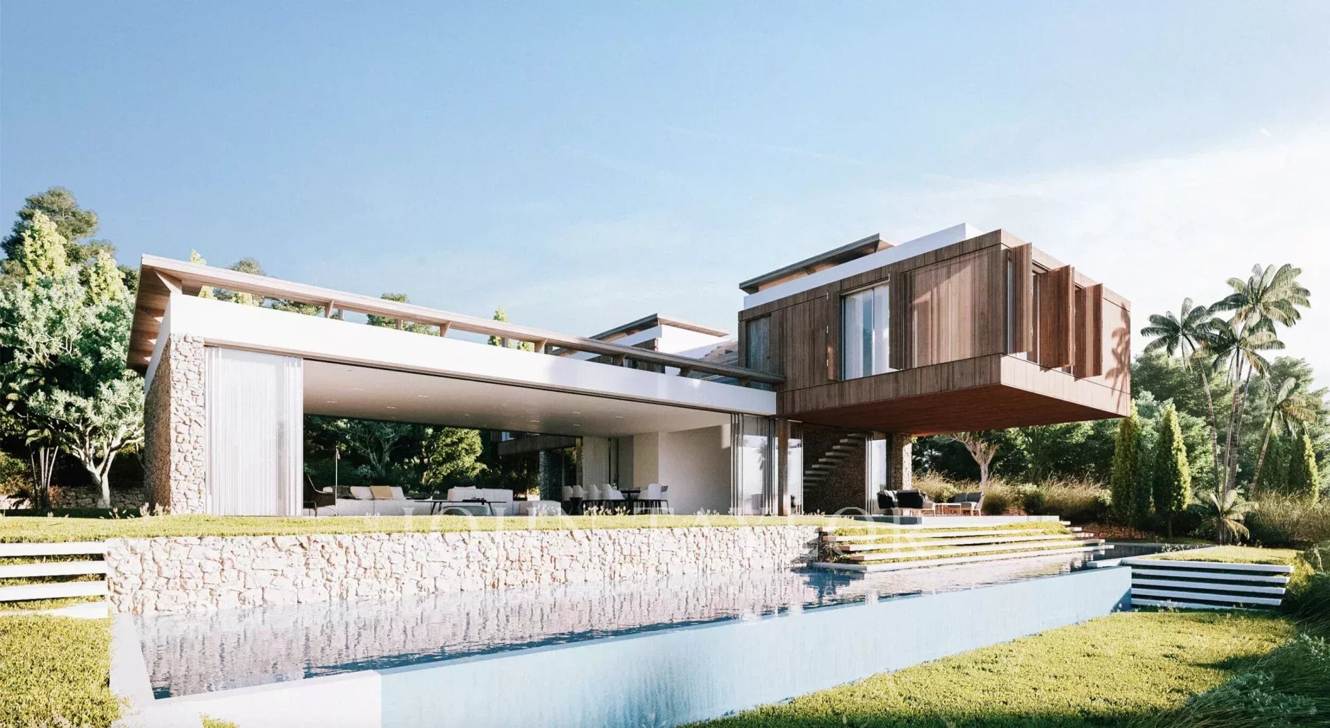 Все инженерные системы спроектированы с учетом эффективности и устойчивости: кондиционирование VRV с экологическим газом, теплый пол, аэротермальные тепловые насосы, умные электросистемы, современное управление водой с циркуляцией и сбором дождевой воды. Бесконечный бассейн идеально интегрирован в архитектуру и оснащен современными системами фильтрации и очистки воды. Встроенное светодиодное освещение подчеркивает геометрию и атмосферу виллы ночью.