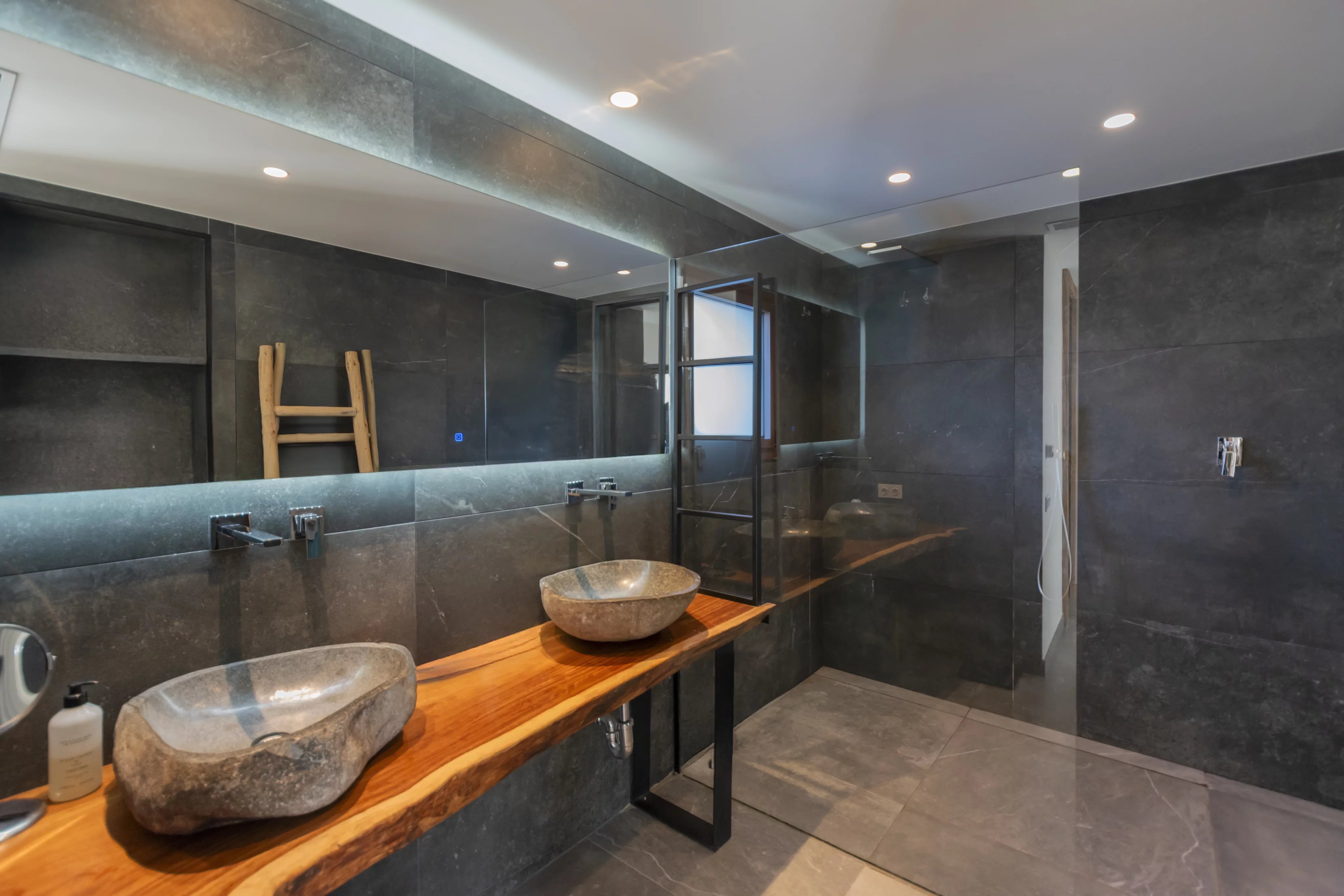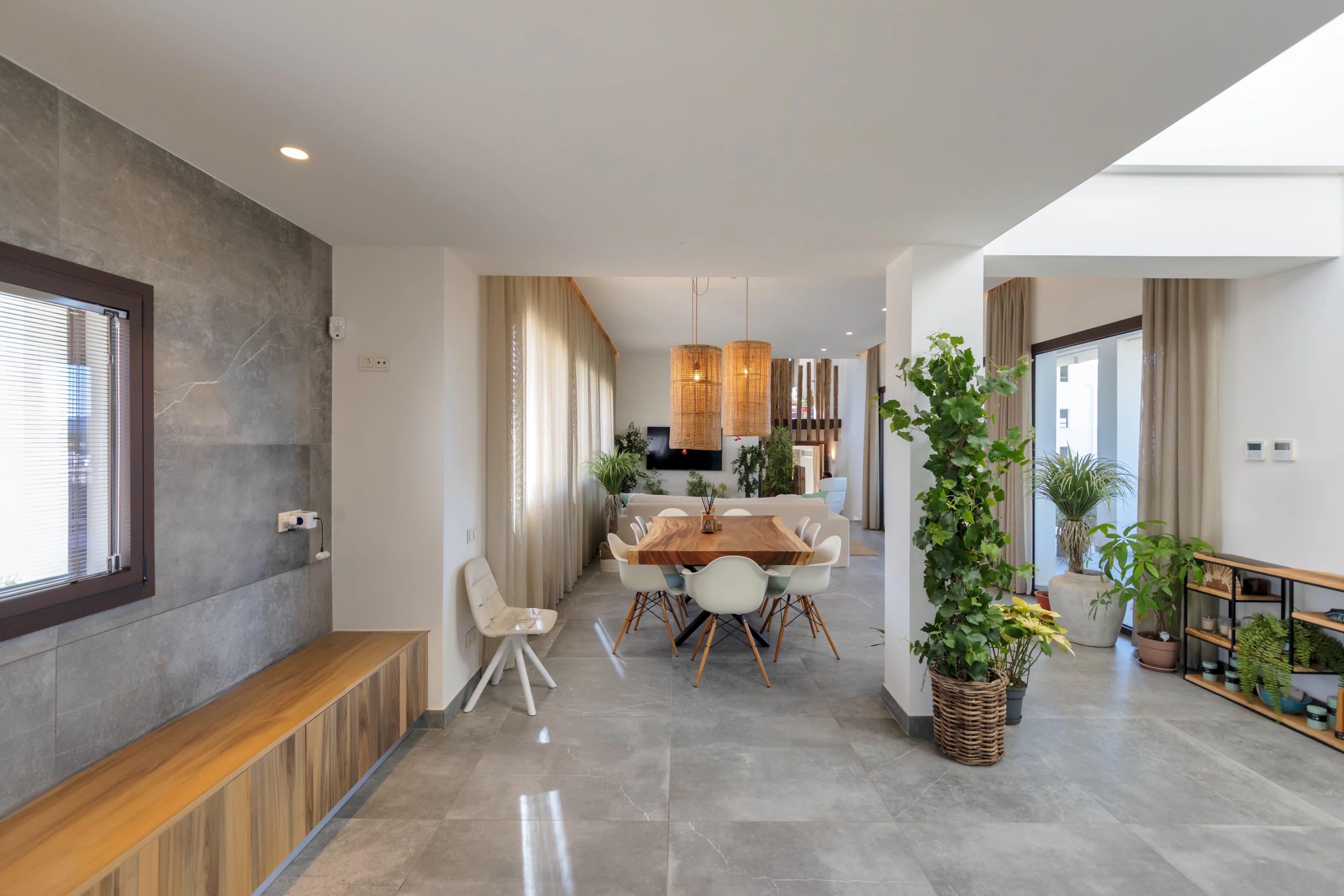 Центральным элементом дома является элегантная гостиная-столовая с кухней открытого плана, большими панорамными окнами и прямым выходом на террасы и к частному бассейну, что делает пространство идеальным как для повседневной жизни, так и для приёма гостей.