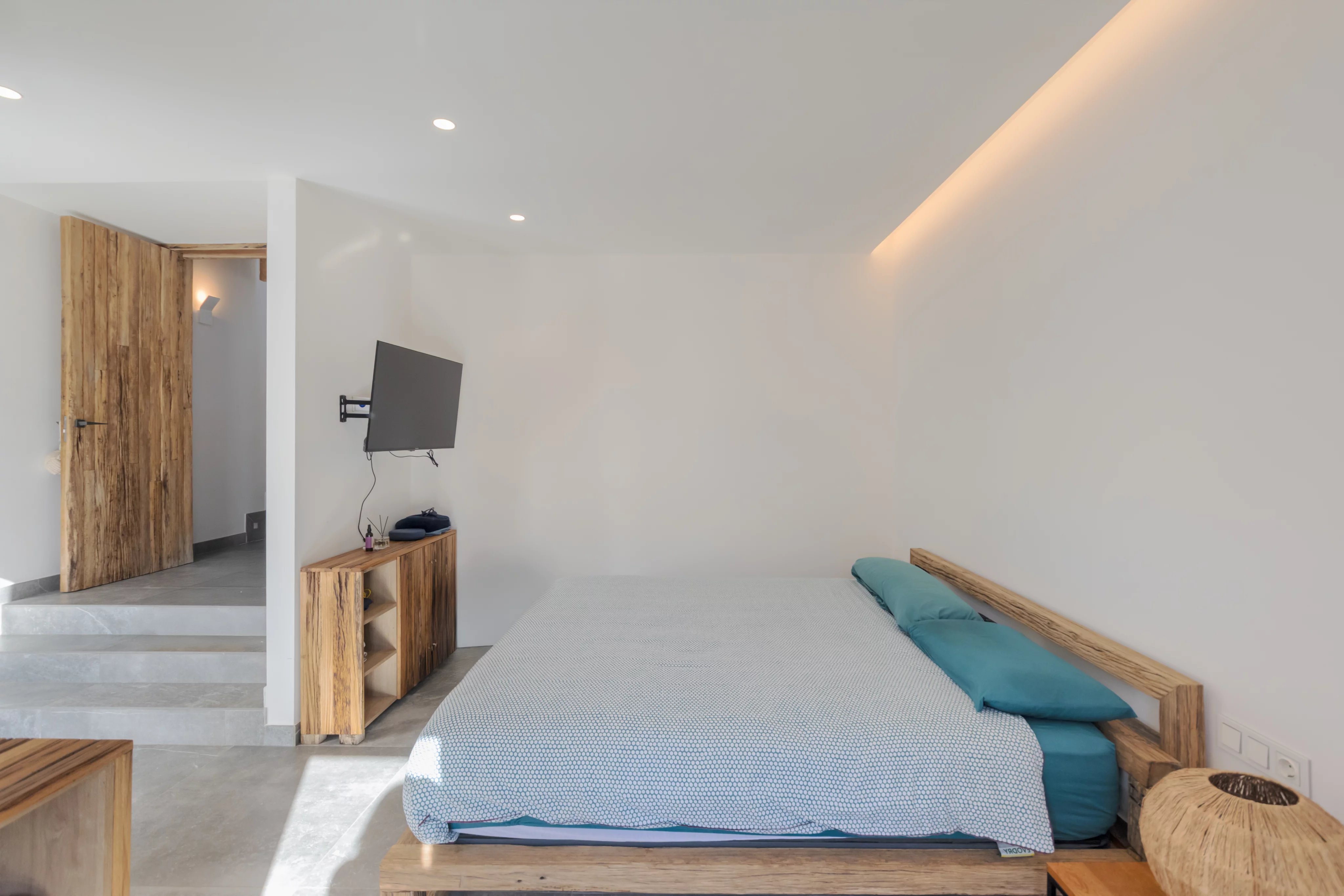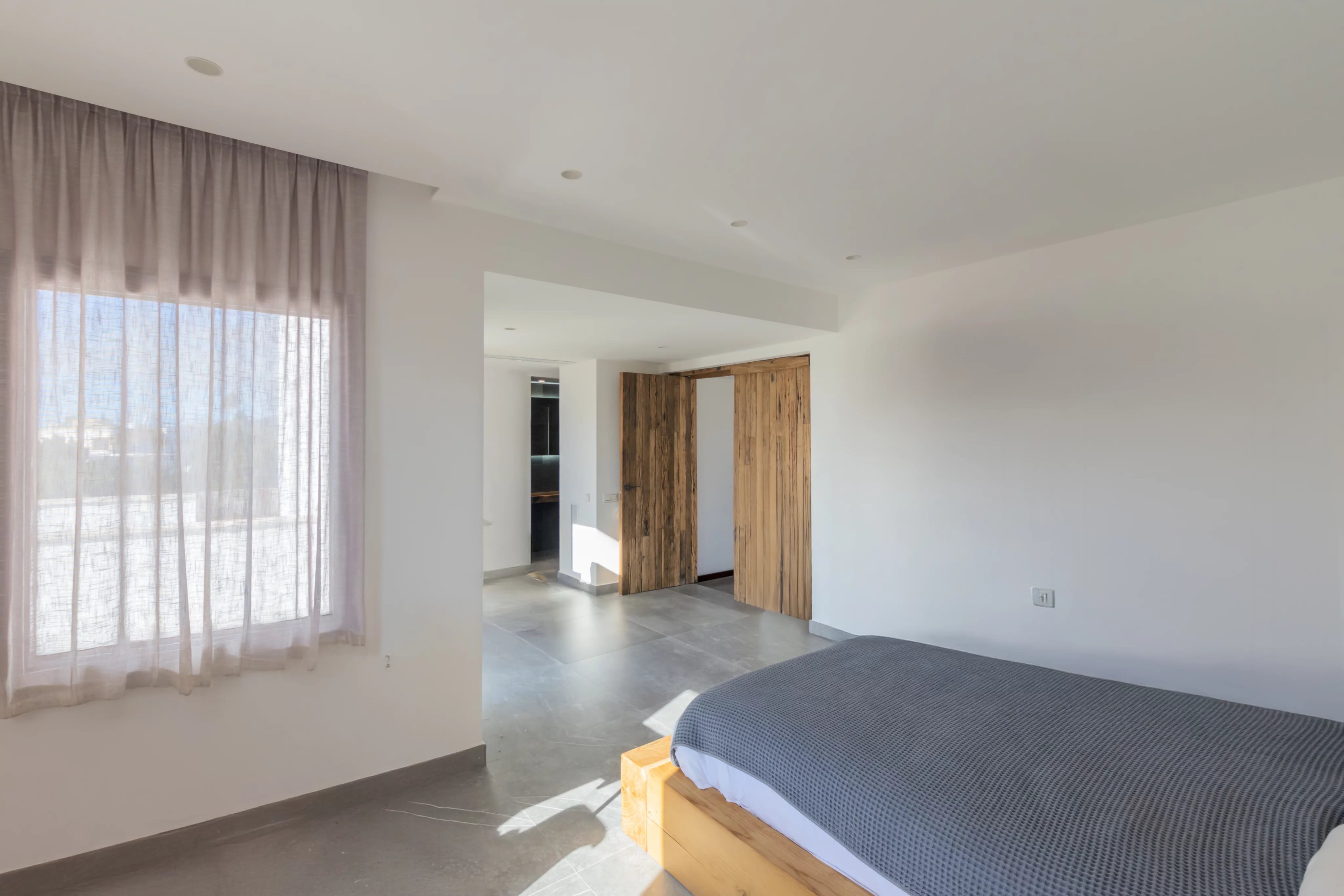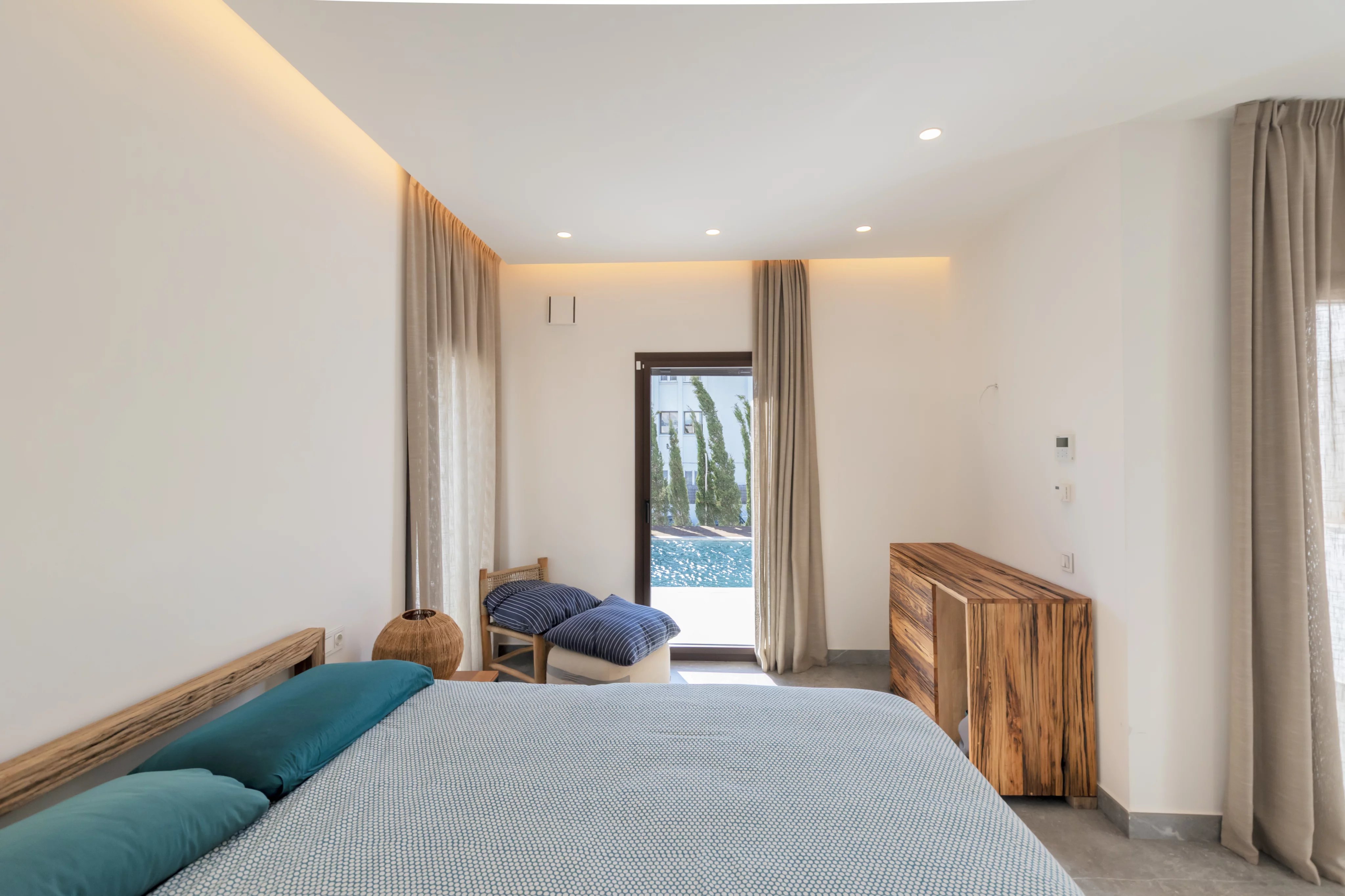В спальной зоне расположены три спальни с двуспальными кроватями, каждая с собственной ванной комнатой, а также гостевой санузел, прачечная и несколько кладовых помещений. Террасы, сад и бассейн позволяют наслаждаться средиземноморским климатом круглый год.