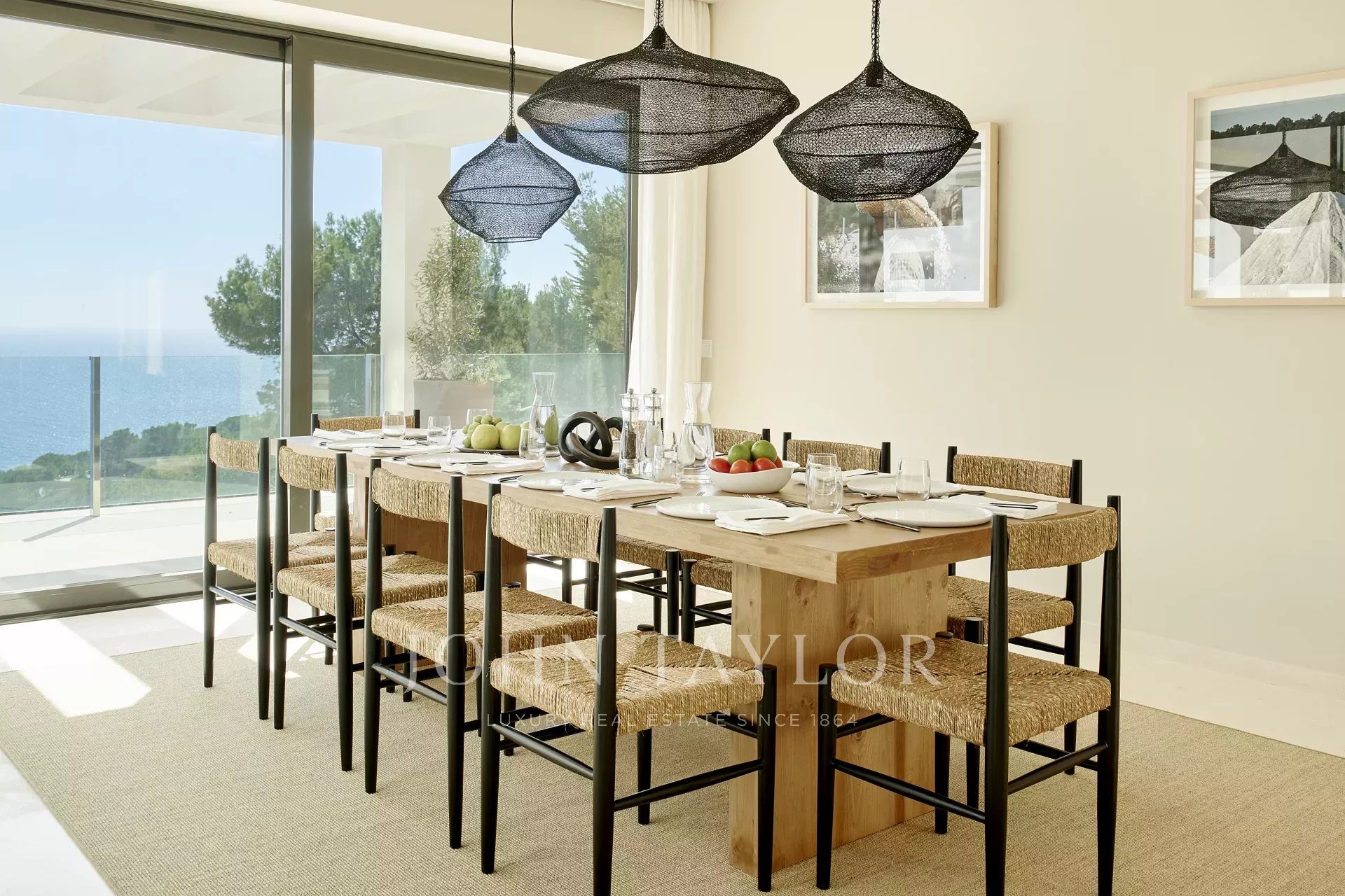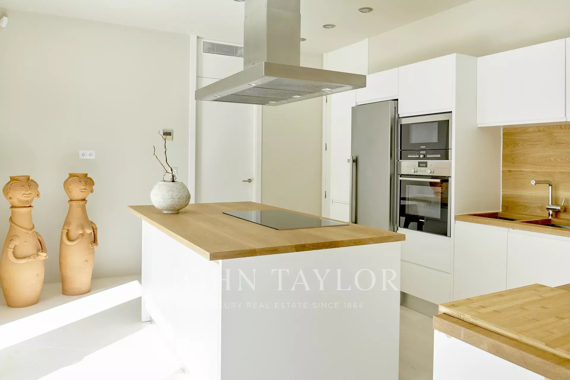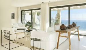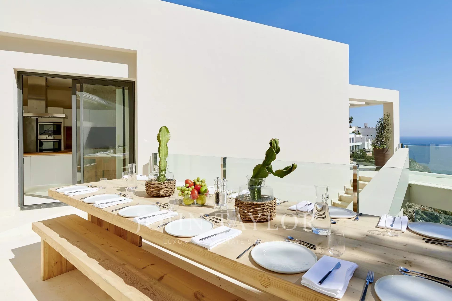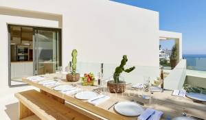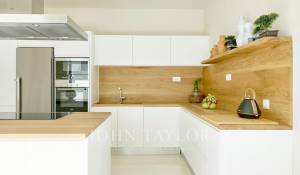 Войдя в собственность, вы окажетесь в светлой и просторной гостиной открытого плана, с эффектной стеклянной стеной, соединяющей внутреннее пространство с просторной частично крытой террасой, идеально подходящей для отдыха и наслаждения видом на море. Кухня, оборудованная высококачественной техникой Siemens и современной индукционной плитой, расположена рядом со столовой, создавая идеальную атмосферу для семейной жизни и развлечений.