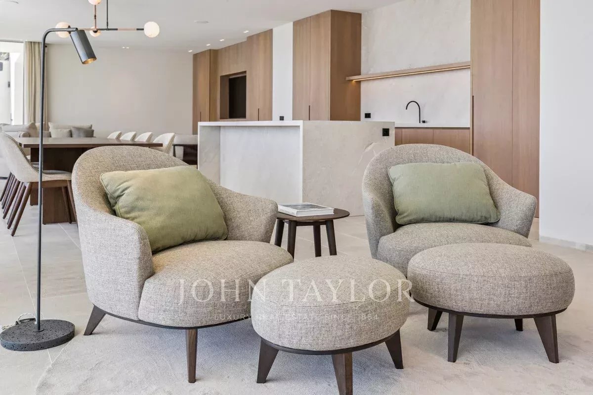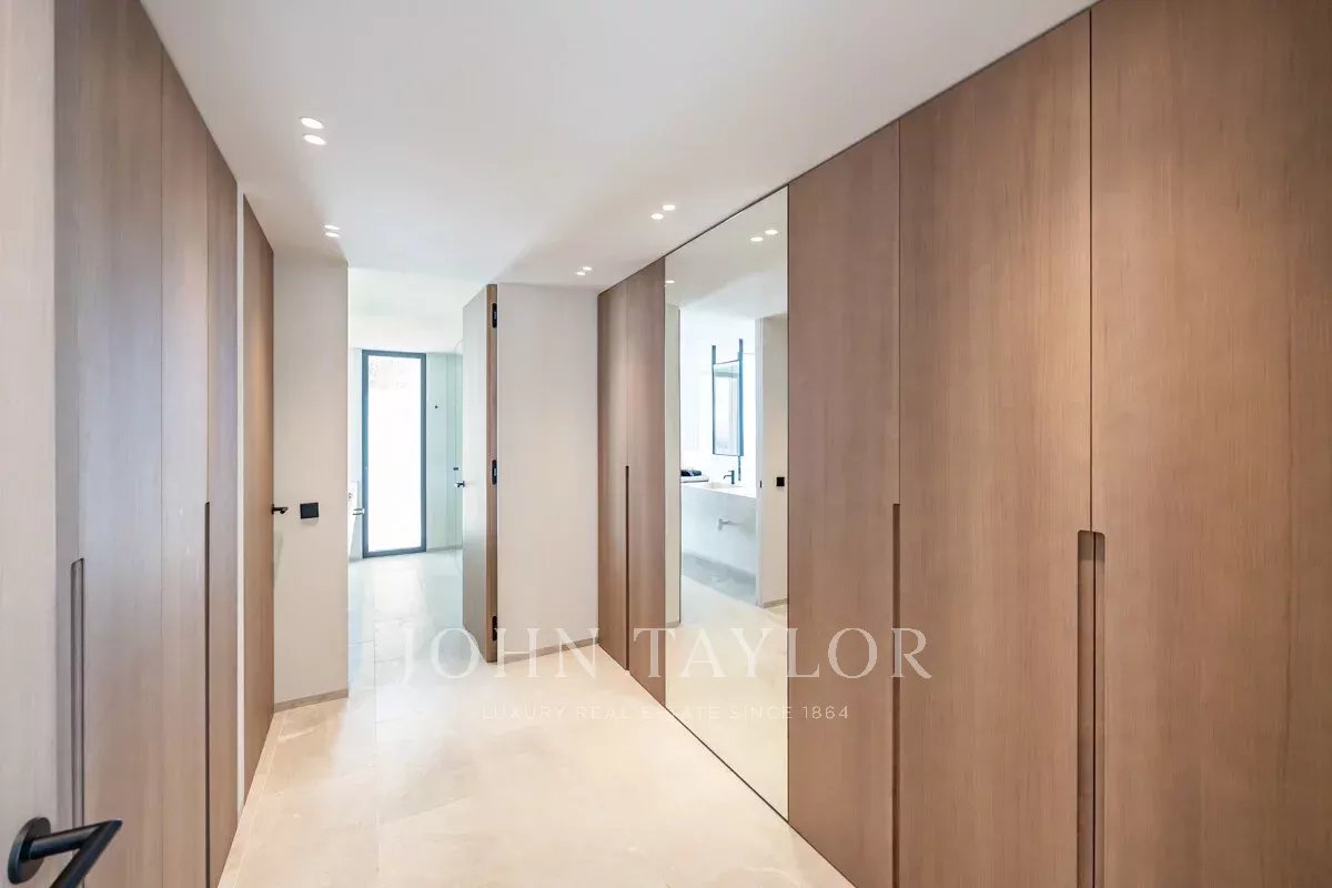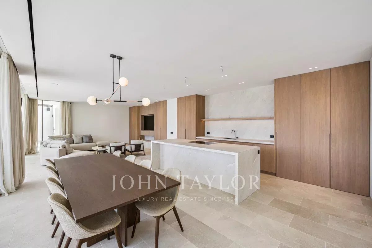 Каждая деталь выполнена в соответствии с высочайшими стандартами: дубовые столярные изделия, изготовленные на заказ, - от неброских межкомнатных дверей до кухонных шкафов - создают изысканную, плавную эстетику во всем доме. На первом этаже с открытой планировкой расположены современная кухня, столовая и гостиная, залитые естественным светом и выходящие прямо в сад с ландшафтным дизайном и частным бассейном.