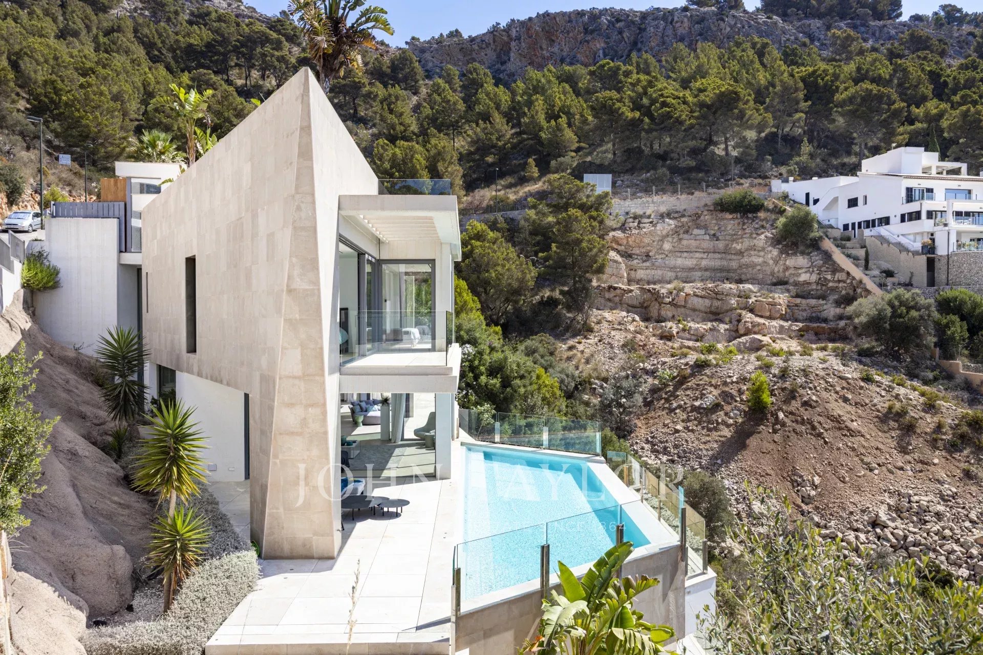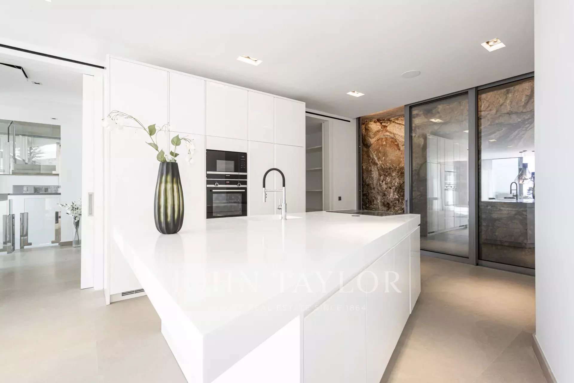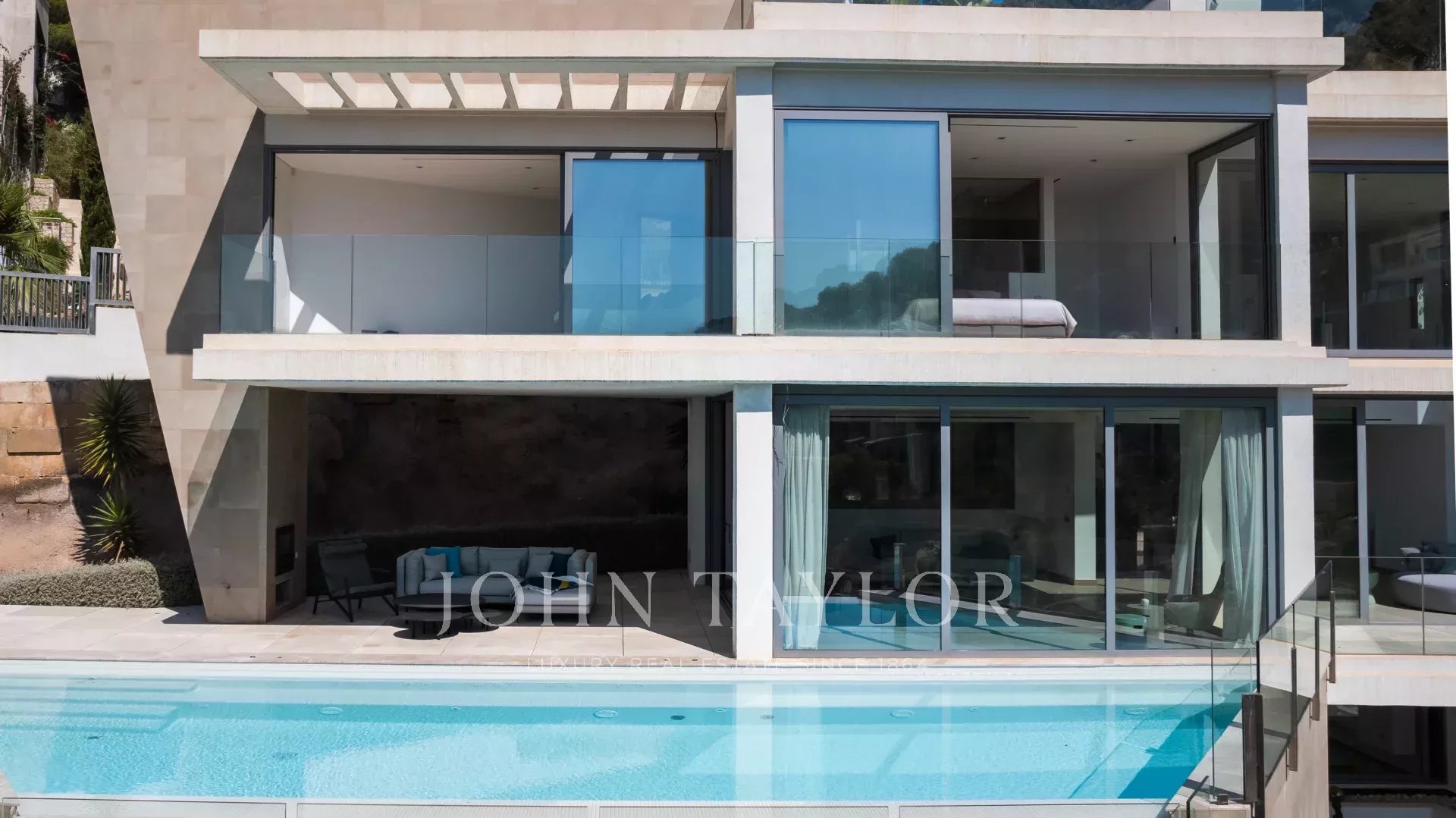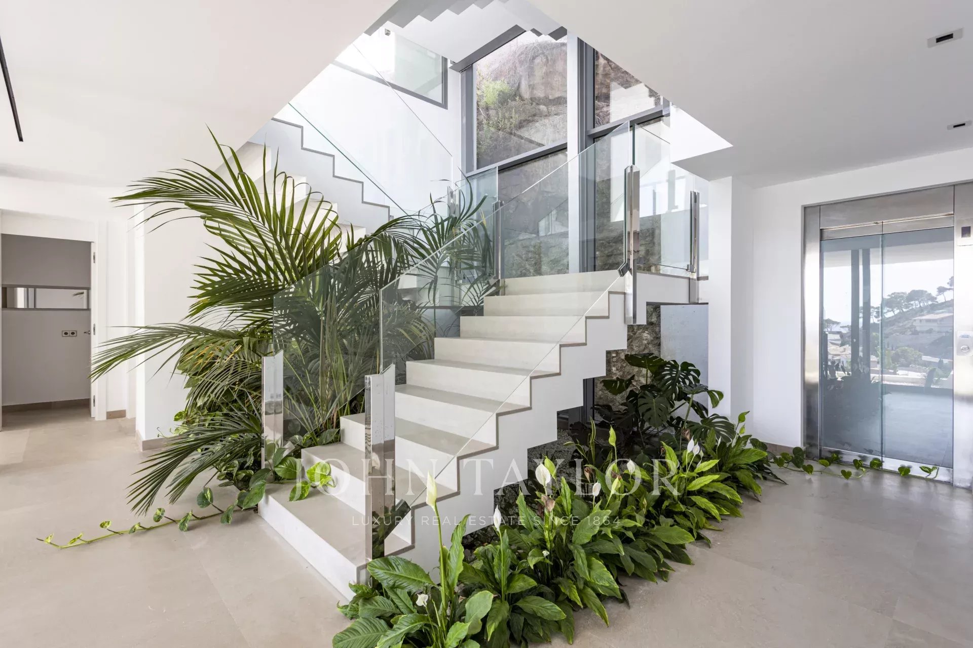 Особняк выделяется своим внушительным архитектурным дизайном и стеклянным фасадом, обращенным к морю, что обеспечивает максимальное естественное освещение и вид на море из каждой комнаты. При въезде в частный гараж имеется лифт и лестница, ведущая на нижние этажи. На втором уровне расположены три спальни с ванными комнатами. Третий уровень полностью посвящен повседневной жизни. Полностью оборудованная кухня и столовая легко переходят в гостиную с прямым доступом к внешнему холлу с уютным камином, террасе и бассейну. Нижний уровень включает в себя зону домашнего кинотеатра и частный тренажерный зал. При строительстве использовались только самые высокие качества, такие как центральное кондиционирование, полы с подогревом, система осмоса и домашняя автоматика.