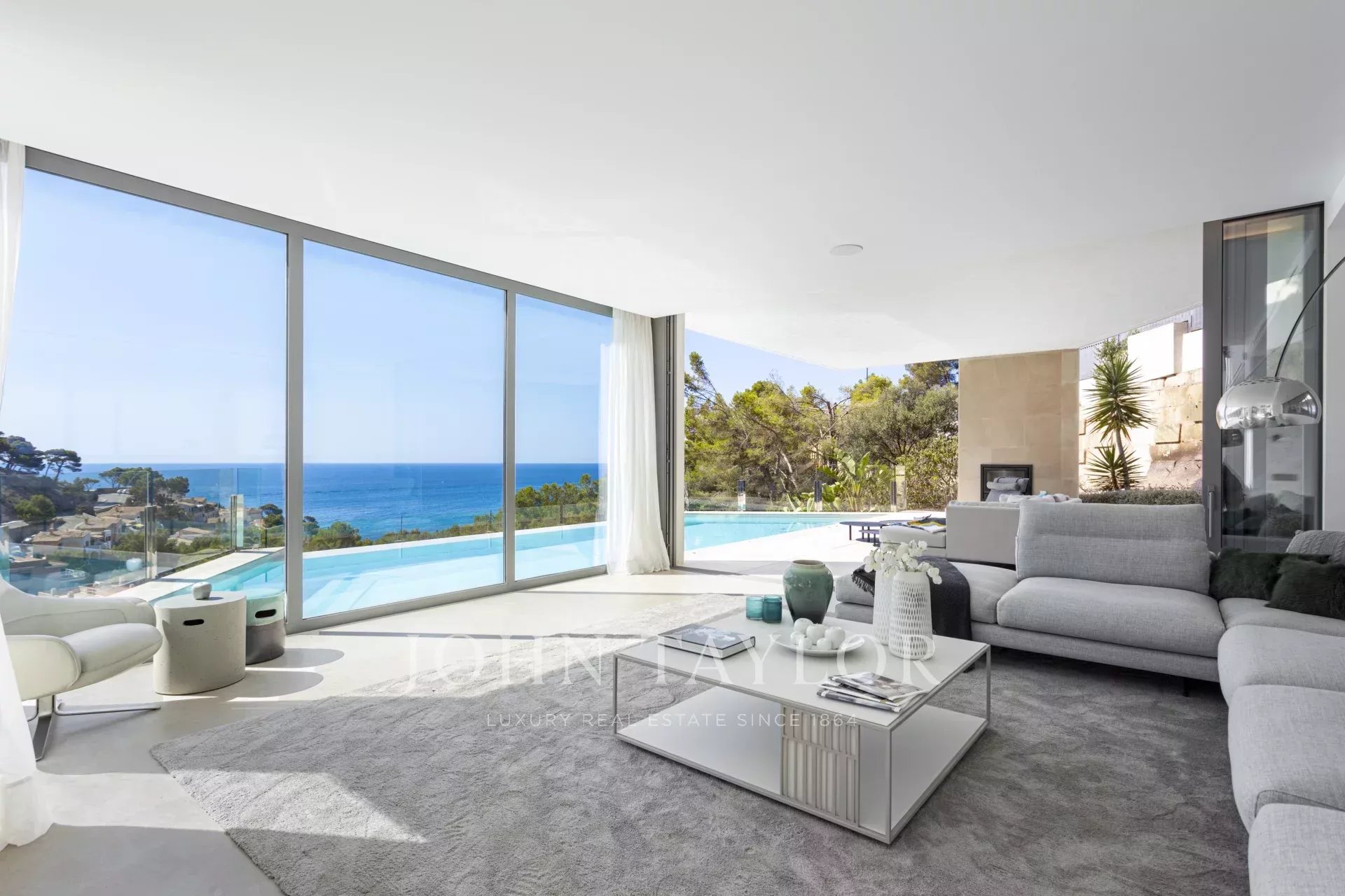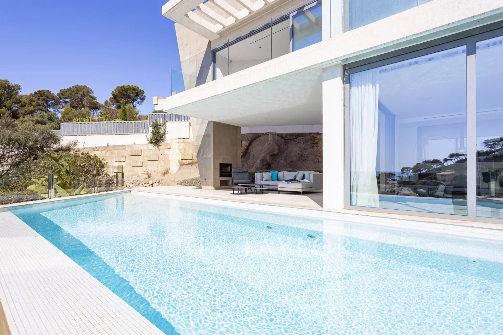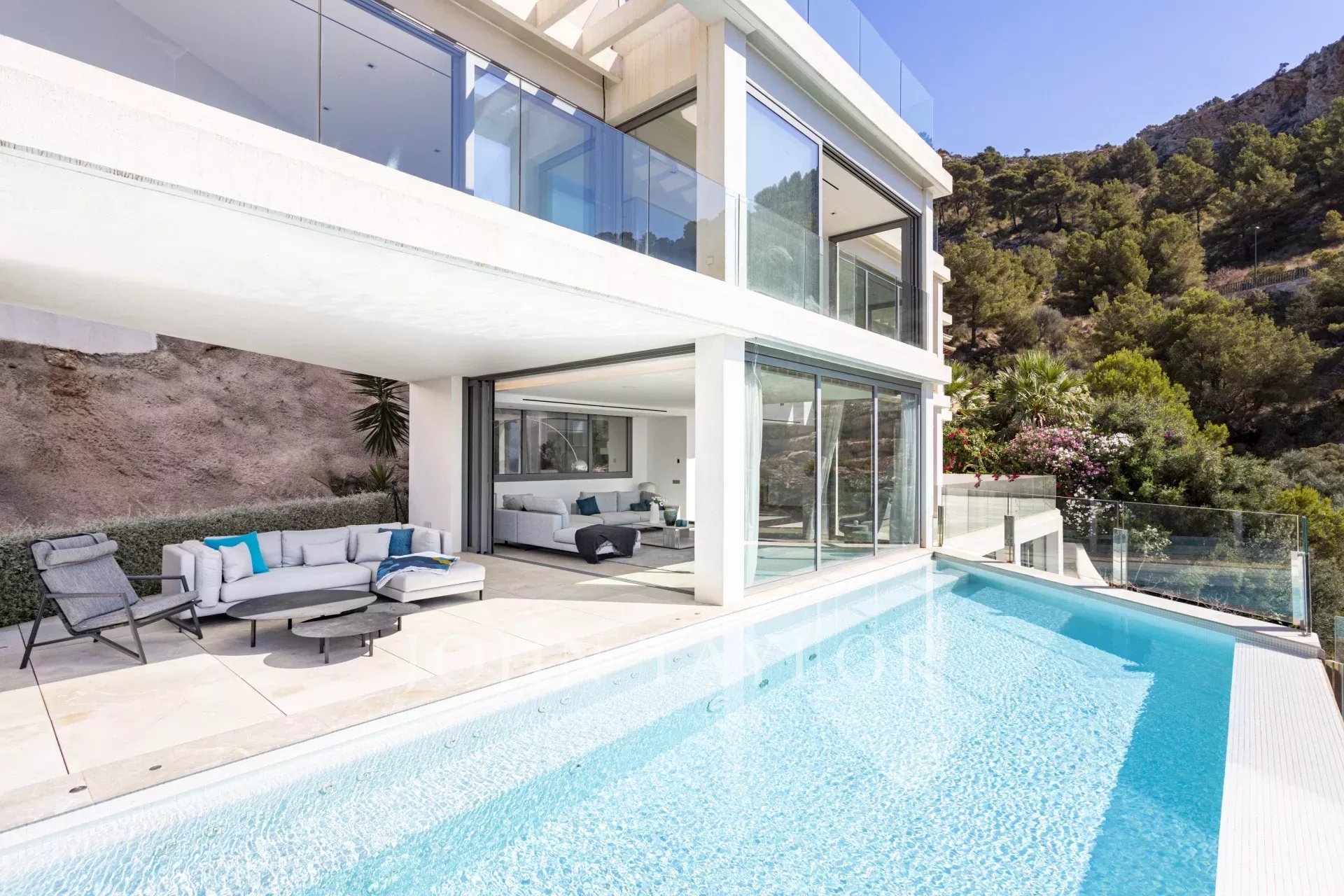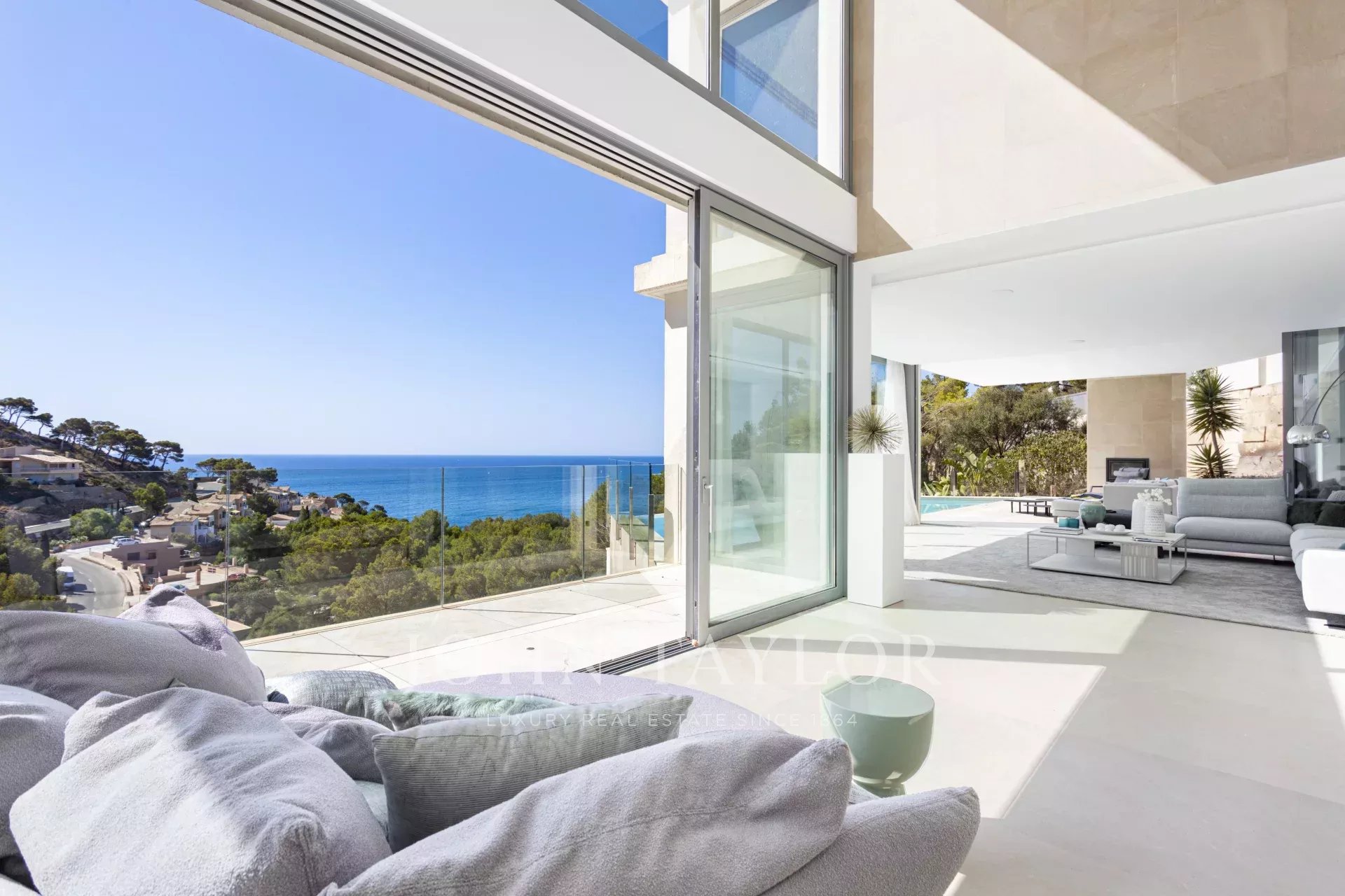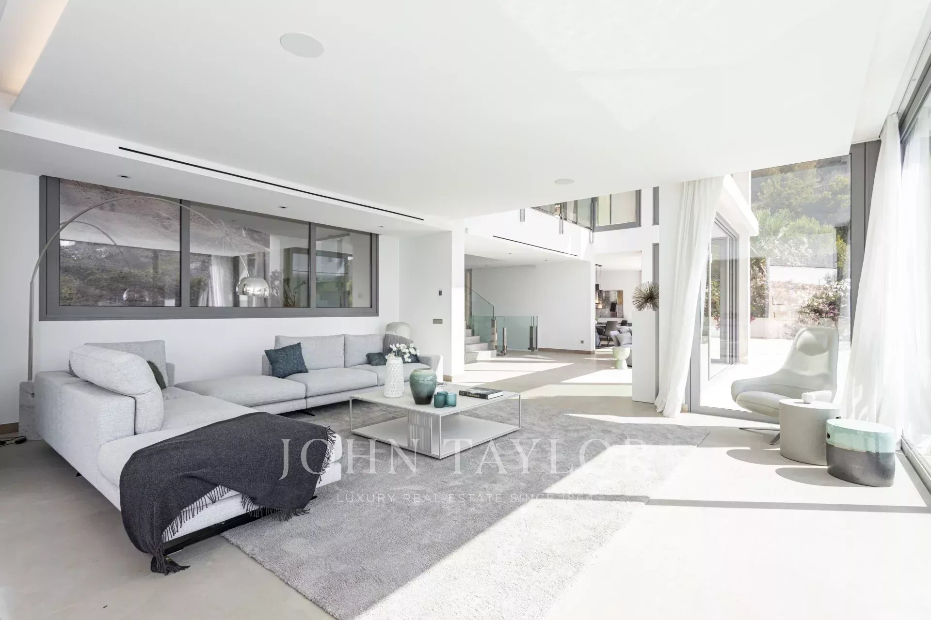 Особняк выделяется своим внушительным архитектурным дизайном и стеклянным фасадом, обращенным к морю, что обеспечивает максимальное естественное освещение и вид на море из каждой комнаты. При въезде в частный гараж имеется лифт и лестница, ведущая на нижние этажи. На втором уровне расположены три спальни с ванными комнатами. Третий уровень полностью посвящен повседневной жизни. Полностью оборудованная кухня и столовая легко переходят в гостиную с прямым доступом к внешнему холлу с уютным камином, террасе и бассейну. Нижний уровень включает в себя зону домашнего кинотеатра и частный тренажерный зал. При строительстве использовались только самые высокие качества, такие как центральное кондиционирование, полы с подогревом, система осмоса и домашняя автоматика.
