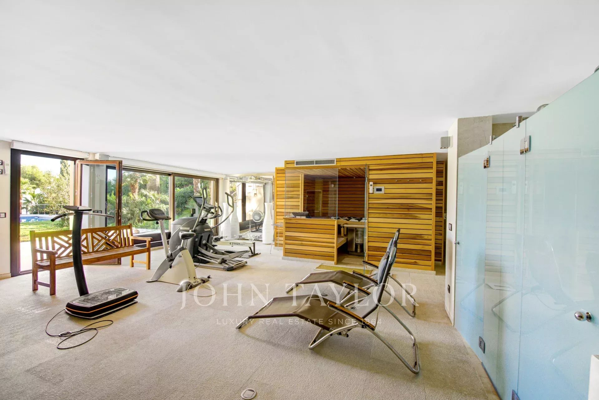 На нижнем этаже расположены гостиная, небольшая кухня и 2 спальни с ванными комнатами. Спа- и фитнес-зона состоит из сауны, турецкой бани, ванной комнаты и тренажерного зала с разнообразными тренажерами. Эта зона прекрасно соединяется с террасой с джакузи, откуда можно выйти в большой сад с солярием, бассейном и площадкой для мультиспорта. Здесь же находится квартира для обслуживающего персонала.