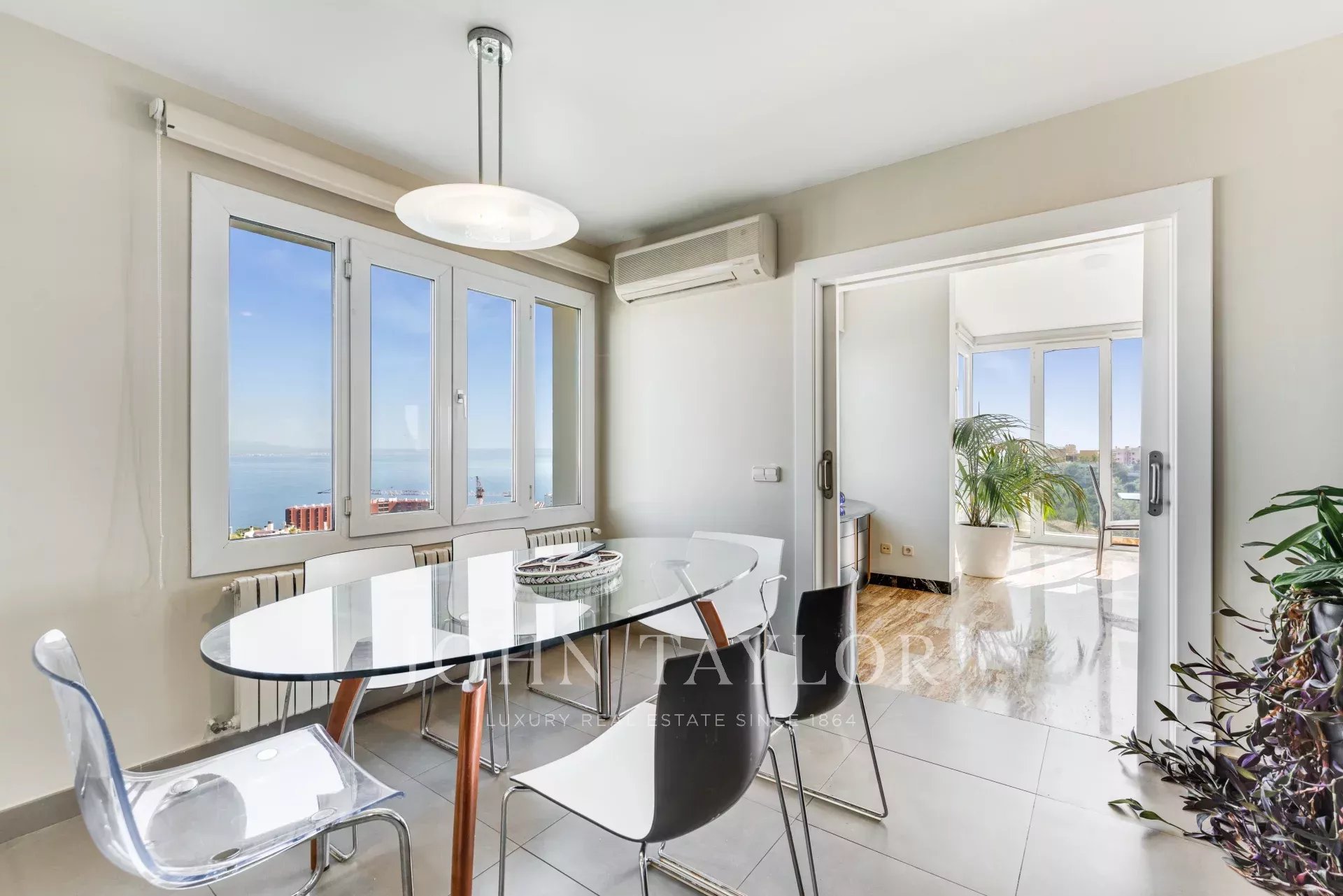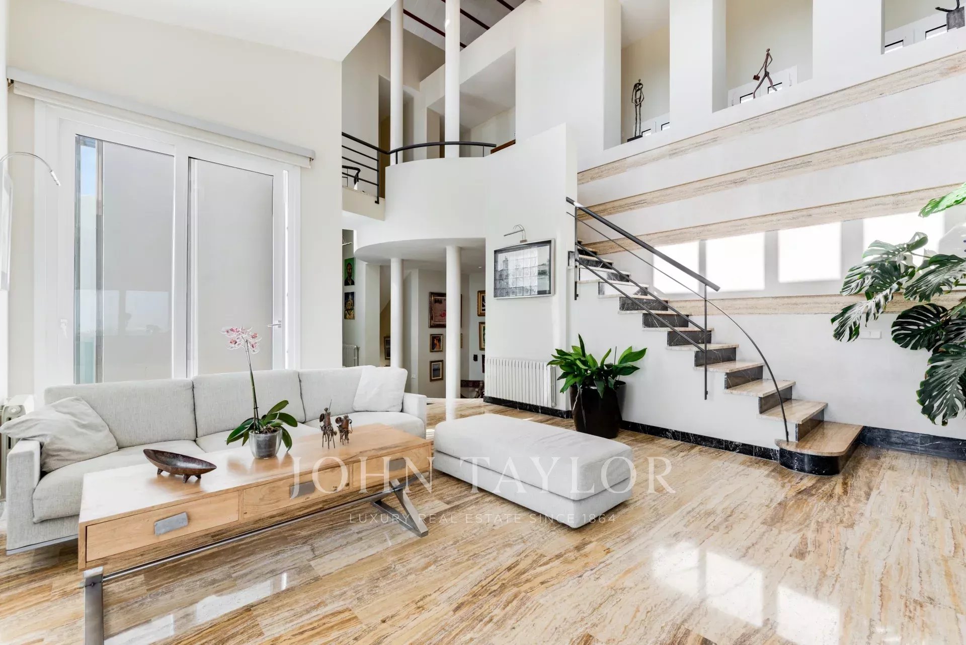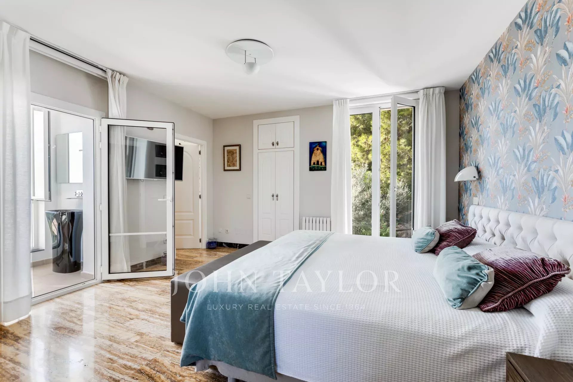 Вилла, выходящая на юго-восток, разделена на различные зоны. Здесь находится дневная зона, где расположены гостиная, столовая, кухня и кабинет. В другой части дома находятся 5 спален и 3 ванные комнаты. Кроме того, есть отдельная квартира для гостей и зона для обслуживающего персонала. На первом этаже на одном уровне с солнечной террасой с бассейном и джакузи находится вторая гостиная и просторная комната двойной высоты, которая предлагает различные возможности использования, такие как тренажерный зал, мастерская, игровая комната и т.д.