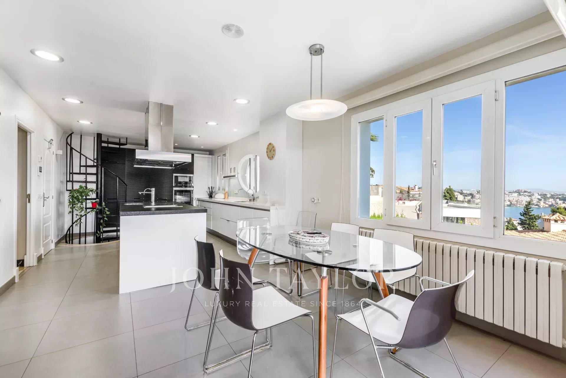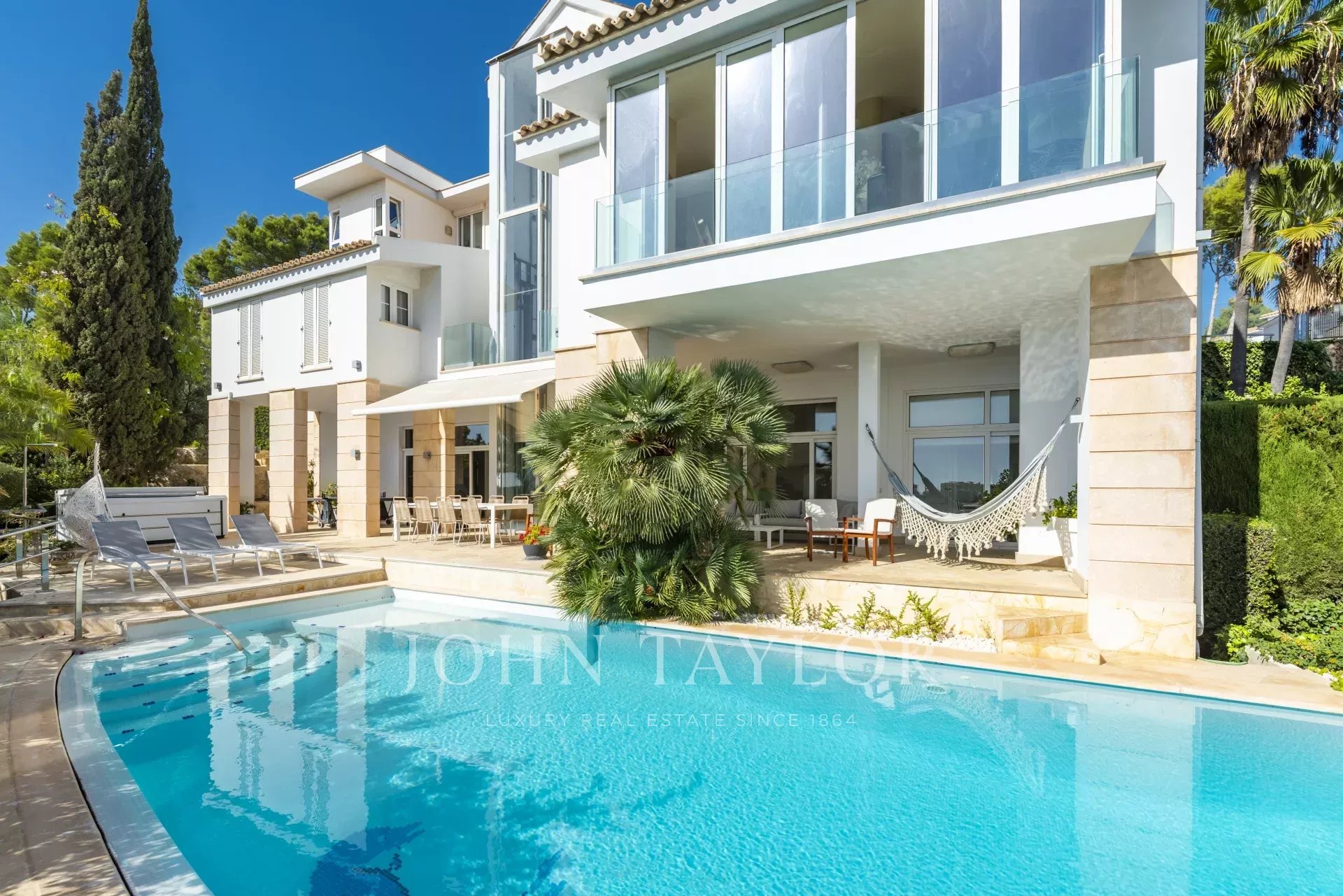 Роскошная вилла с видом на море и лицензией на аренду в Кас Катала. Этот дом с оригинальной архитектурой и высокими потолками расположен в прекрасном месте в верхней части тихого жилого района Кас Катала. Благодаря своему возвышенному положению почти из каждой комнаты дома открывается сказочный вид на залив Пальмы.