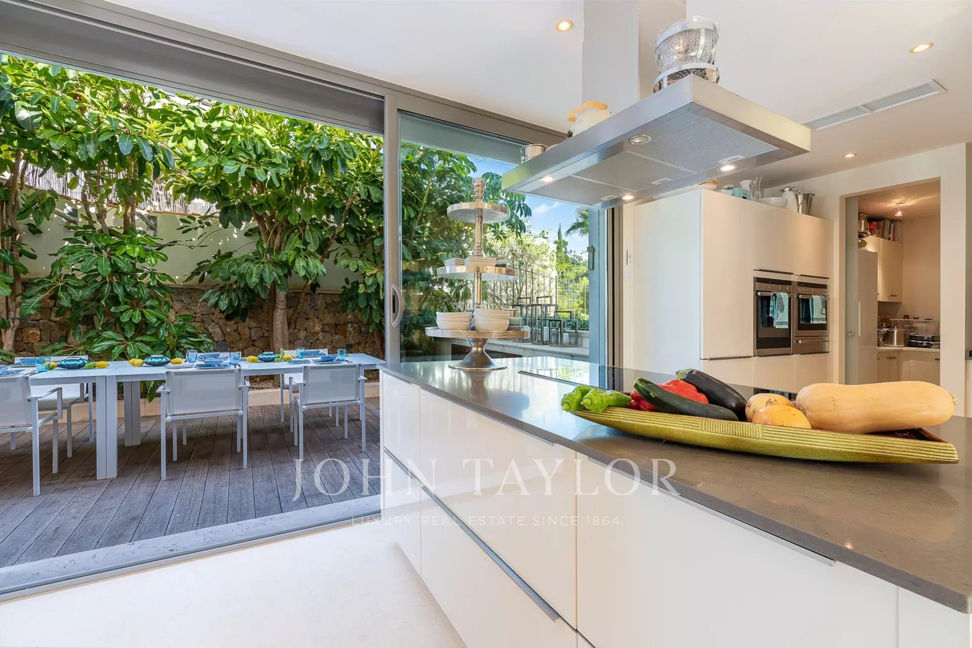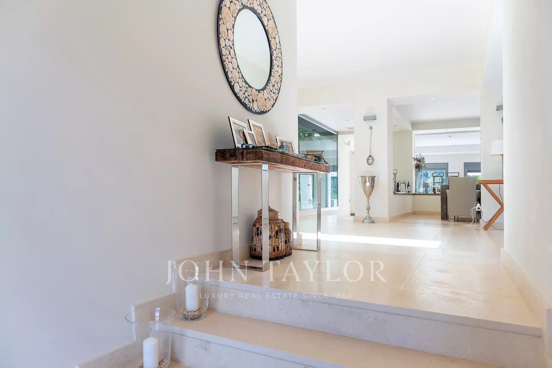 При входе на первый этаж вас встречает элегантный холл, за которым следуют гостевой туалет, спальня, полностью оборудованная кухня и столовая с выходом на боковую террасу. Гостиная выходит на переднюю террасу и бассейн, откуда открывается уникальный панорамный вид, который прекрасно сочетается с пышной растительностью и делает каждое посещение уникальным.