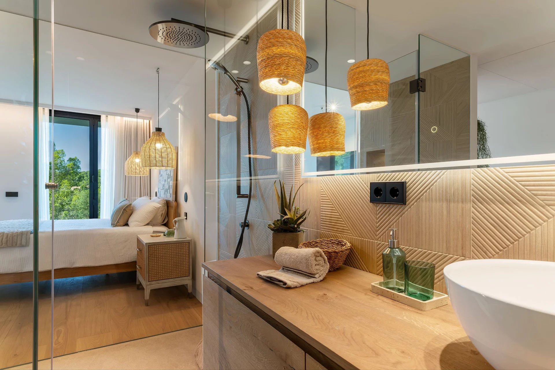 Дизайн выходит на улицу благодаря нескольким террасам, которые максимально используют солнечный свет Майорки, создавая открытые жилые пространства, идеальные для звездных вечеров или посиделок на свежем воздухе. Бесконечный бассейн, словно оазис спокойствия, контрастирует с ярким небом и создает идеальную обстановку для отдыха, а частный кабинет или библиотека с непревзойденным видом добавляют нотку изысканности в окружающую обстановку.