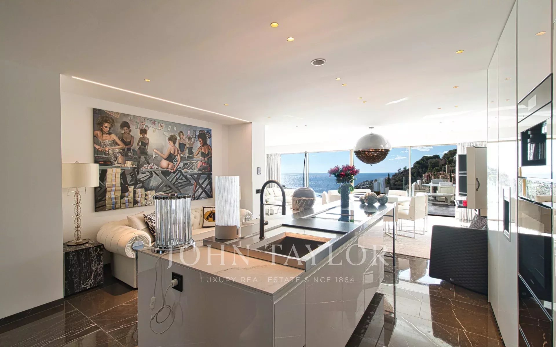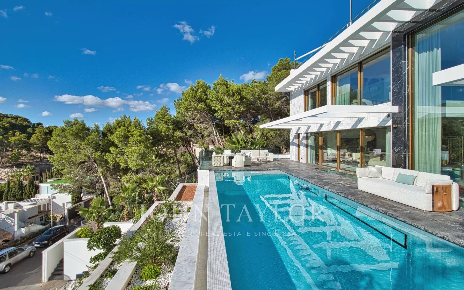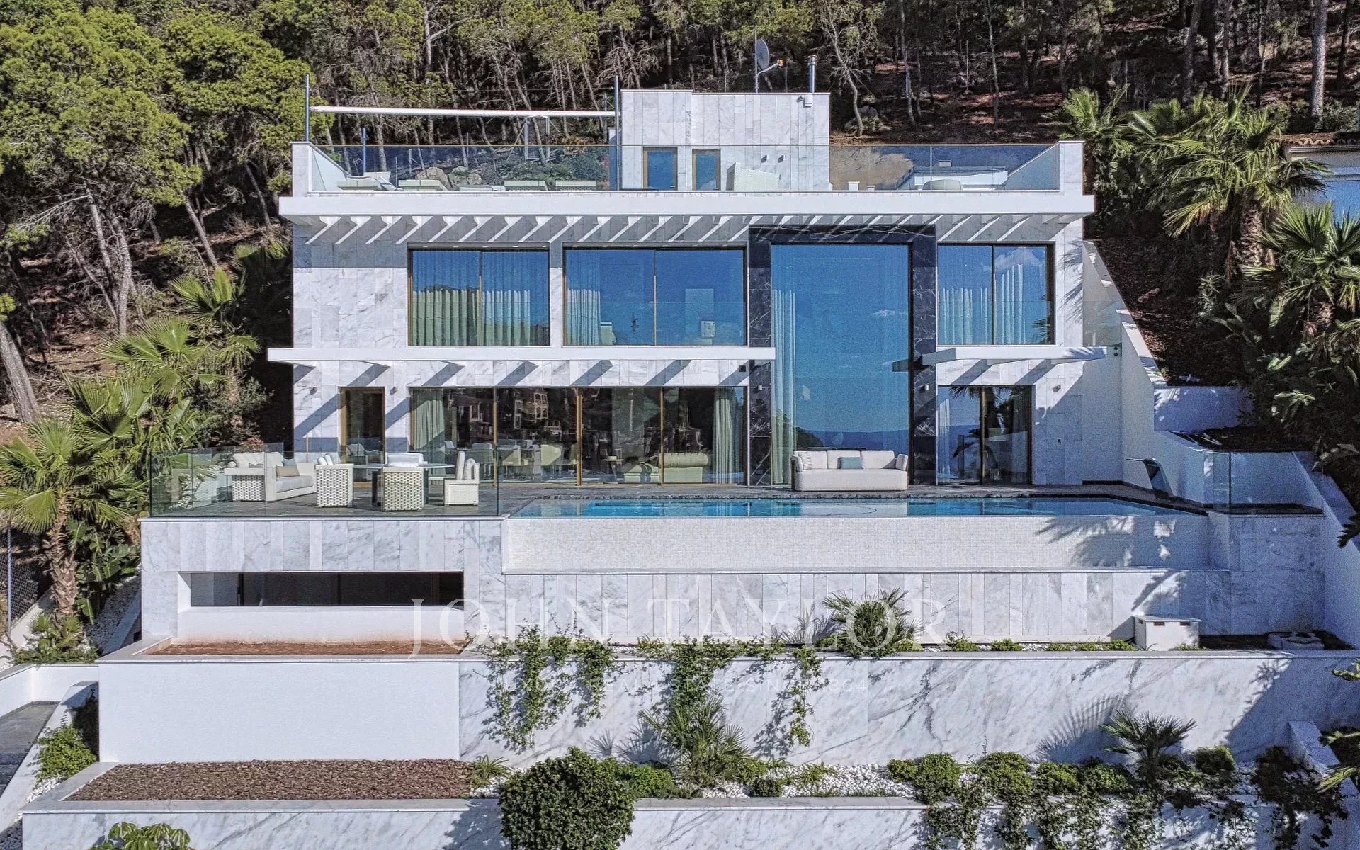 Внутри на трех уровнях раскинулись изысканные помещения площадью 532 м²: мир безмятежной утонченности и захватывающих дух видов на море. На главном этаже находится просторная, наполненная светом гостиная с большими окнами, обрамляющими средиземноморский горизонт. Дизайнерская кухня от Poliform сочетает в себе форму и функциональность с техникой Miele, Gaggenau и Bora, а прямой выход на террасу приглашает вас испытать окончательное слияние жизни в помещении и на открытом воздухе. Бесконечный бассейн словно сливается с морем, создавая атмосферу бесконечного спокойствия.