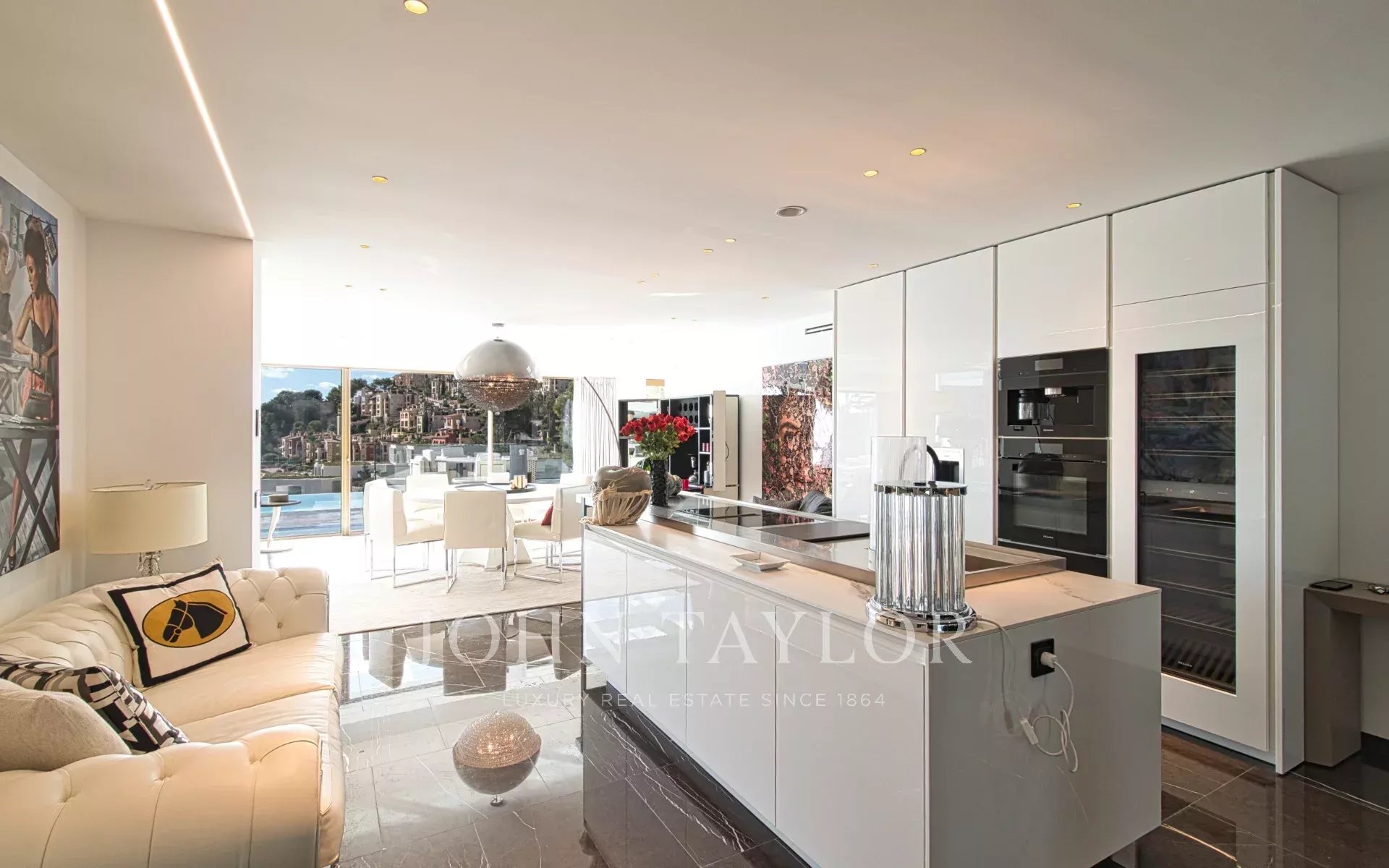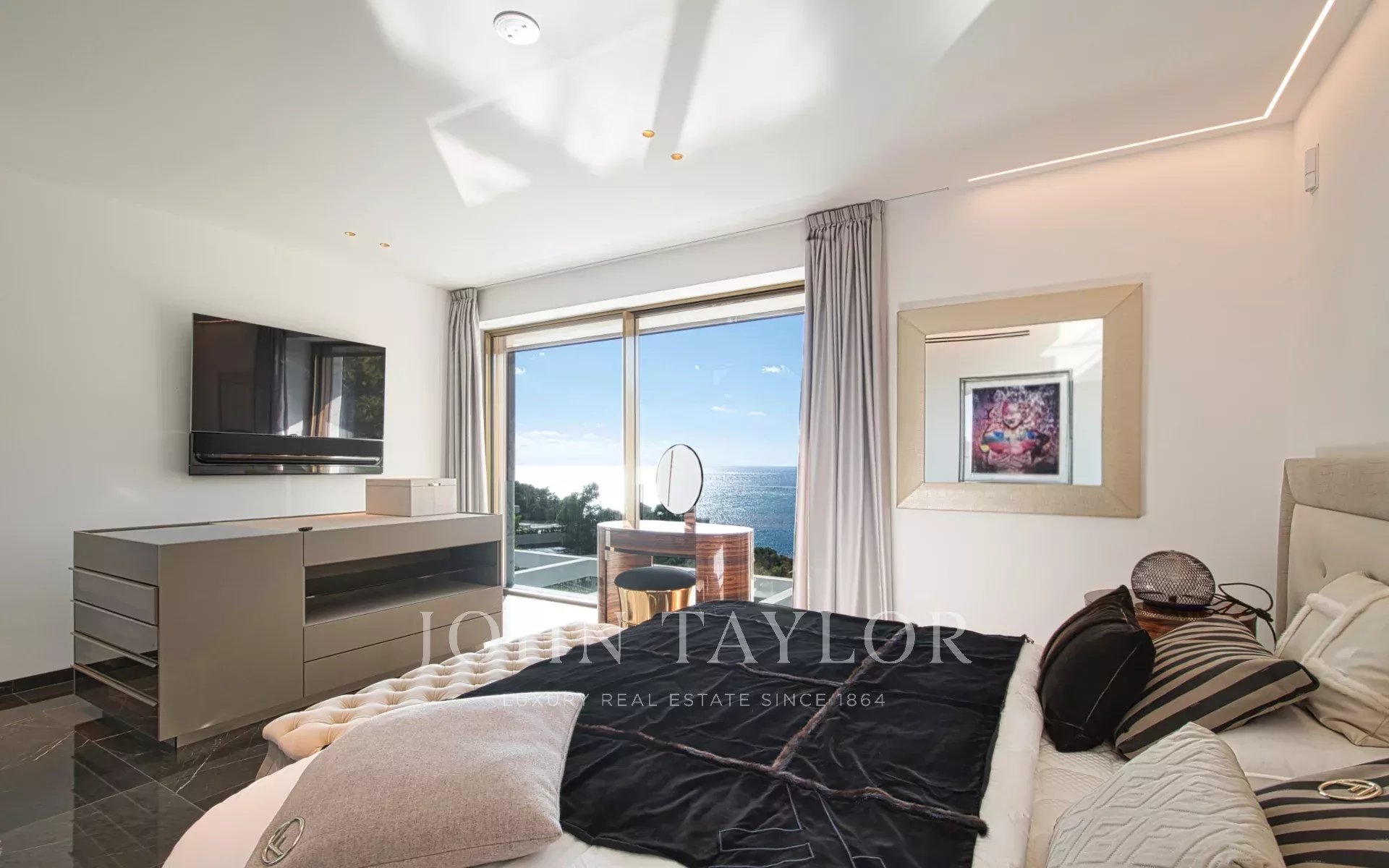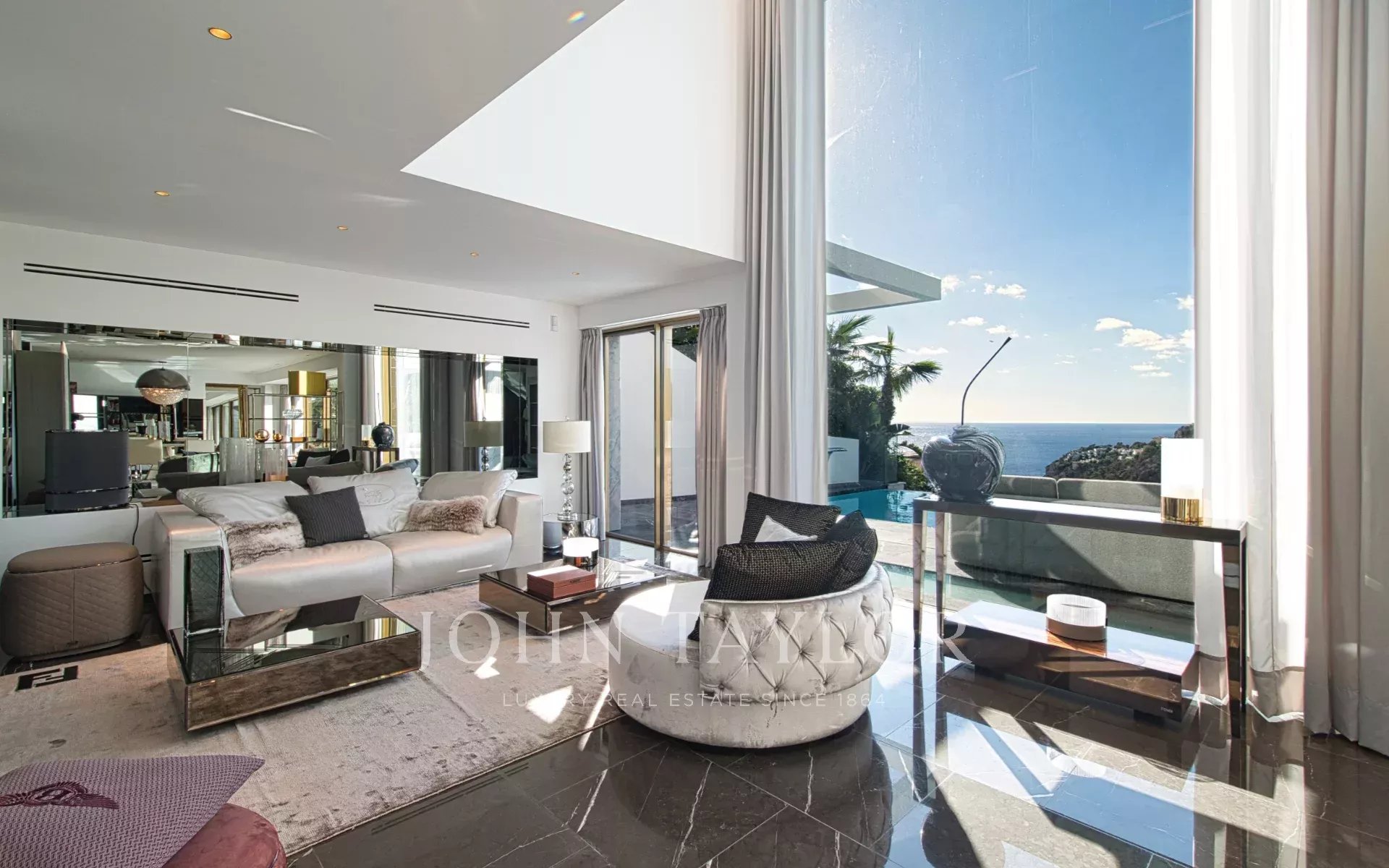 Внутри на трех уровнях раскинулись изысканные помещения площадью 532 м²: мир безмятежной утонченности и захватывающих дух видов на море. На главном этаже находится просторная, наполненная светом гостиная с большими окнами, обрамляющими средиземноморский горизонт. Дизайнерская кухня от Poliform сочетает в себе форму и функциональность с техникой Miele, Gaggenau и Bora, а прямой выход на террасу приглашает вас испытать окончательное слияние жизни в помещении и на открытом воздухе. Бесконечный бассейн словно сливается с морем, создавая атмосферу бесконечного спокойствия.