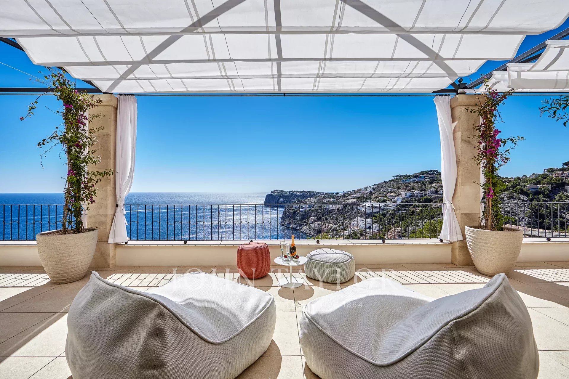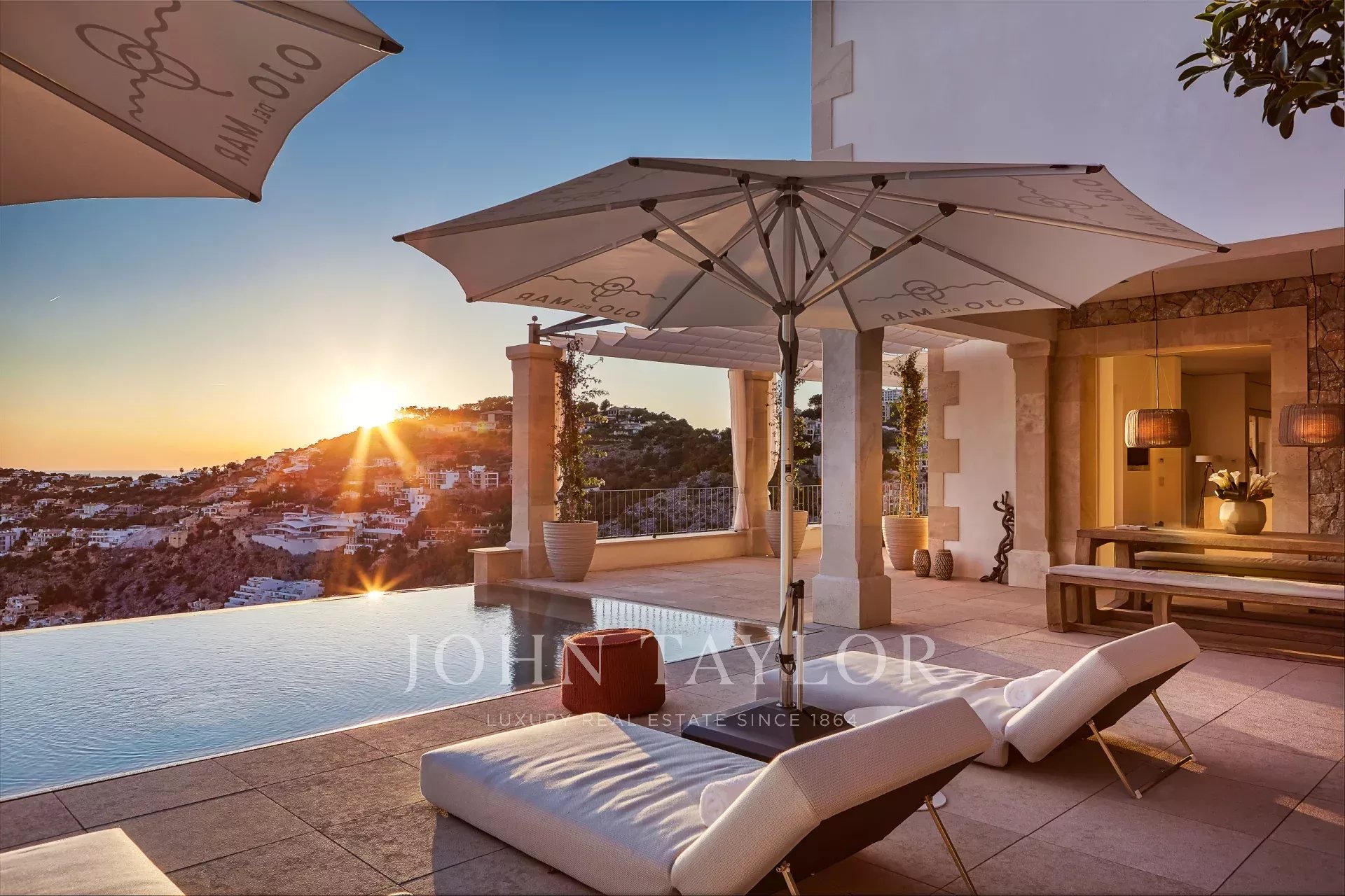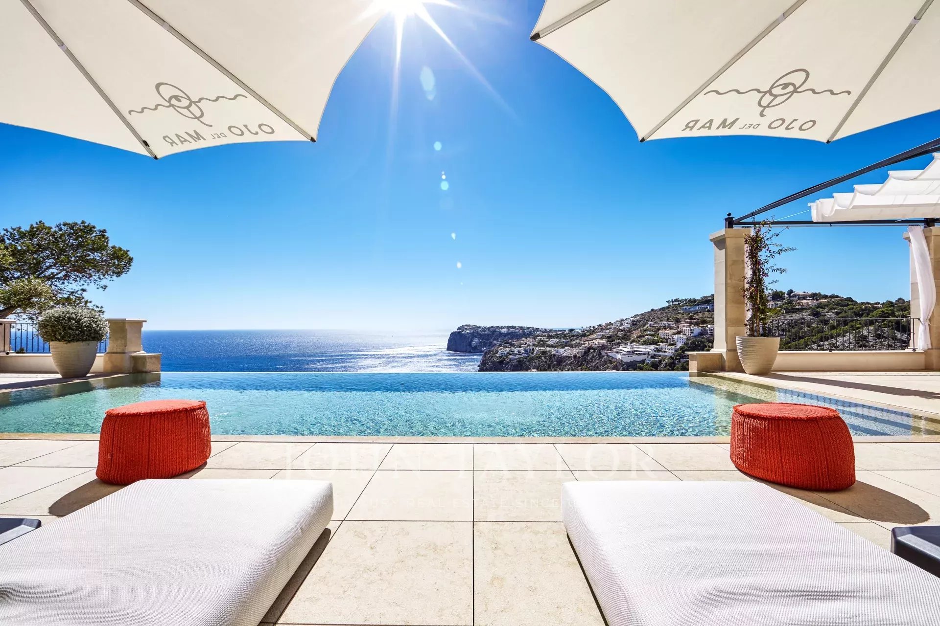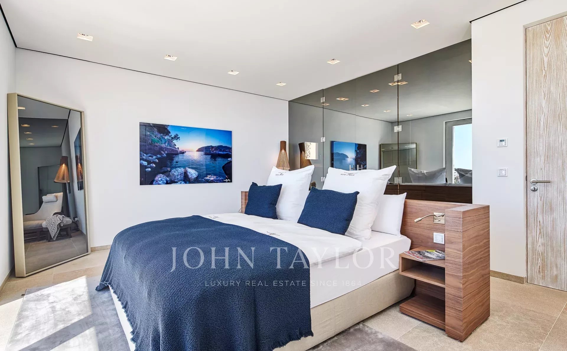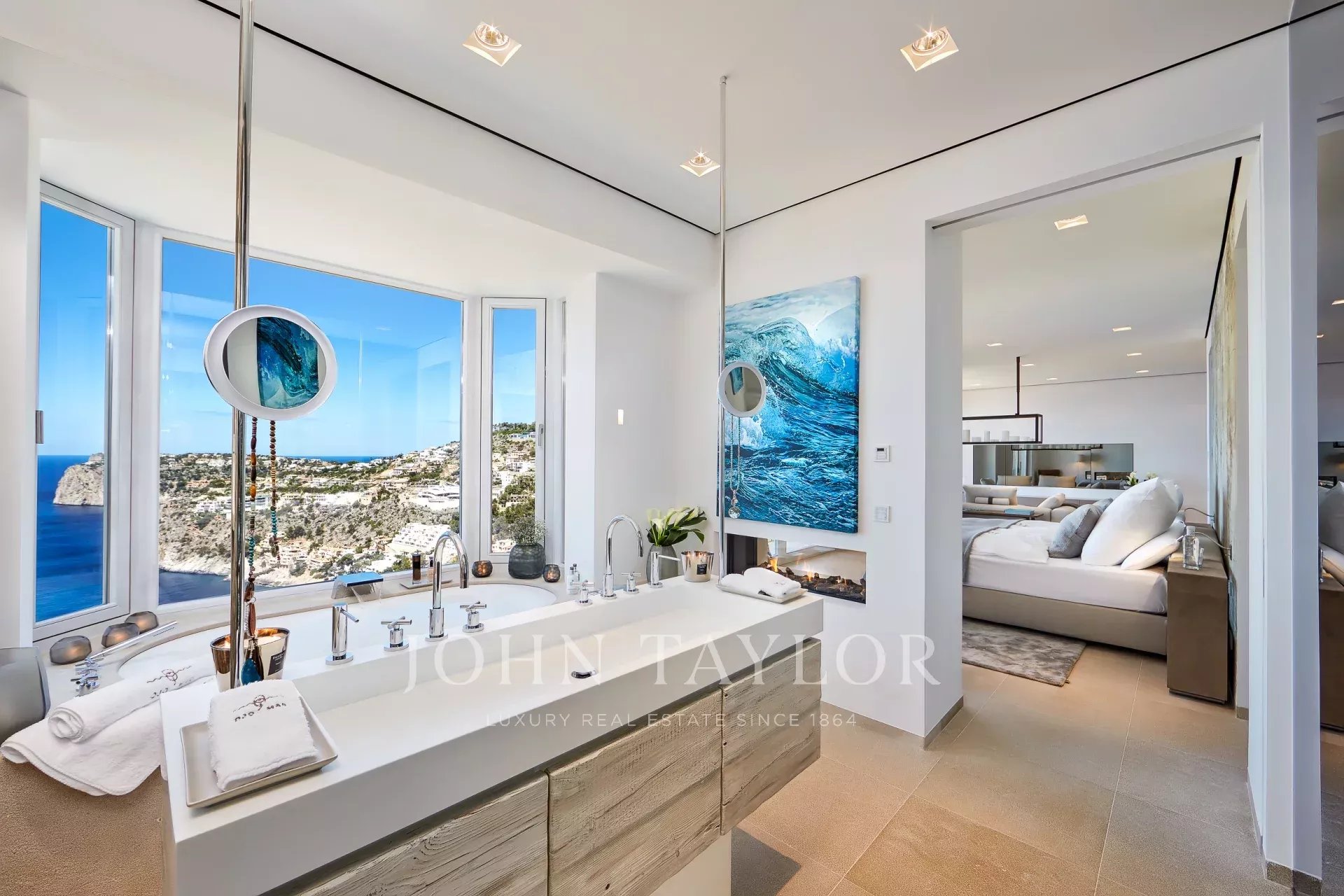 Эта роскошная вилла расположена в престижном месте над бухтой Кала Лламп, откуда открываются захватывающие панорамные виды на море. Вилла имеет площадь 700 м2 и расположена на трех уровнях. На первом этаже находится элегантная прихожая, ведущая к телевизионному салону, гостиной, столовой и кухне. Просторная гостиная через перголы выходит на террасы, где расположены две открытые кухни с грилями для барбекю и большим обеденным столом, а также ванная комната. Еще одна изюминка - бассейн-инфинити площадью 60 м2. Открытая площадка спроектирована таким образом, чтобы вы могли в полной мере насладиться средиземноморским климатом. На верхний этаж можно подняться на лифте или по элегантно освещенной лестнице, где расположена спальная зона. Она состоит из двух спален с ванными комнатами и комфортабельной главной спальни. Она состоит из прихожей, просторной спальной зоны и роскошной ванной комнаты с ванной в эркере. В цокольном этаже, помимо гаража площадью 100 м2, где можно разместить не менее 5 автомобилей, есть винный погреб, фитнес-зал с сауной, домашний кинотеатр, спальня для обслуживающего персонала с ванной комнатой, еще одна ванная комната, прачечная, подсобное помещение и кладовая. Дом продается с мебелью.