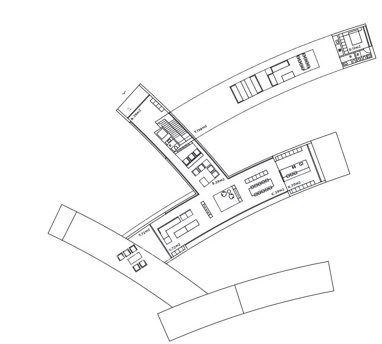 В центре виллы находится большой холл. Здесь находится столовая, открытая в сад с видом на бассейн. Через большие стеклянные окна вид из нее обеспечивает целостную связь со всем зданием. Длинная крытая терраса образуется под верхним этажом, который поддерживается только в двух точках. На пересечении с объемом прихожей находится коммуникационное ядро, а в одном конце участка - компактная зона обслуживания.