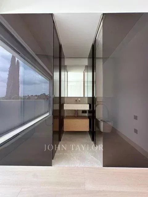 Цокольный этаж этой виллы имеет не только жилое назначение: гараж, установки, крытый бассейн, многофункциональное помещение, офис, террасы и открытый бассейн. Благодаря планировке, использующей неровности рельефа, его помещения получают естественное освещение и возможность любоваться пейзажем.