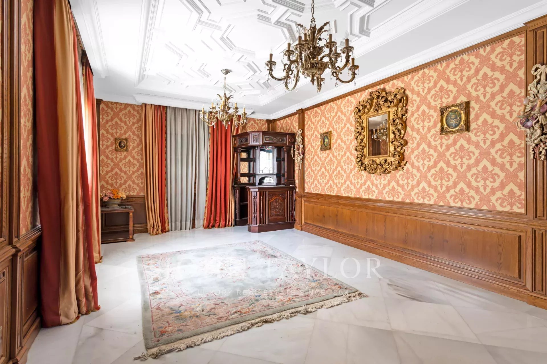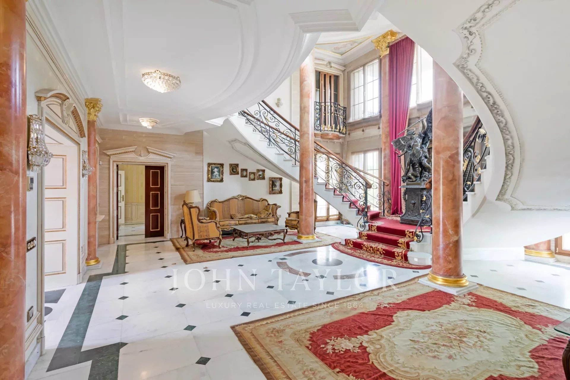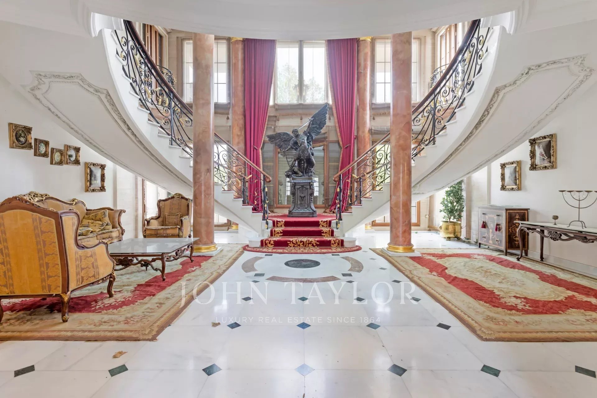 Мы входим в грандиозный холл с двойной мраморной лестницей, холл представляет величественную гостиную с очень высокими потолками, с выходом на крыльцо и к открытому/крытому бассейну, в кабинет, в гостиную и в столовую с венецианскими фресками на стенах. Рядом со столовой находится кухня со встроенной бытовой техникой и гостевой туалет.