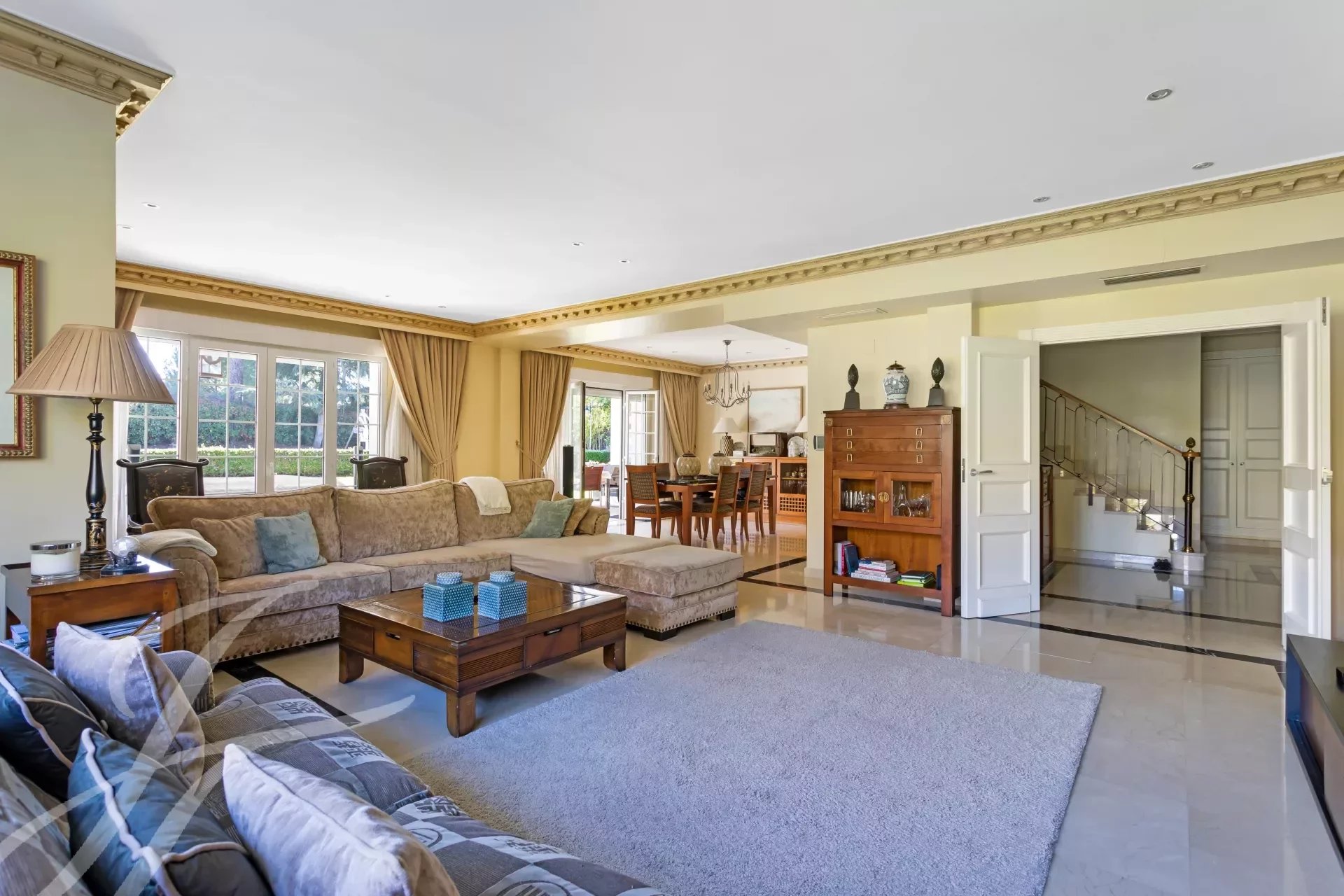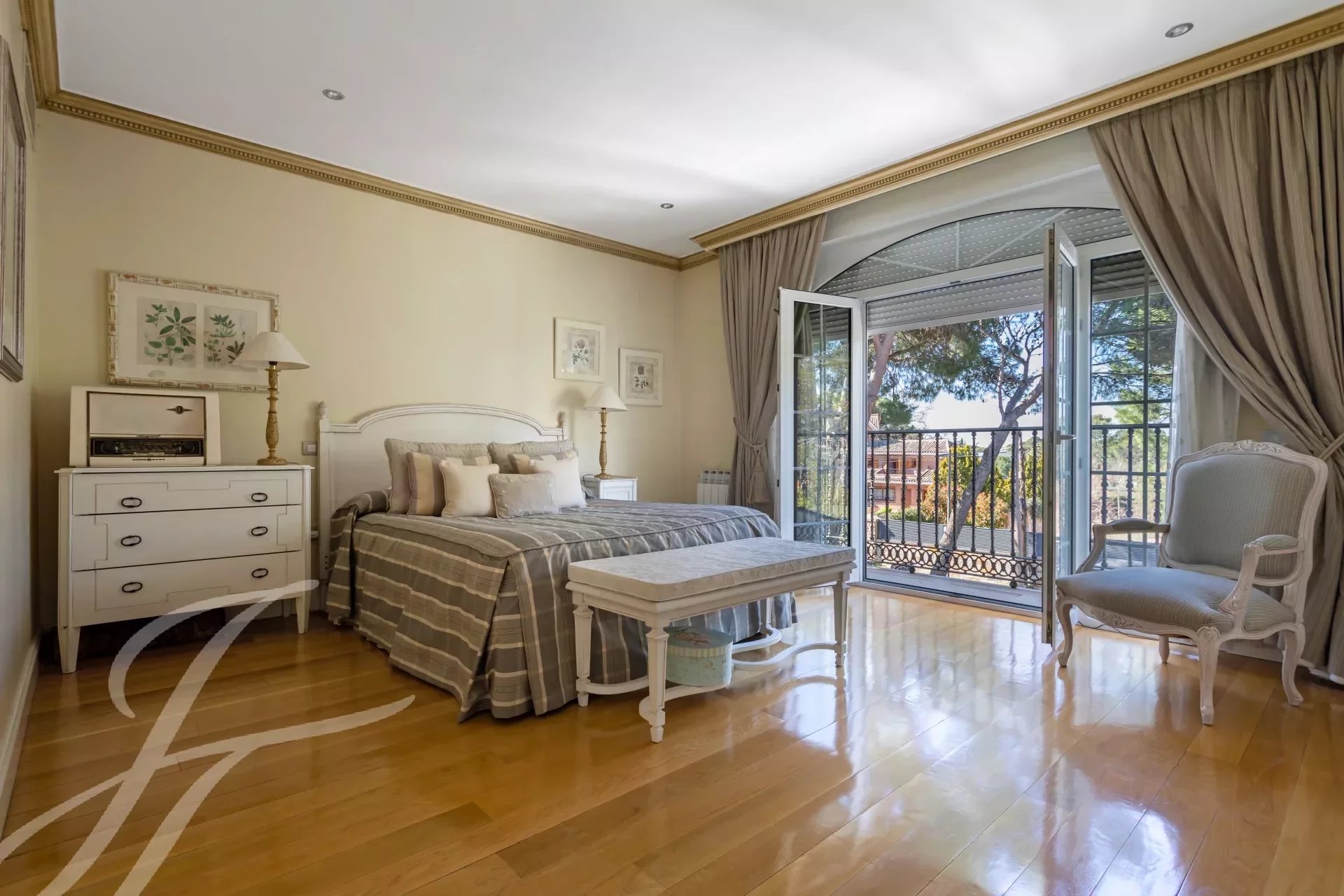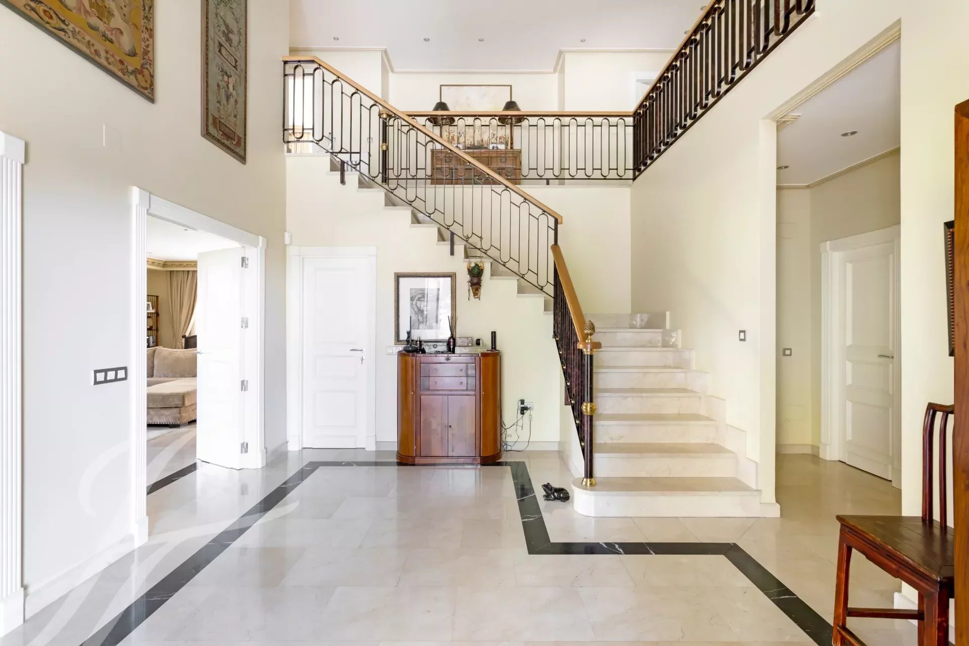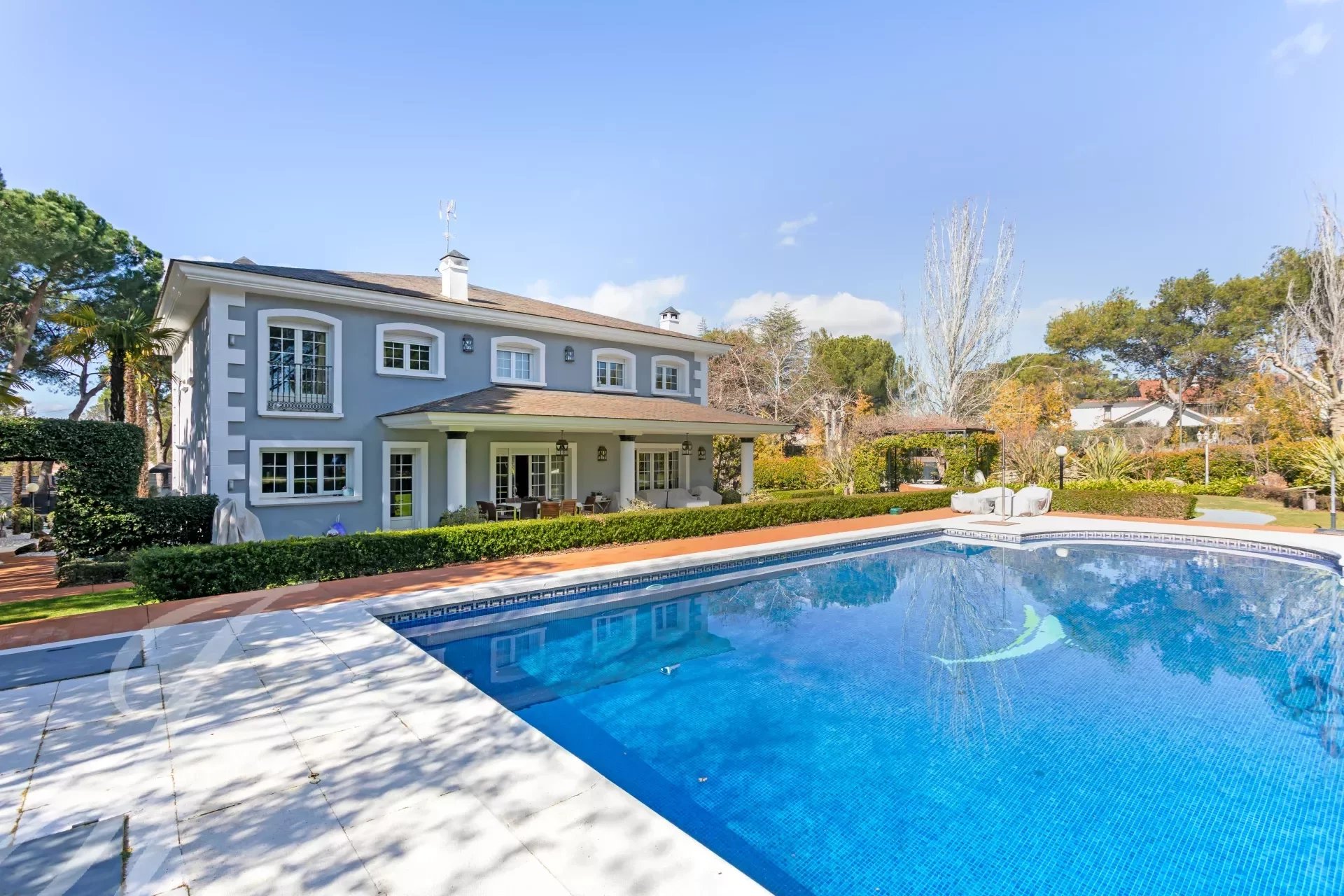 Впечатляющая вилла в классическом стиле на участке 2.200 м2 площадью 737 м2, с ухоженными садами, спроектированными известным ландшафтным дизайнером, и красивым бассейном. Великолепное здание в отличном состоянии, построенное из отличных материалов. Распределение на два основных этажа и полуподвальный этаж. Вход через впечатляющий холл, доступ на любой этаж по величественной лестнице или на лифте. Участок, благодаря своему расположению, обладает абсолютной приватностью и безопасностью.