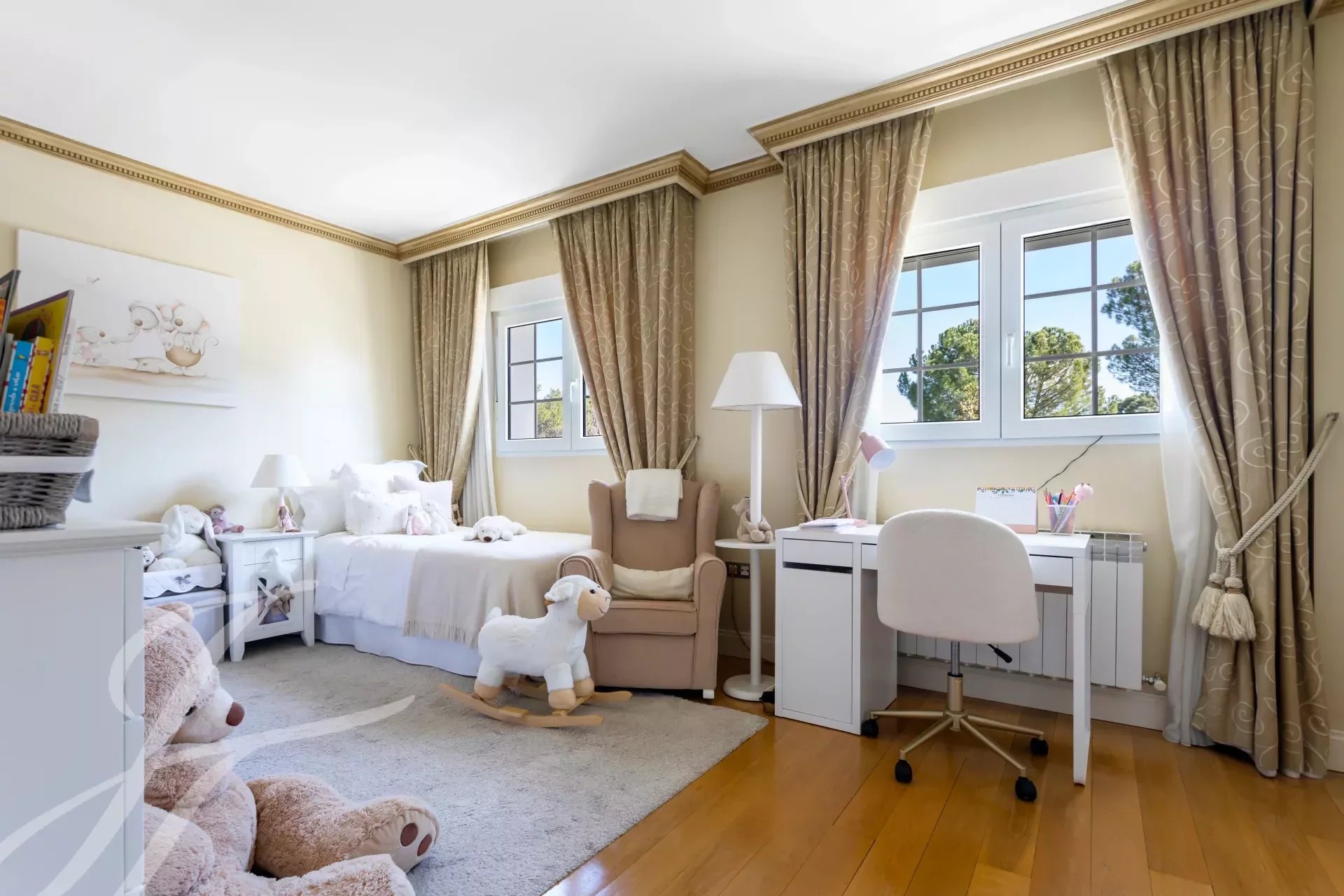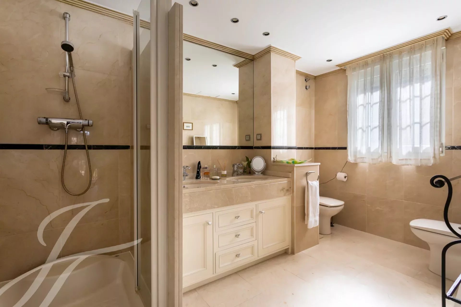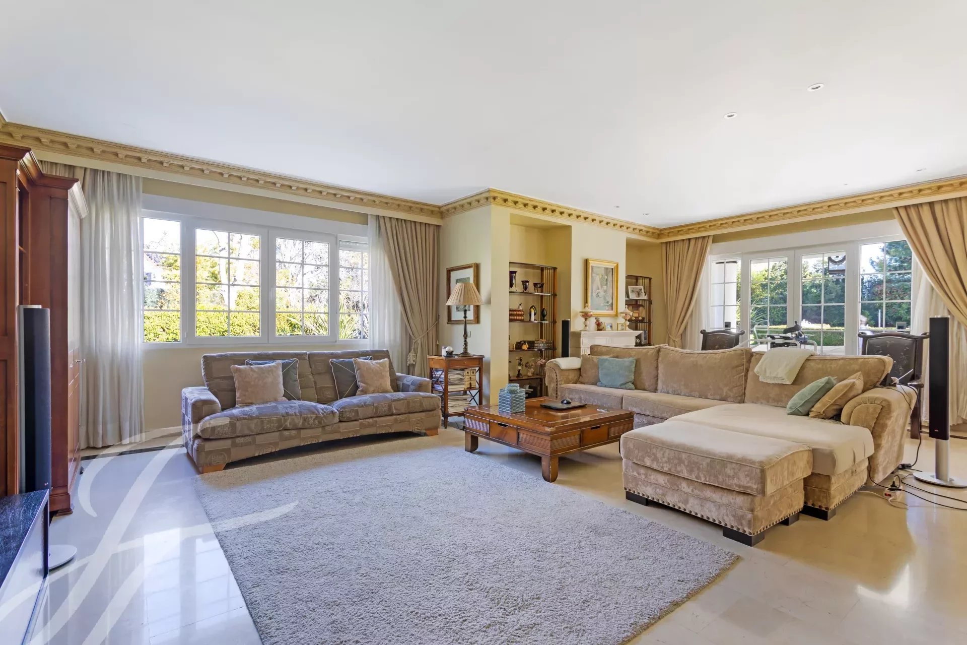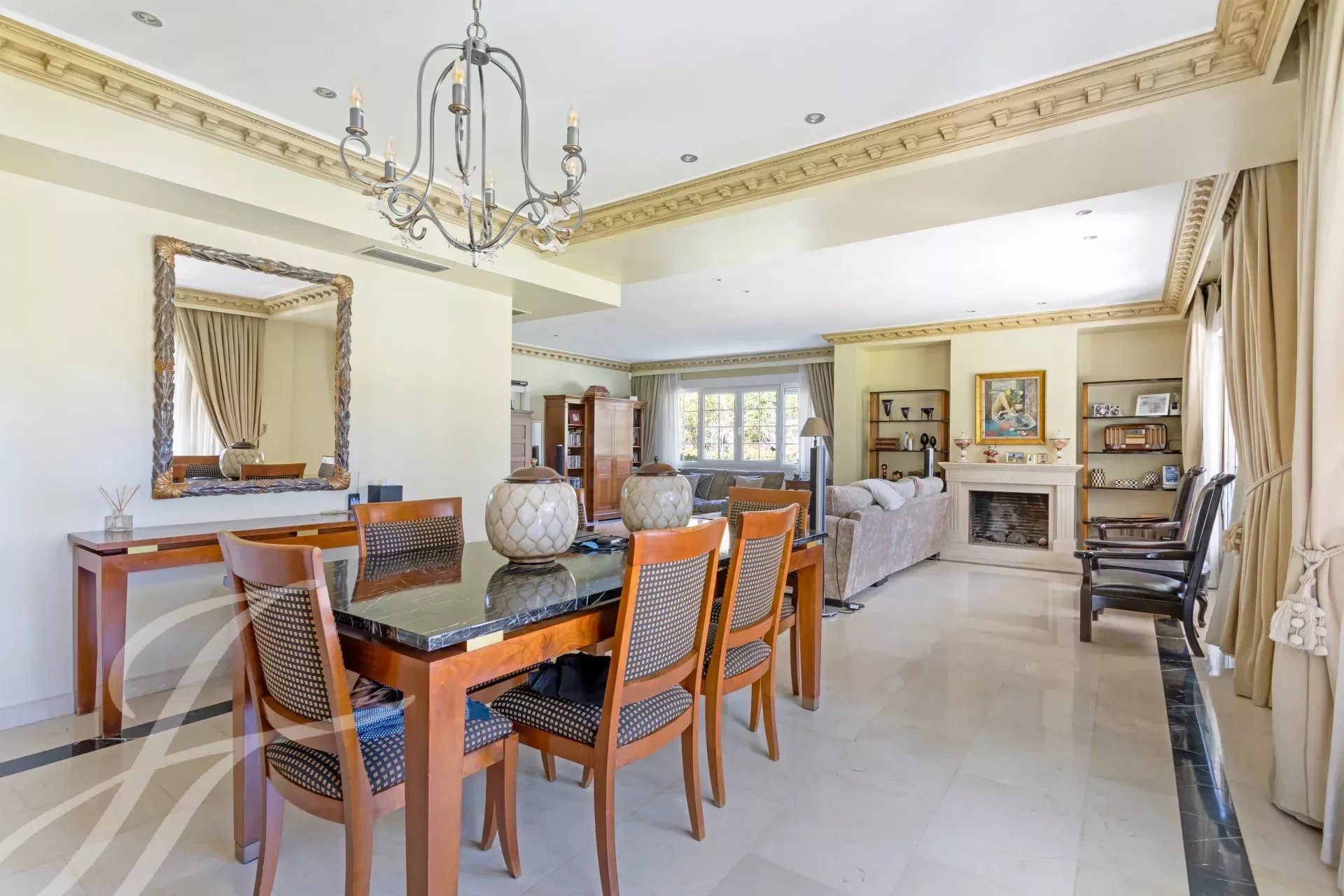 Впечатляющая вилла в классическом стиле на участке 2.200 м2 площадью 737 м2, с ухоженными садами, спроектированными известным ландшафтным дизайнером, и красивым бассейном. Великолепное здание в отличном состоянии, построенное из отличных материалов. Распределение на два основных этажа и полуподвальный этаж. Вход через впечатляющий холл, доступ на любой этаж по величественной лестнице или на лифте. Участок, благодаря своему расположению, обладает абсолютной приватностью и безопасностью.
