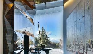 Между безличным и динамичным миром экстерьера и уютной и неторопливой вселенной интерьера. Журчание воды указывает нам путь. У входа находится выставочное пространство. Помещение продолжается на двойной высоте из стали и стекла, скрывающей доступ к комнатам.