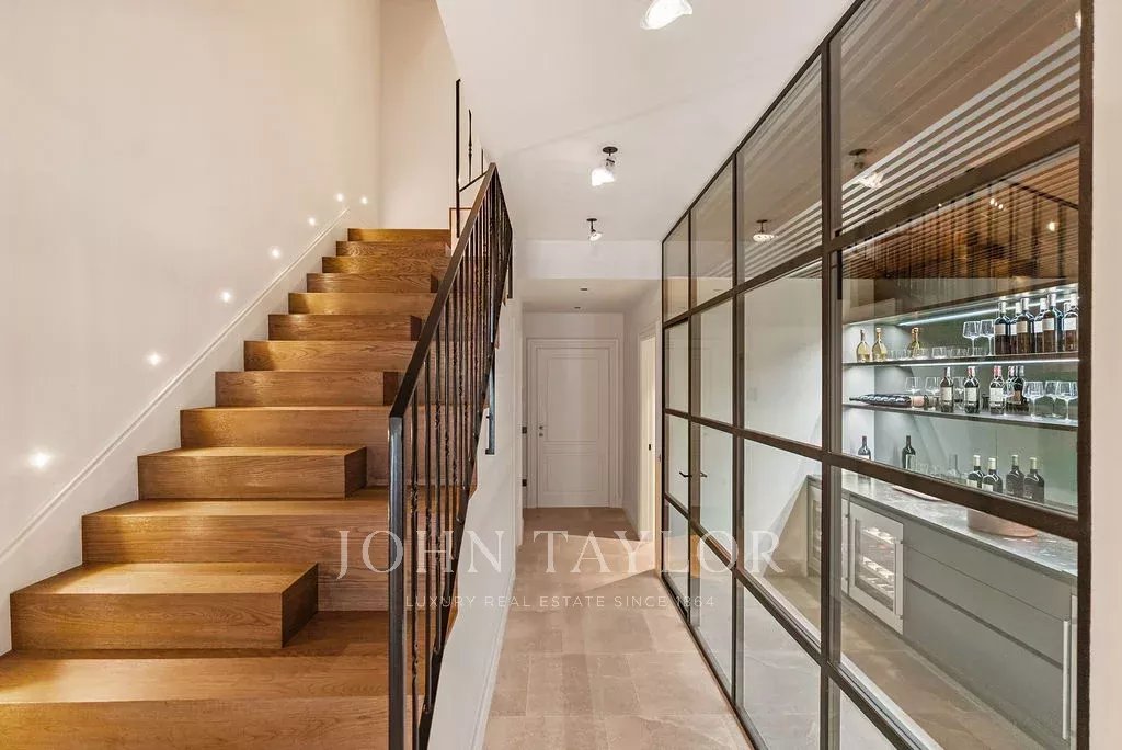 Первый этаж встречает гостеприимным холлом, представительным камином, высокими деревянными потолками и уникальной лестницей. Также на этом этаже находится великолепный винный бар, прачечная и гараж-стоянка с большим количеством мест для автомобилей и велосипедов.
