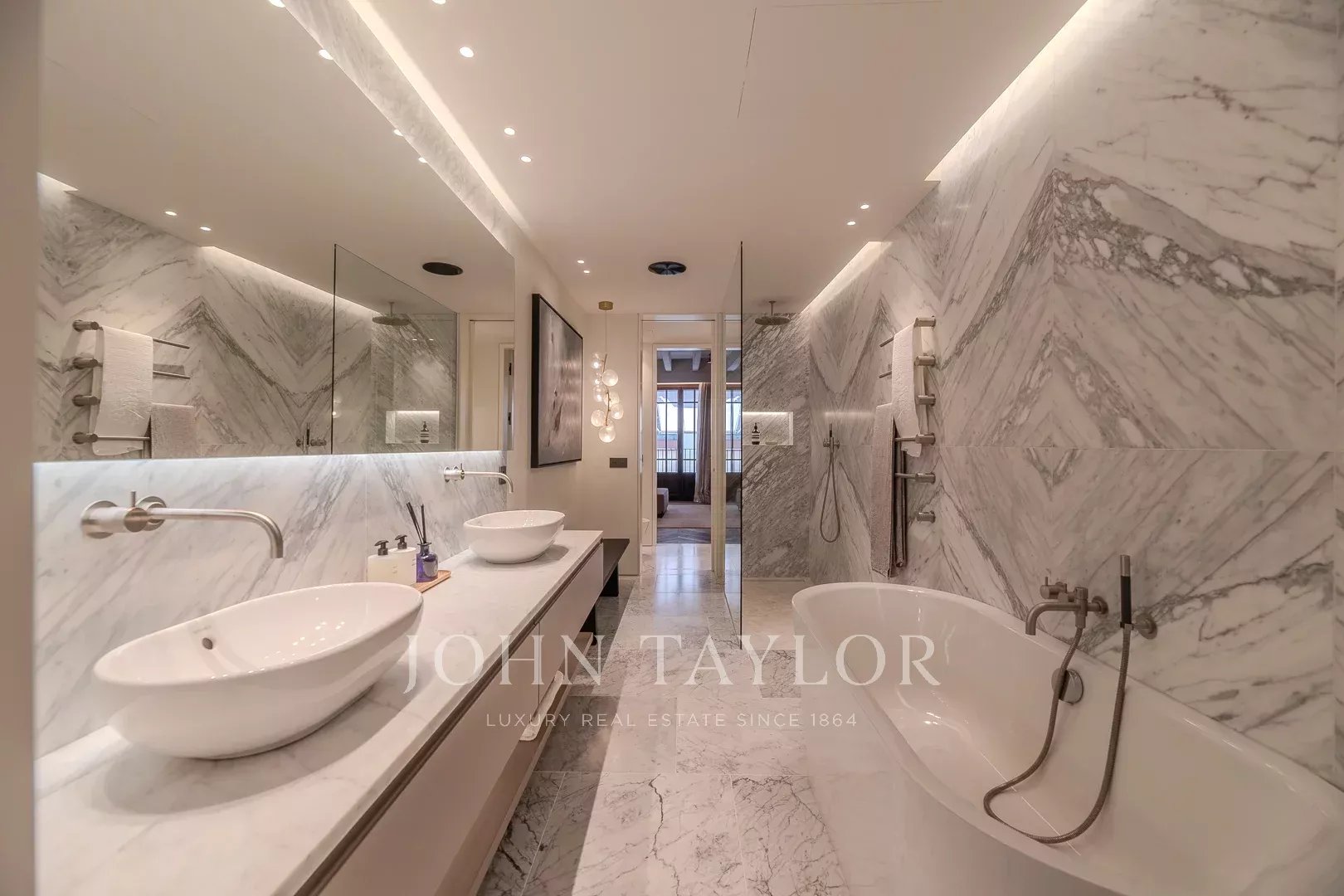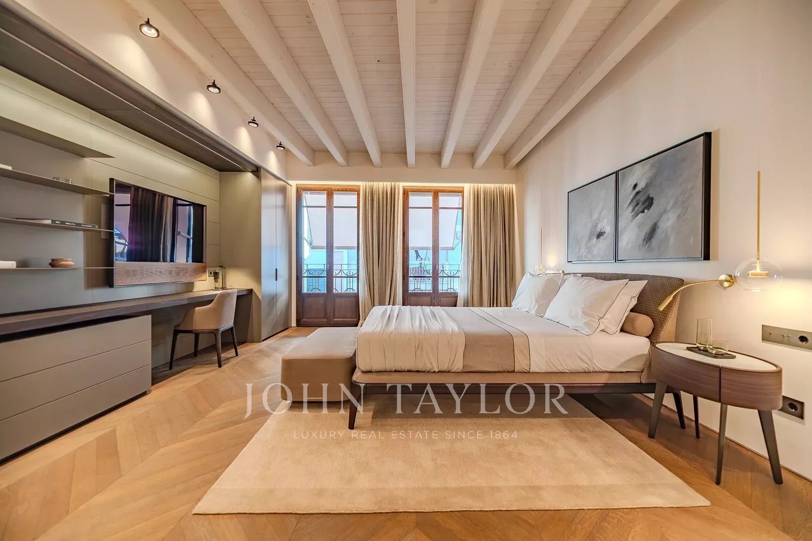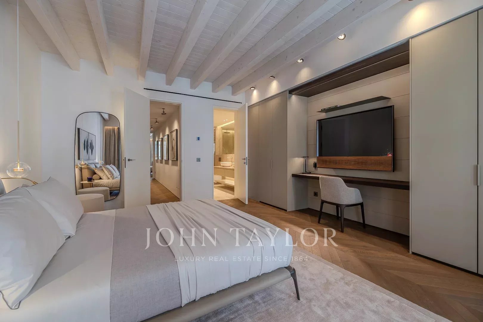 Второй этаж: роскошная спальня владельца занимает весь этаж, включает гардеробную, элегантную ванную комнату en-suite и частную гостиную. Также есть возможность добавить четвертую спальню, если потребуется.