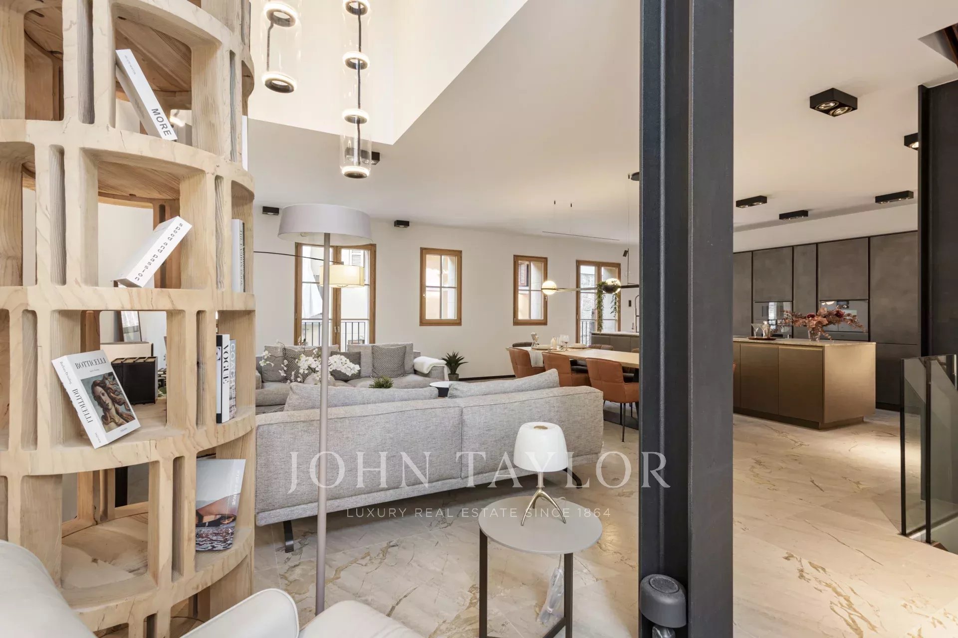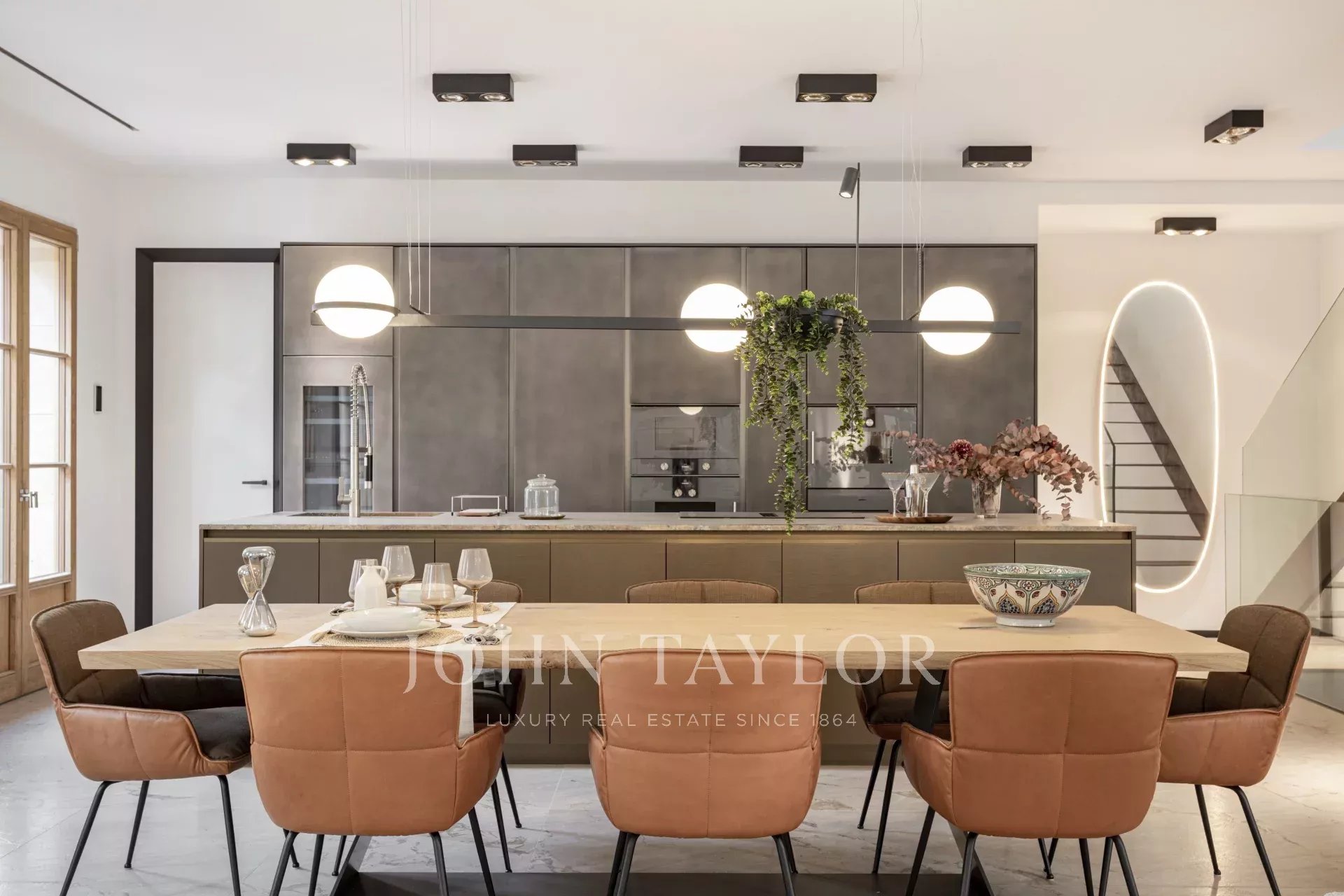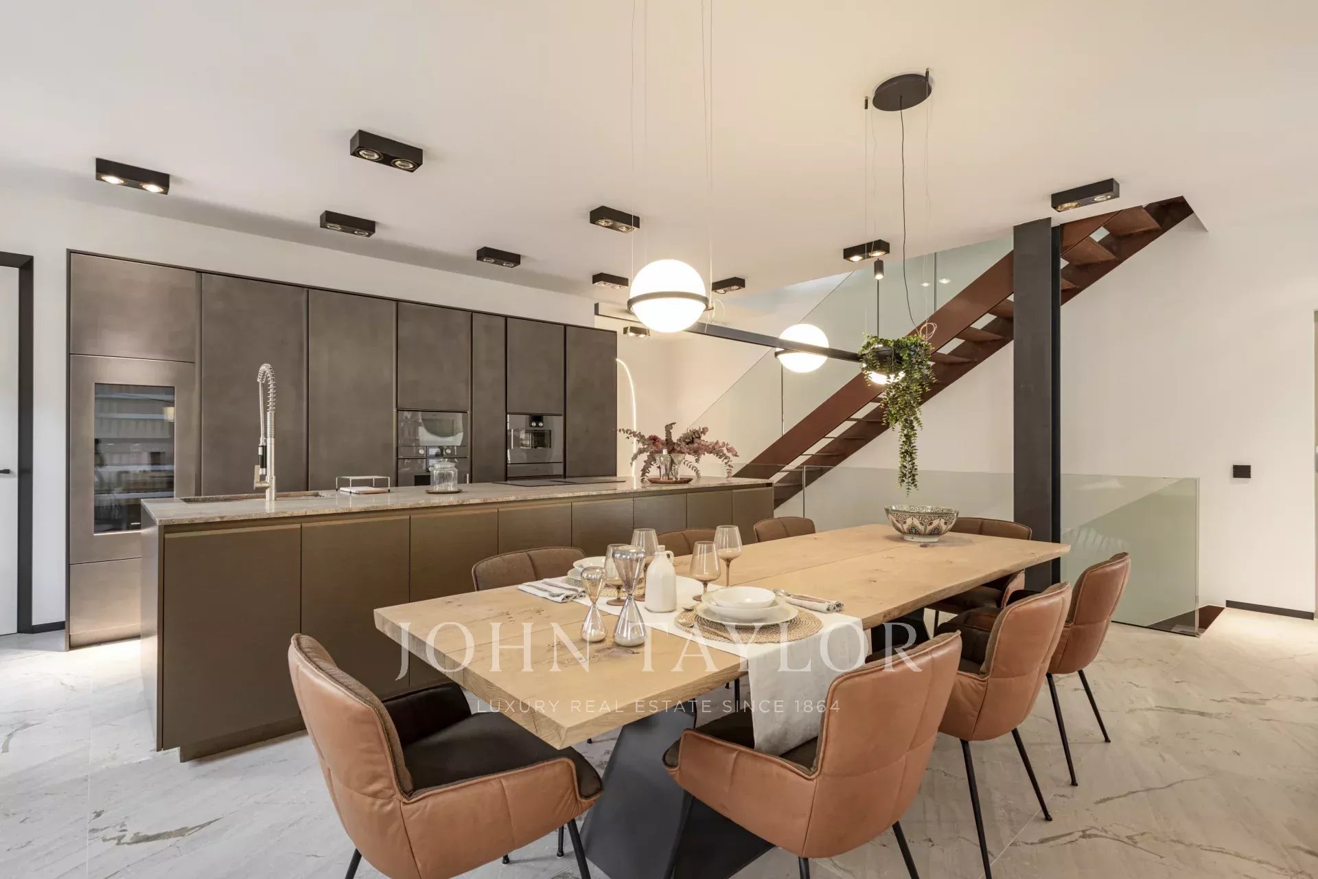 Премиальные материалы, такие как натуральный камень и древесина дуба, высота потолков до 4,5 метров и элегантная дизайнерская лестница придают дому уникальный и изысканный характер.
