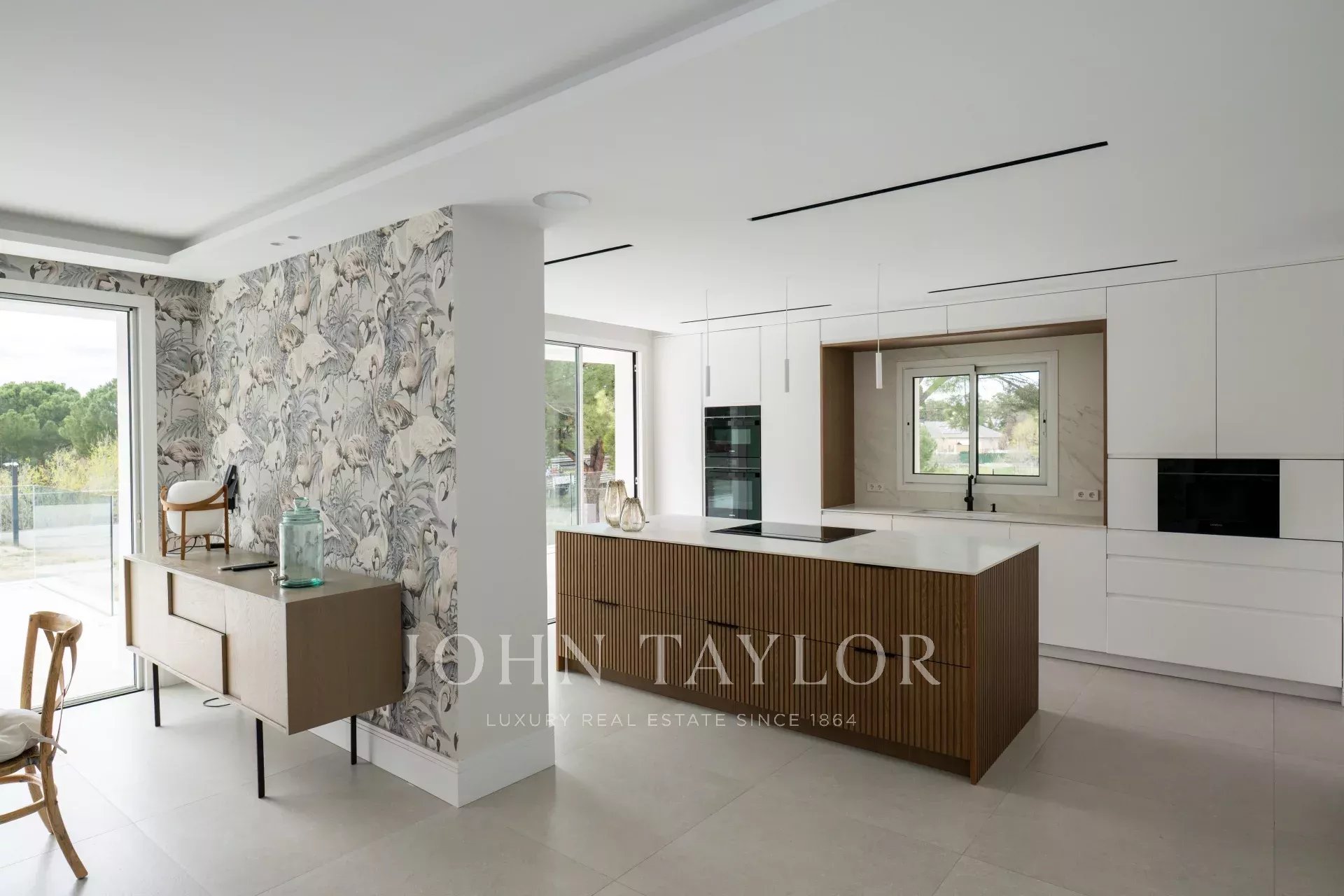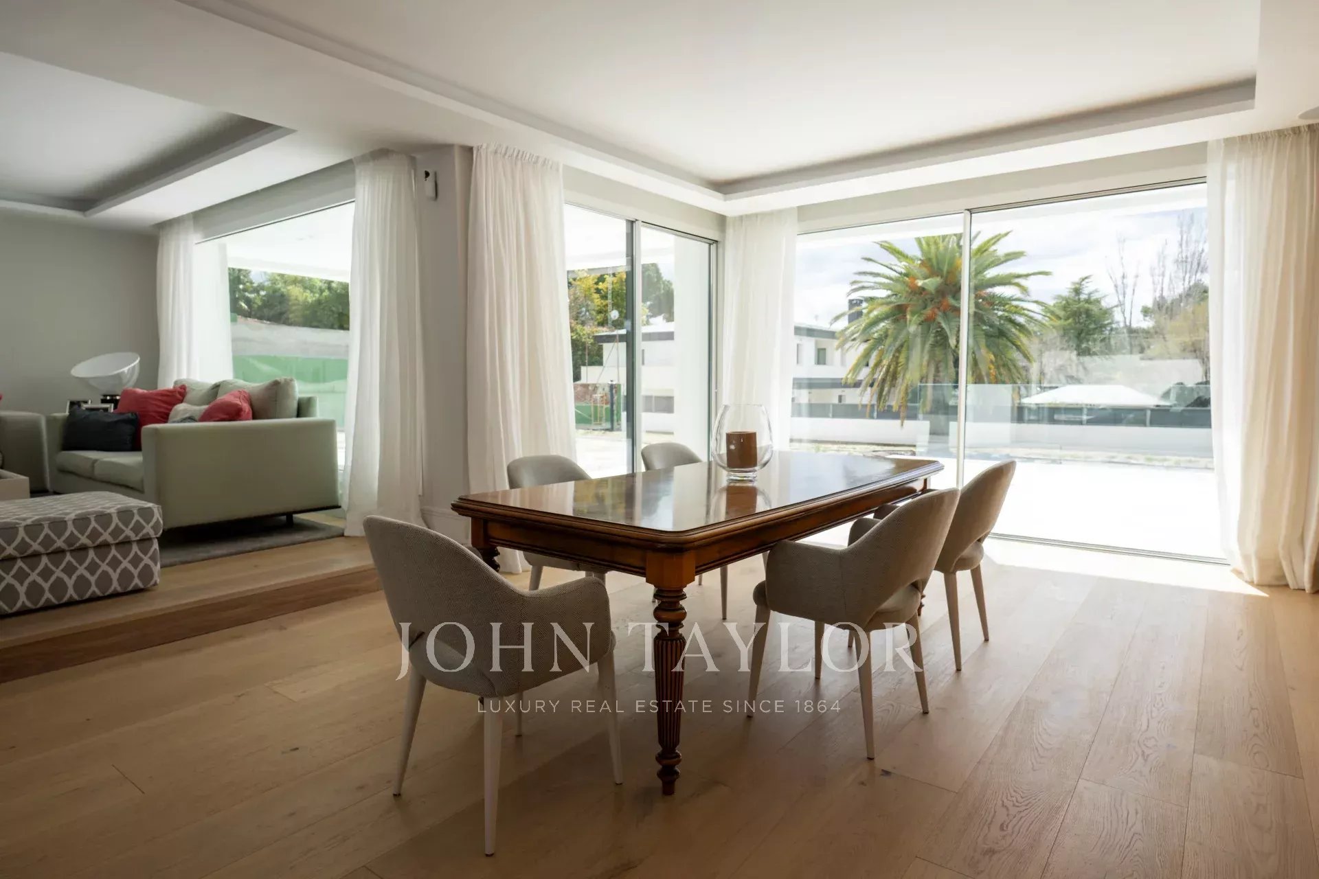 Дом общей площадью 1679 м2 - это дань свету. Главный вход - это красивая лестница, которая ведет к прекрасной входной двери больших размеров. Прихожая с двумя огромными цельными окнами освещает весь главный этаж дома и соединяет нас с большой гостиной-столовой на двух уровнях. Рядом со столовой находится кухня, оборудованная по последнему слову техники, с двойным холодильником, большим центральным островом, выходом на большую открытую террасу и офисной зоной, идеально подходящей для ежедневных семейных трапез. Также есть доступ к служебной зоне, в которой находится большая спальня с ванной комнатой.