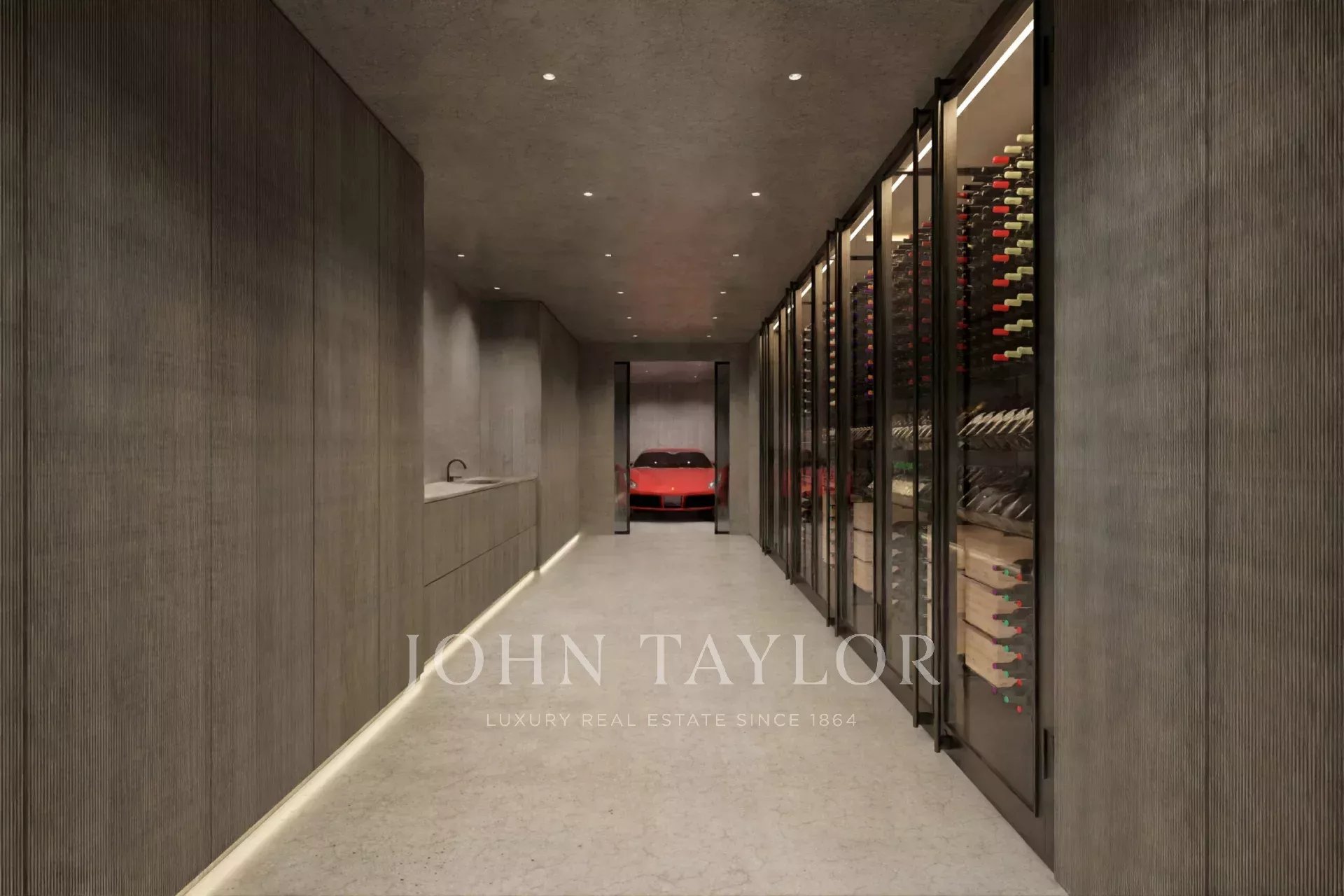 На цокольном этаже площадью около 320 м² расположены гараж на три машины, кладовая и винный погреб. Это обширное пространство может быть адаптировано под различные нужды: от велнес-зоны или частного кинозала до шестой спальни с ванной комнатой.