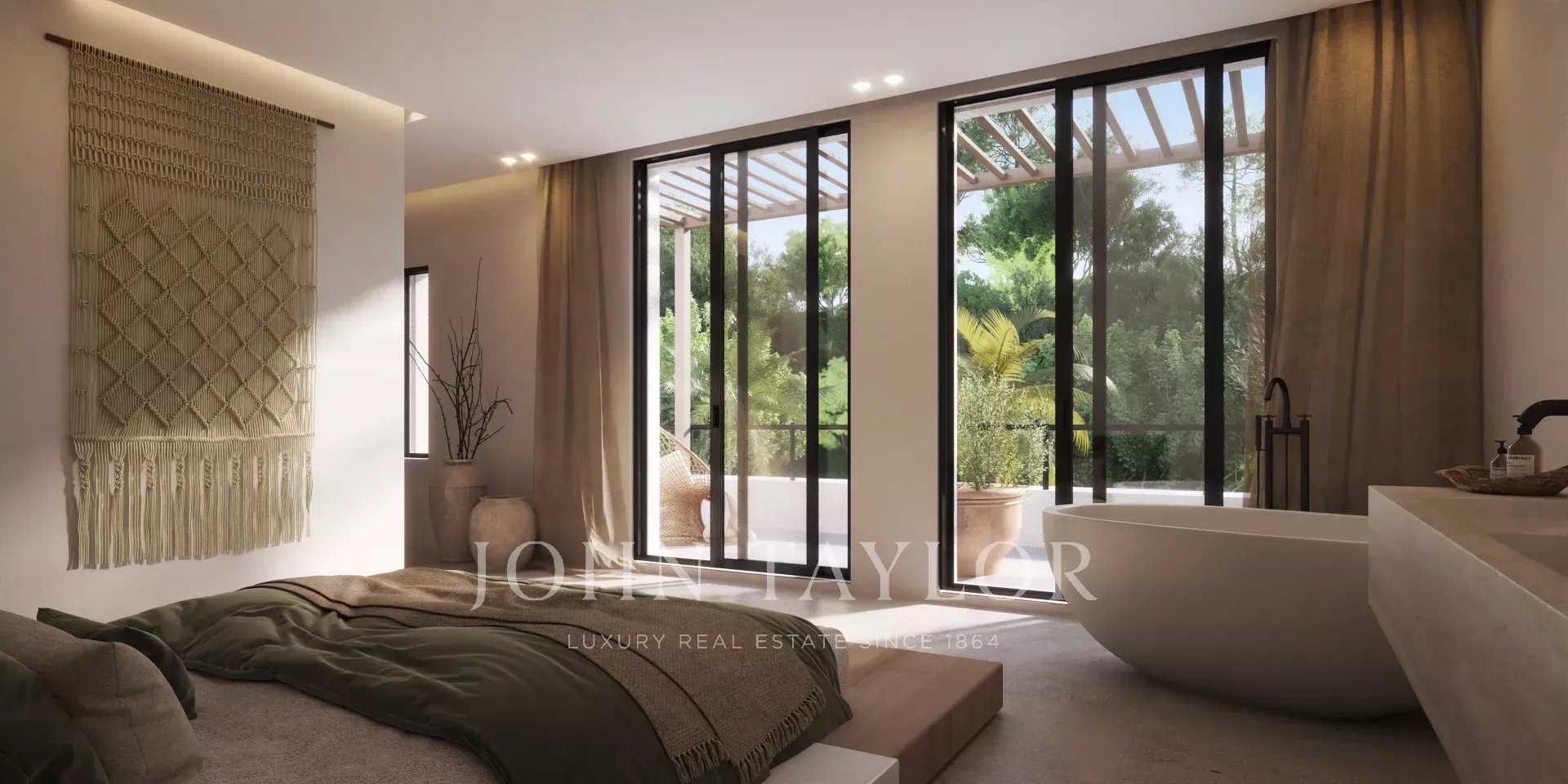 - Пять просторных спален с встроенными шкафами, включая мастер-сьют с открытой ванной комнатой, отдельностоящей ванной и частной террасой.
