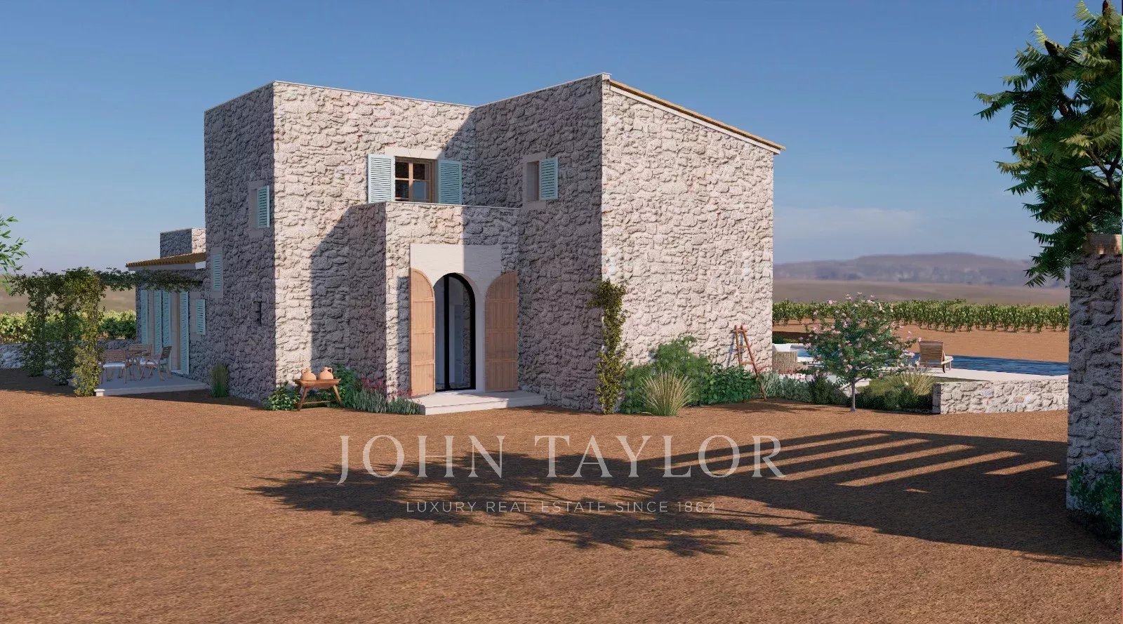 Участок поставляется с проектом и лицензией на строительство аутентичного каменного загородного дома на Майорке общей площадью 495 кв.м., из которых 300 кв.м. составляют внутренние помещения. При входе в дом расположены фойе, кухня открытой планировки с центральным островом и местами для отдыха, просторная столовая и гостиная с уютным камином и прямым выходом на улицу, зона отдыха и винный погреб. Спальня с двуспальной кроватью и ванной комнатой, прачечная и гостевой туалет завершают интерьер первого этажа.