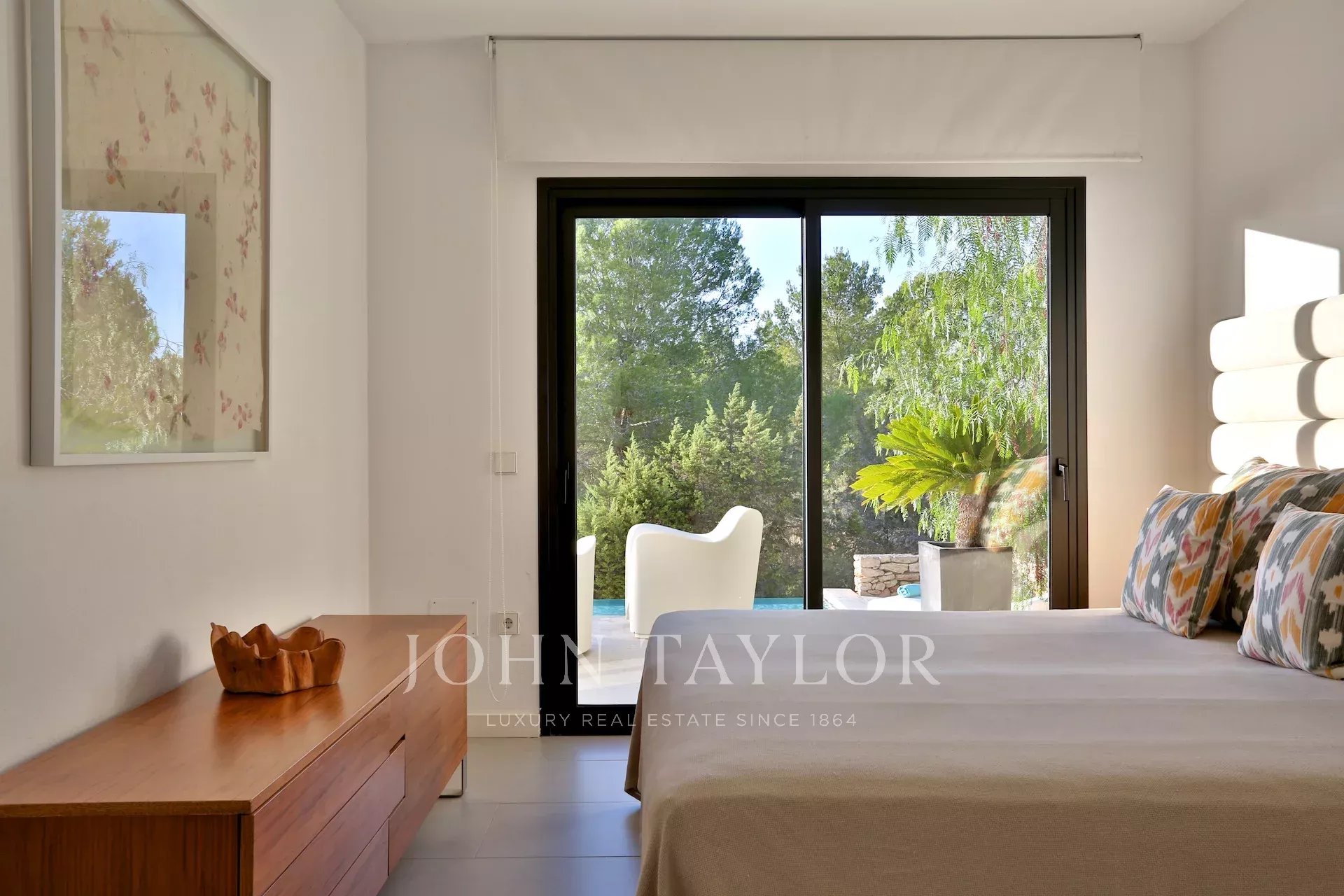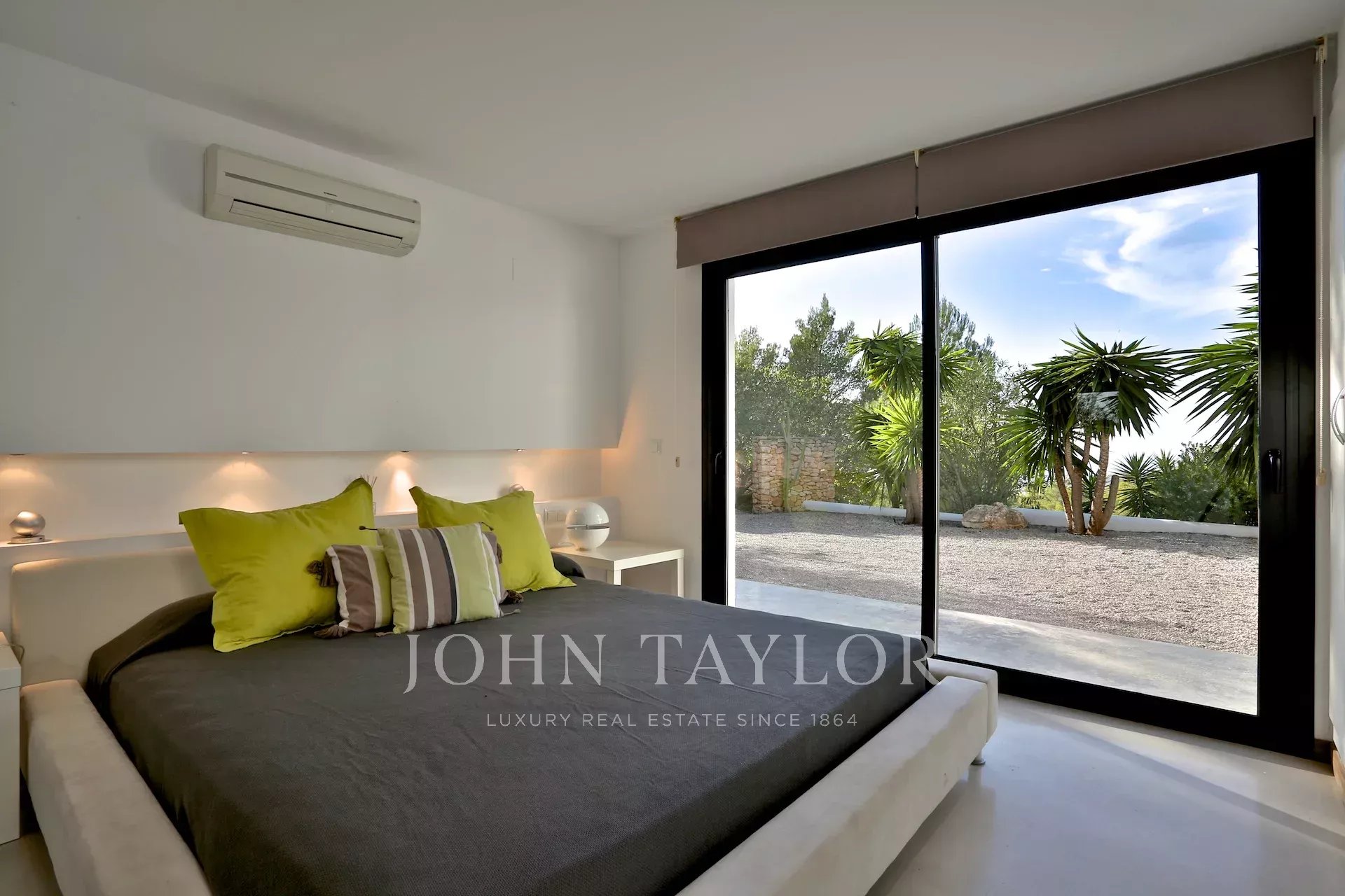 Расположенная на красивом холме между Сан-Хосе и Кала Таридой, эта современная вилла приглашает вас насладиться эксклюзивным образом жизни с потрясающими видами на море и живописный пейзаж Ибицы. При входе вас встретят яркая гостиная и уютная столовая, оборудованные кондиционером и звуковой системой, создающей идеальную атмосферу. Камин добавляет теплоты и уюта, а большие окна позволяют естественному свету заполнять пространство и соединяют вас с террасой и бассейном.