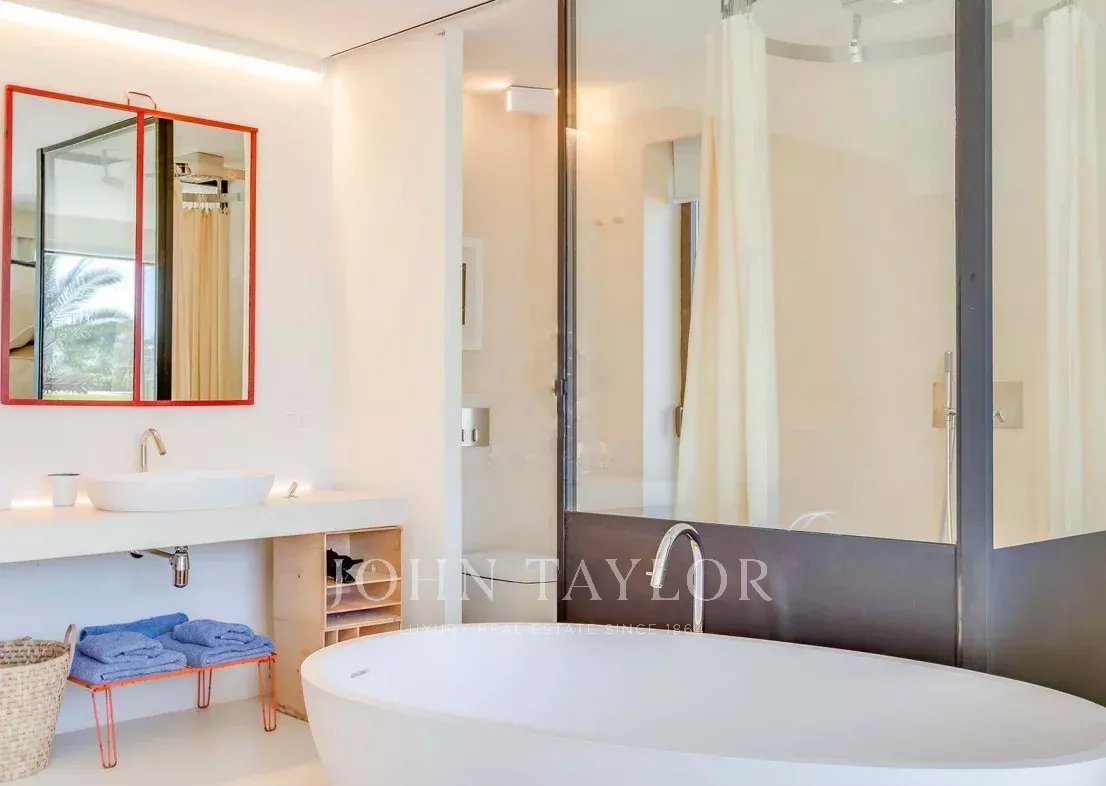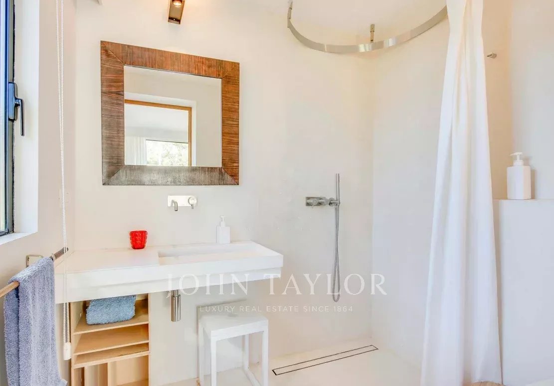 На первом этаже находится спальня с ванной комнатой, а на верхнем этаже расположены еще две спальни, включая главную спальню с ванной, душем и потрясающей частной террасой. Отсюда открывается вид на сад и дальнее море.