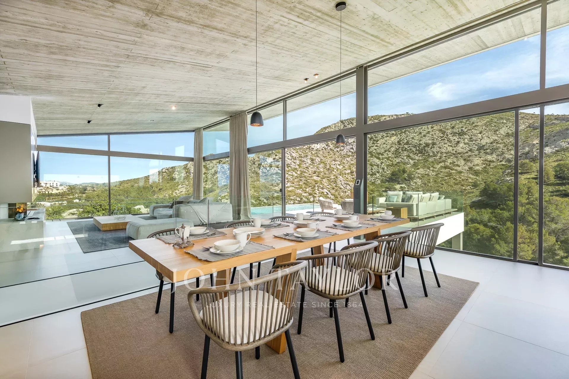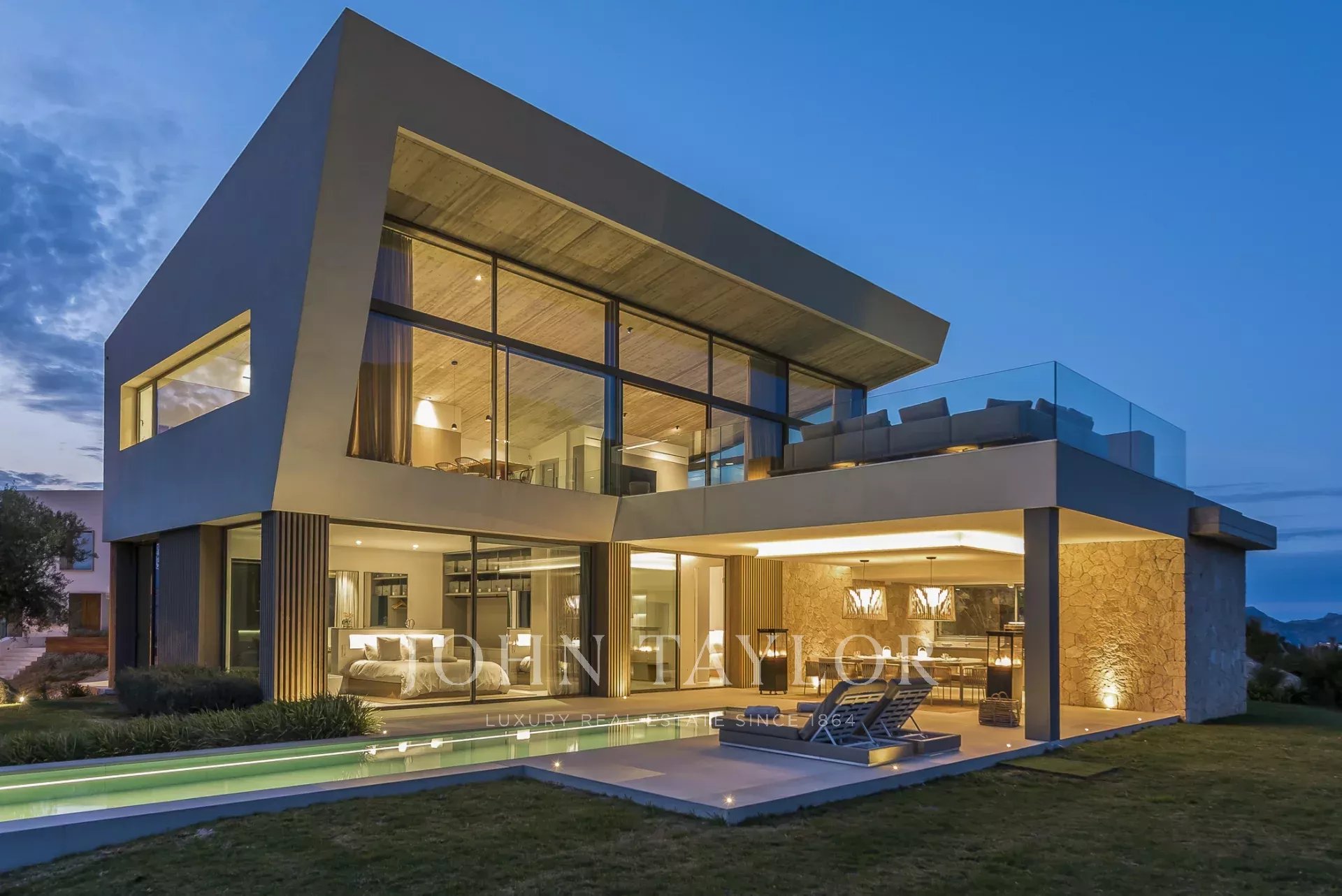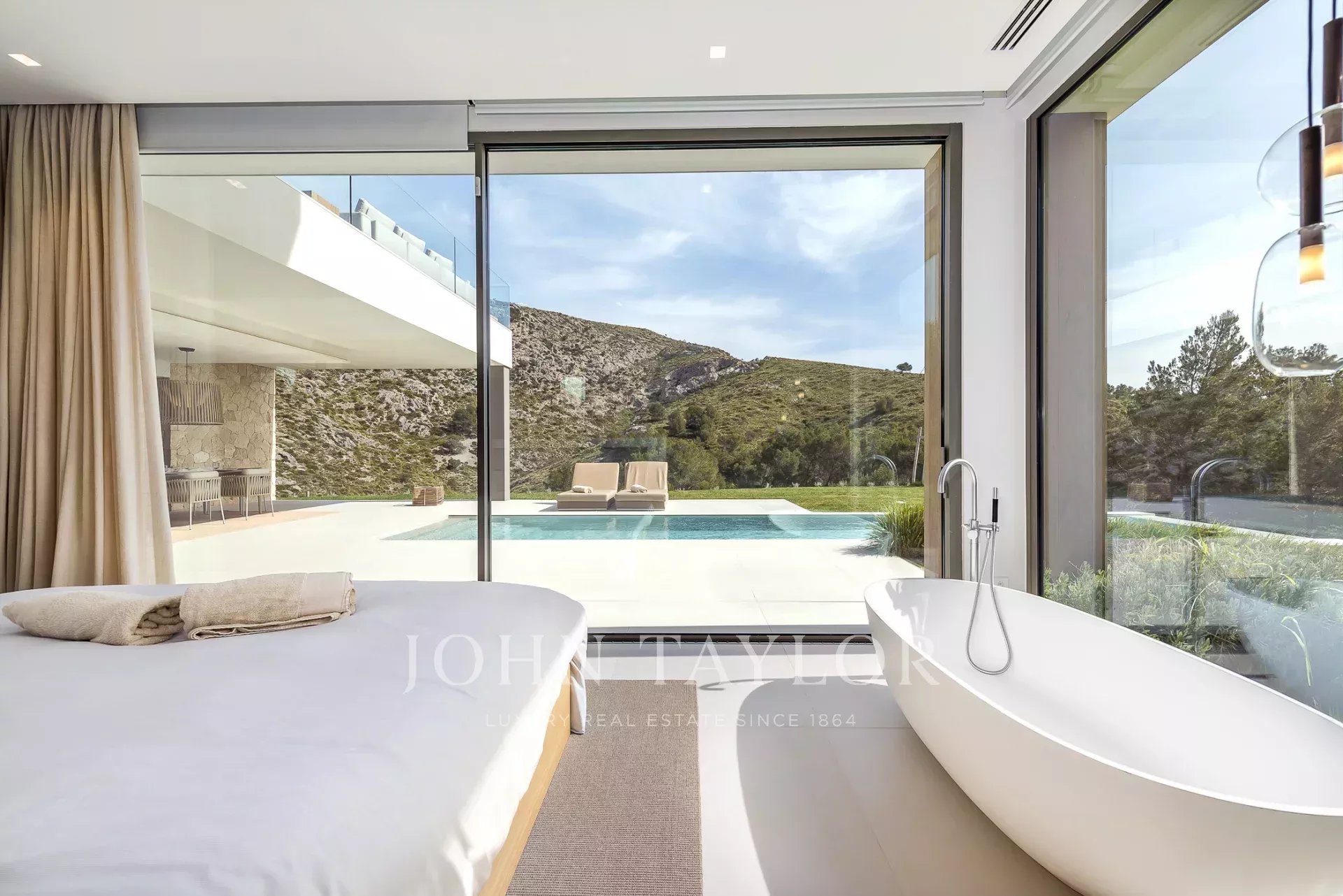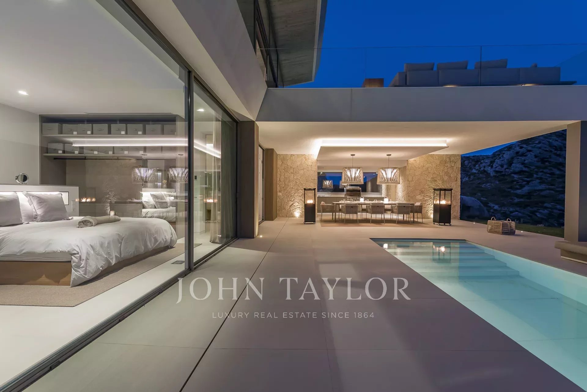 Дом современен и обставлен по высоким стандартам. Теплые цвета и материалы создают особую атмосферу для гостей. 4 спальни с двуспальными кроватями расположены на первом этаже, снаружи есть выход на большую террасу с полностью оборудованной открытой кухней и одним из двух бассейнов. Наверху находится кухня/гостиная открытой планировки с панорамными окнами, уютная гостиная с газовым камином и еще одна терраса с бассейном-джакузи.