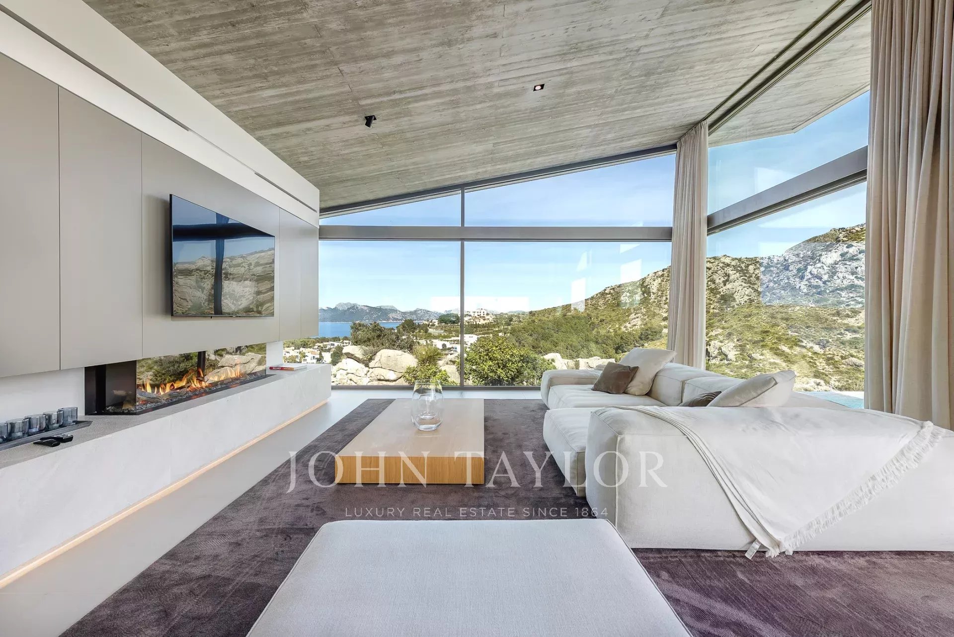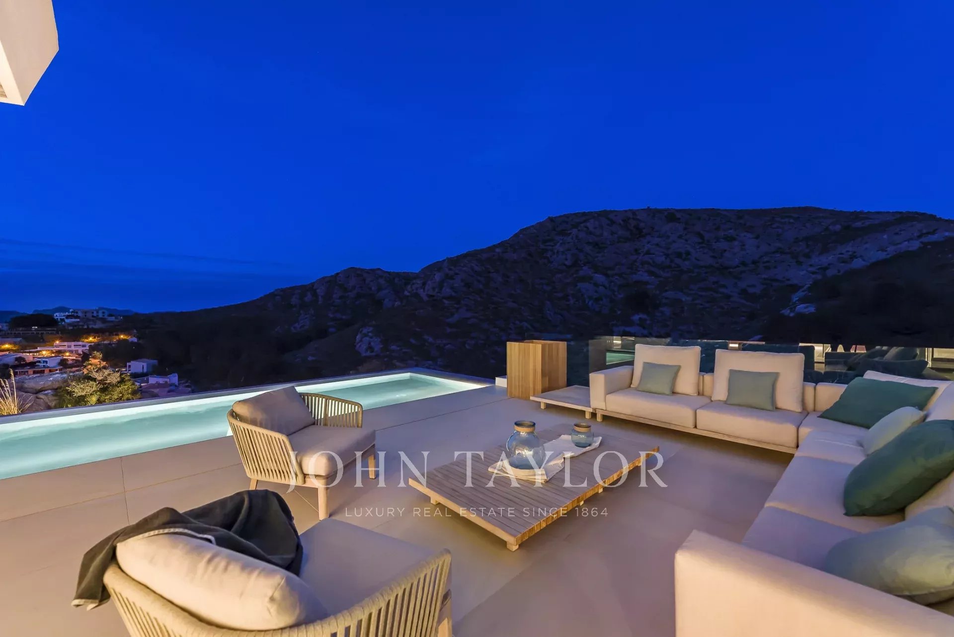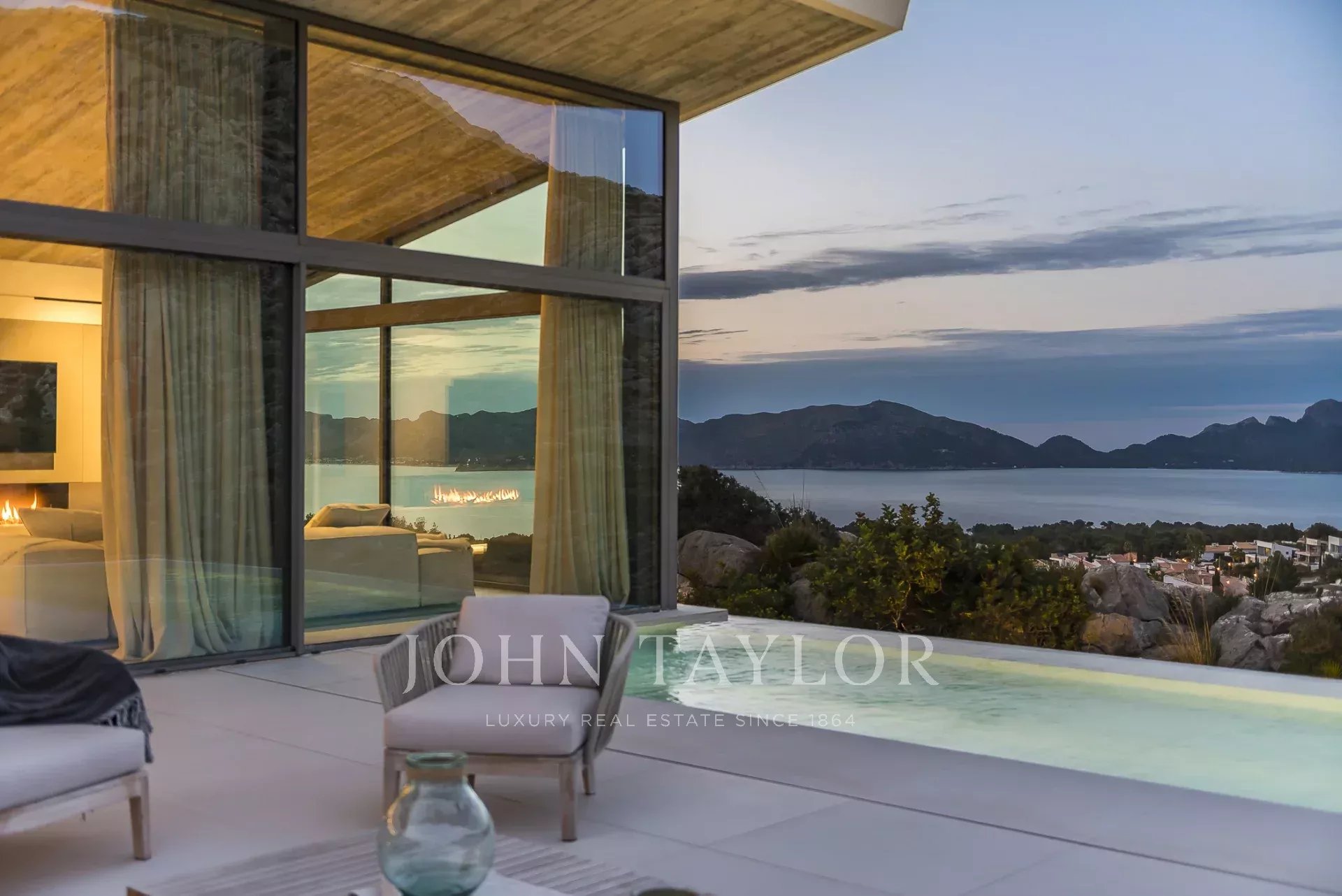 Дом современен и обставлен по высоким стандартам. Теплые цвета и материалы создают особую атмосферу для гостей. 4 спальни с двуспальными кроватями расположены на первом этаже, снаружи есть выход на большую террасу с полностью оборудованной открытой кухней и одним из двух бассейнов. Наверху находится кухня/гостиная открытой планировки с панорамными окнами, уютная гостиная с газовым камином и еще одна терраса с бассейном-джакузи.