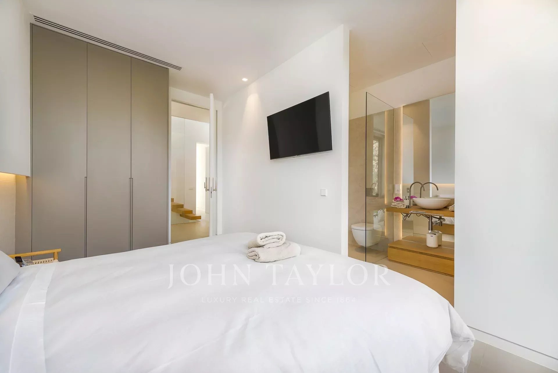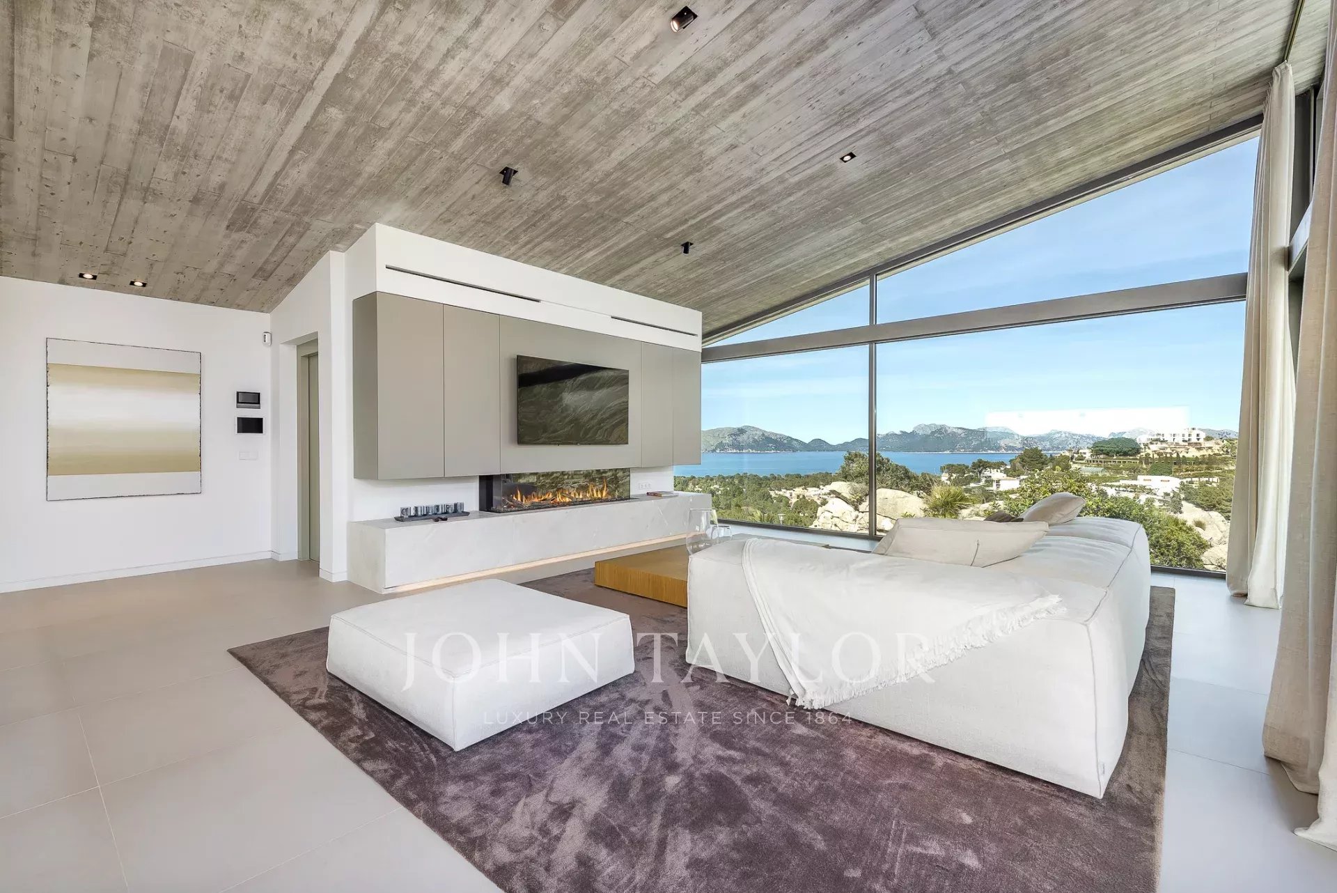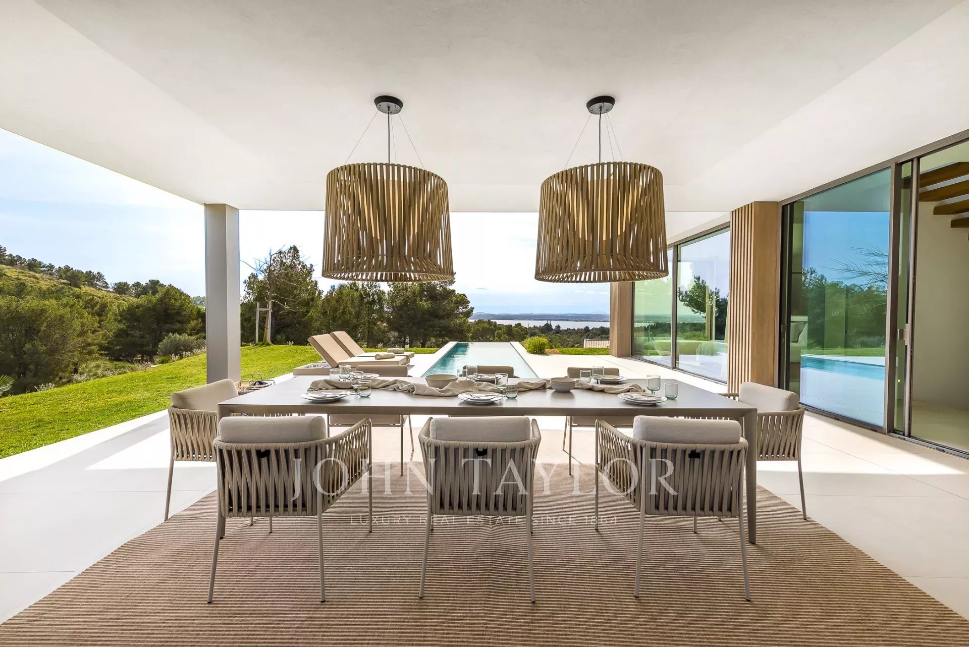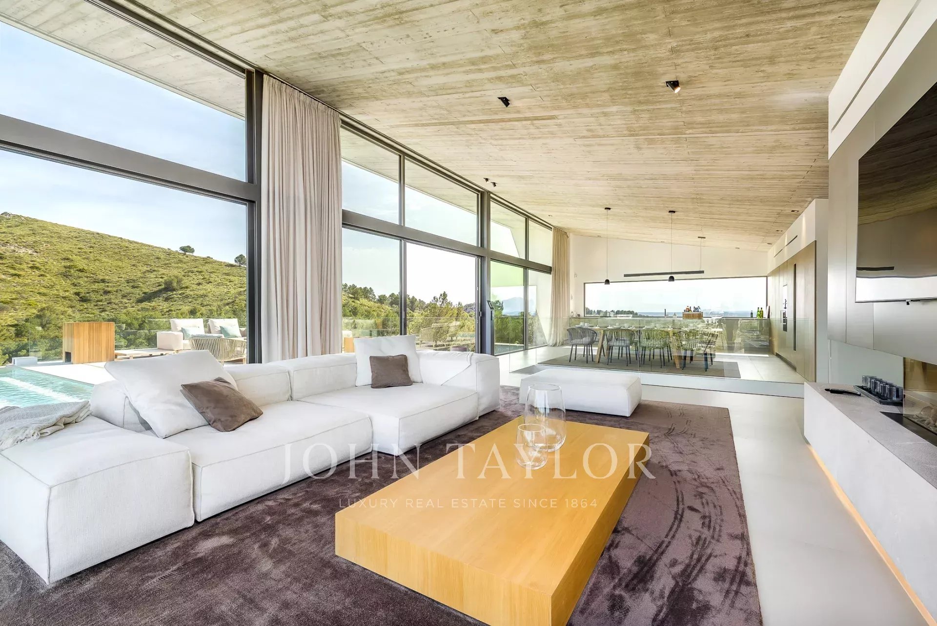 Дом современен и обставлен по высоким стандартам. Теплые цвета и материалы создают особую атмосферу для гостей. 4 спальни с двуспальными кроватями расположены на первом этаже, снаружи есть выход на большую террасу с полностью оборудованной открытой кухней и одним из двух бассейнов. Наверху находится кухня/гостиная открытой планировки с панорамными окнами, уютная гостиная с газовым камином и еще одна терраса с бассейном-джакузи.