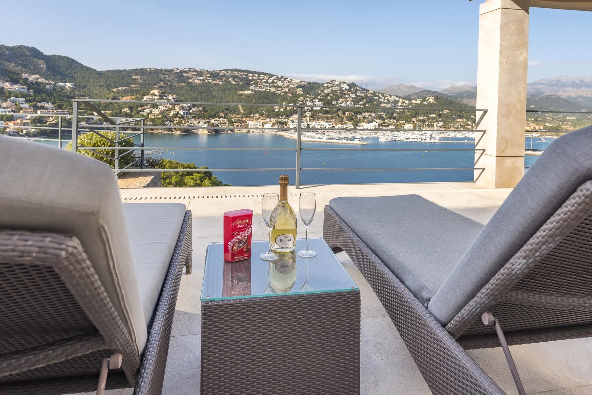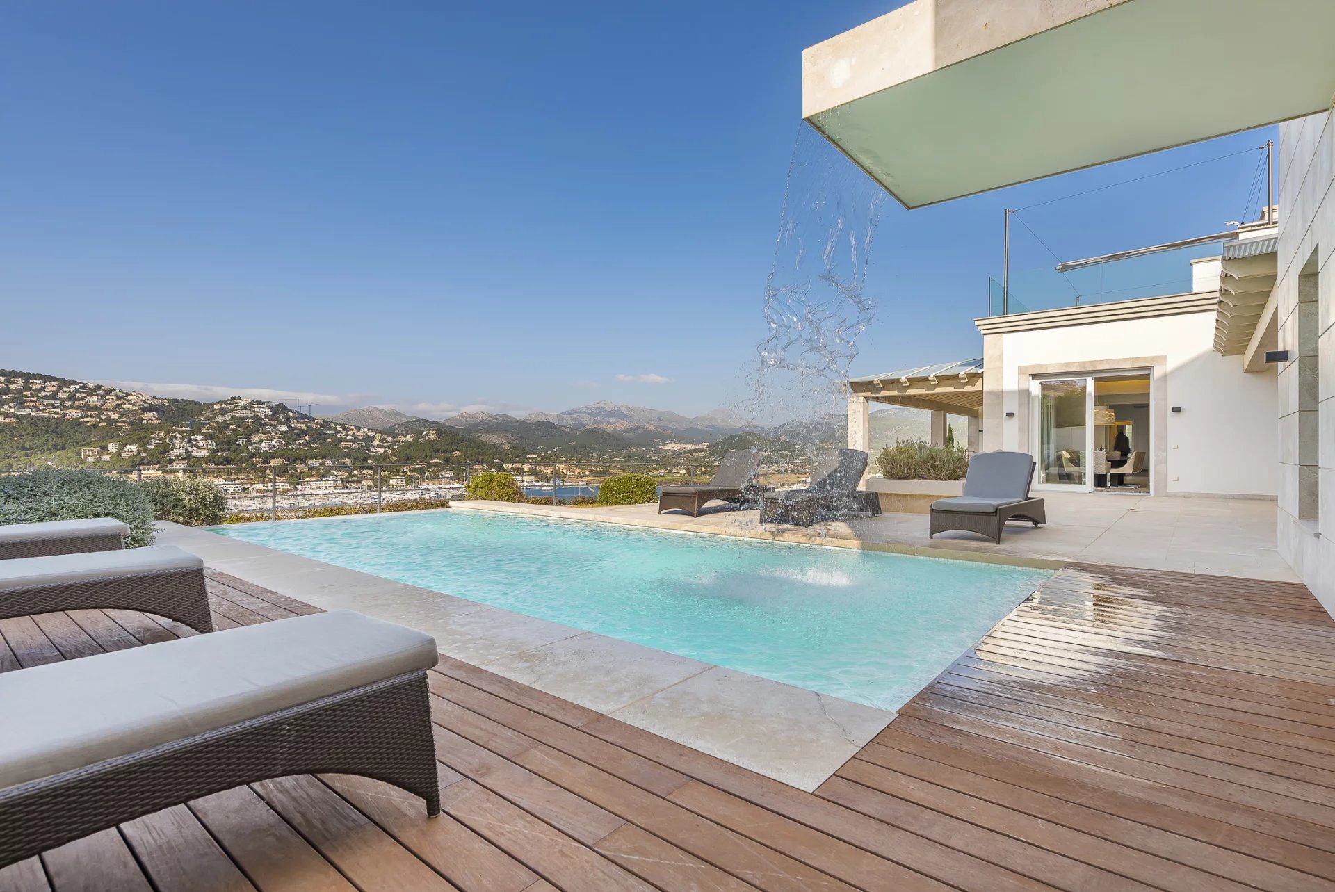 Роскошная вилла в лучшем месте. В этой недавно построенной вилле 5 спален с ванными комнатами распределены на 600 м2 жилой площади. Современная конструкция и дизайн пронизывают весь дом. Полностью оборудованная кухня открытой планировки не оставляет желать лучшего. Из спальни, уютной гостиной с камином или кухни открывается захватывающий вид на залив Пуэрто-де-Андраткс и гавань. Снаружи вы найдете бассейн с подогревом и зоной чил-аут, а также большой обеденный стол с барбекю. Особого внимания заслуживает собственная сауна, из которой открывается великолепный вид на море благодаря большому стеклянному фасаду. Захватывающие закаты здесь гарантированы.