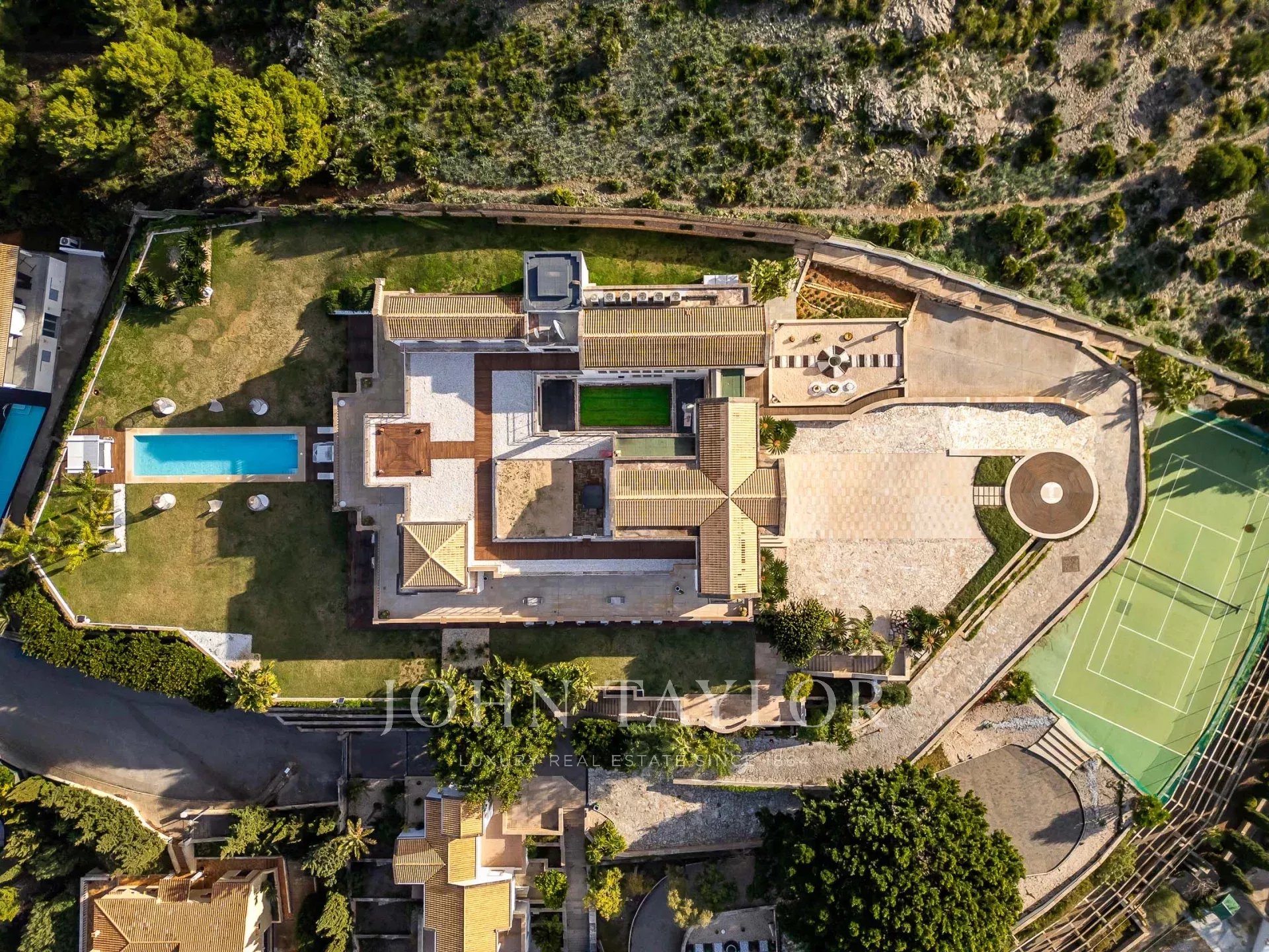 Снаружи дома расположены различные зоны для обедов на свежем воздухе и развлечений, рассчитанные как на большие, так и на малые компании, бассейн, ухоженные зрелые сады, теннисный корт, оранжерея и вертолетная площадка для прямого воздушного доступа к дому.