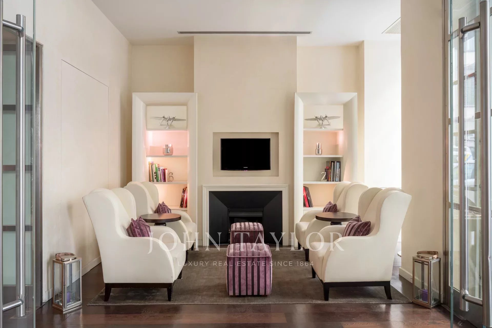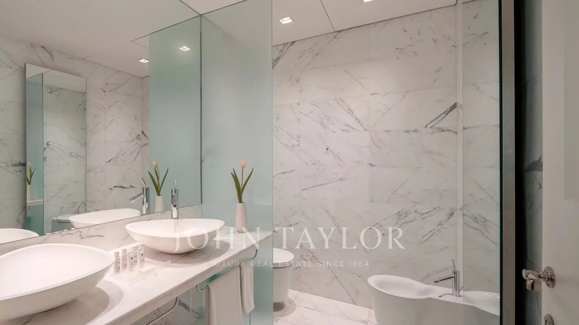Часть гостиной можно превратить во вторую спальню с диваном или кабинет, полностью отделенный от остальной части квартиры, благодаря элегантным раздвижным дверям, обеспечивающим максимальную приватность.