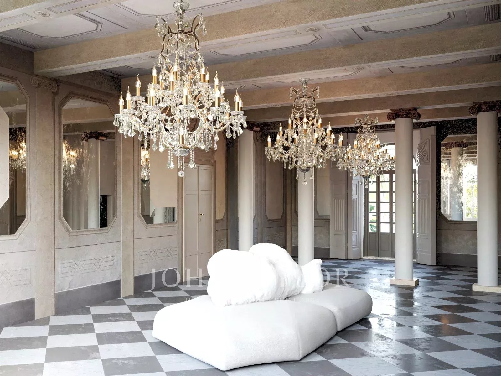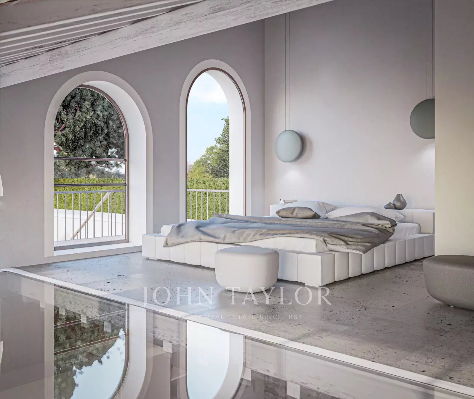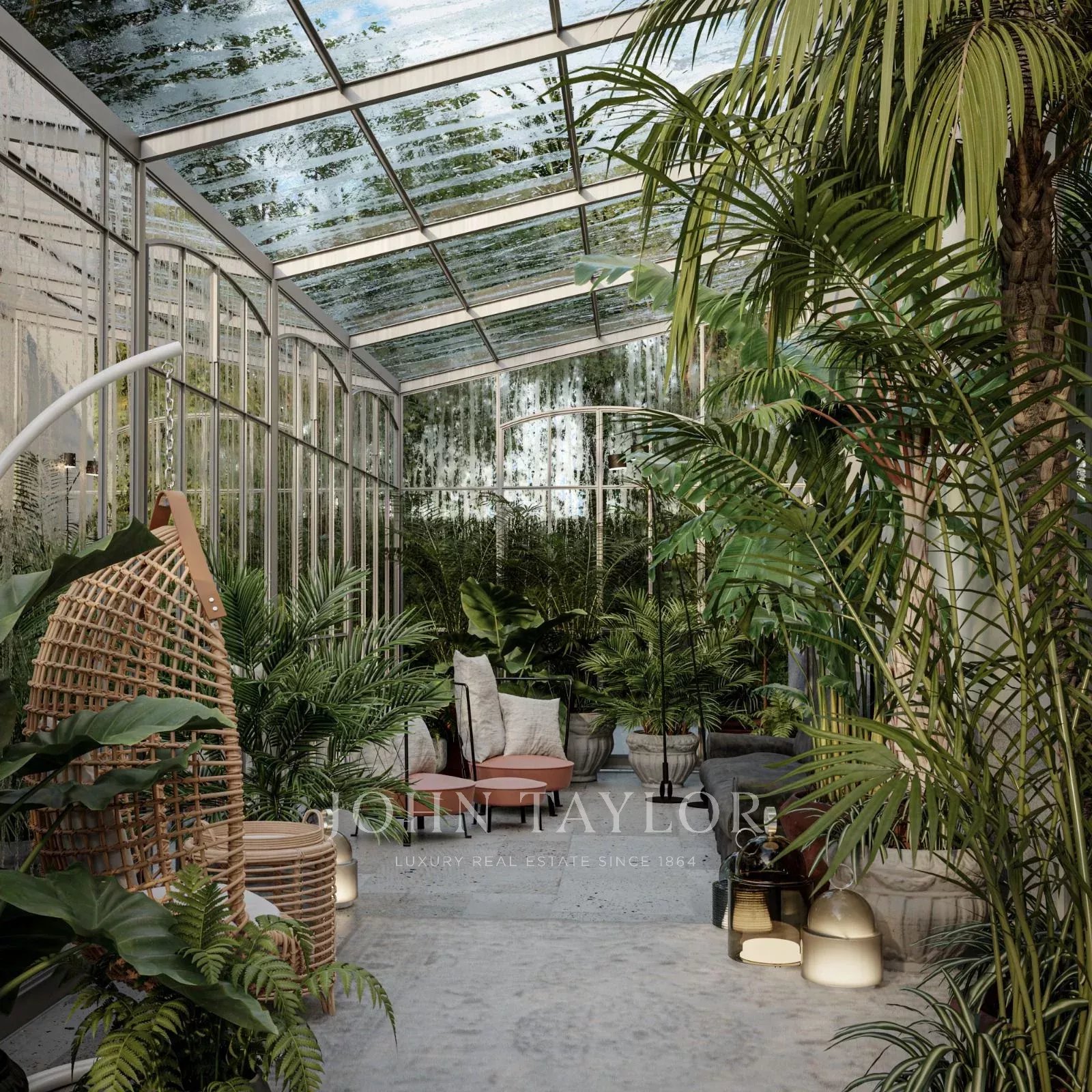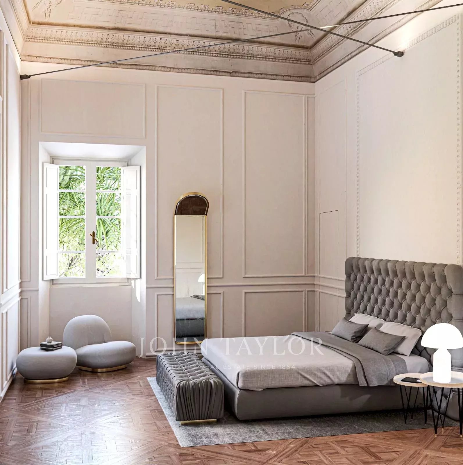 На первом этаже находится большой центральный холл, кабинет, кухня, спальня с ванной комнатой и прекрасная оранжерея. На втором этаже находится просторный центральный холл с романтическим балконом, выходящим на парк, и 5 спален с двуспальными кроватями, 2 из которых имеют ванные комнаты. На втором этаже находится еще одна просторная центральная зона, 5 спален с двуспальными кроватями и 2 ванные комнаты. Мансардный этаж завершает основную виллу с большой открытой гостиной, служебной кухней, 3 спальнями с двуспальными кроватями и 2 ванными комнатами.